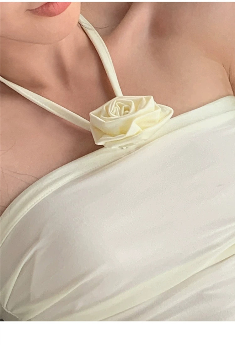 新款小香风立体山茶花纯色三角连体显瘦抹胸简约沙滩度假泳衣女