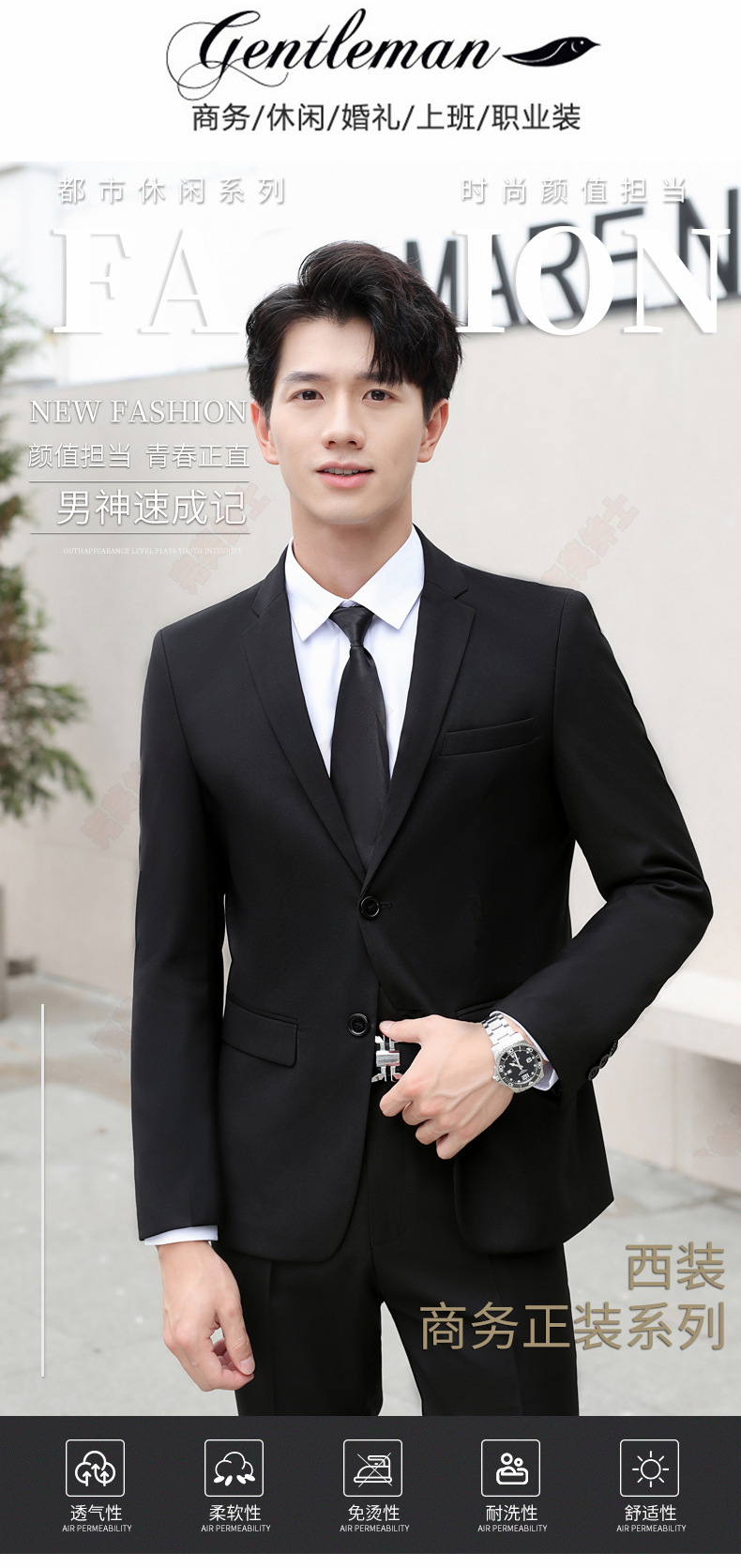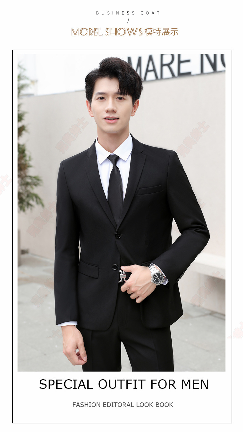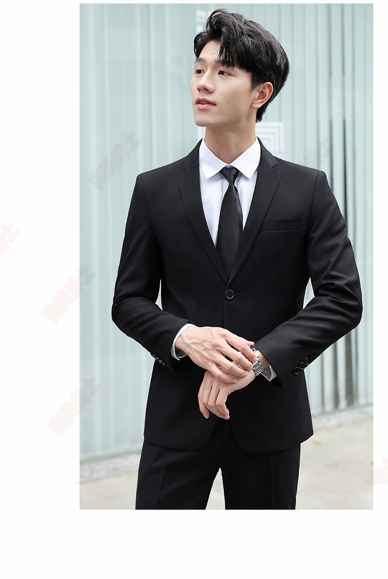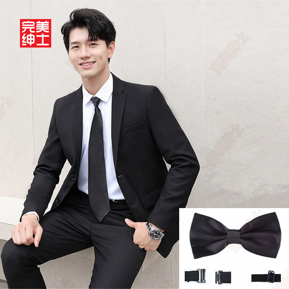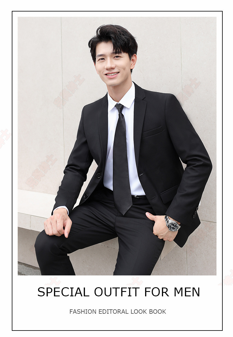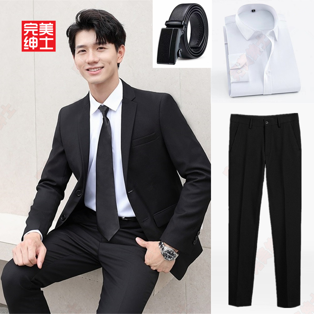 • 검은색 양복 + 검은색 바지 + 흰색 셔츠 + 벨트