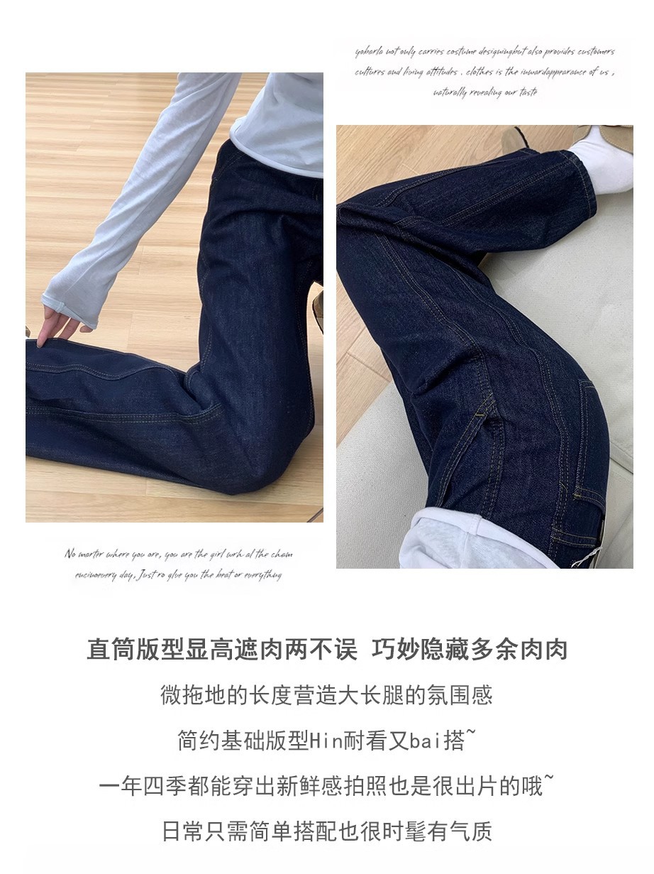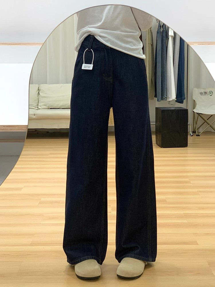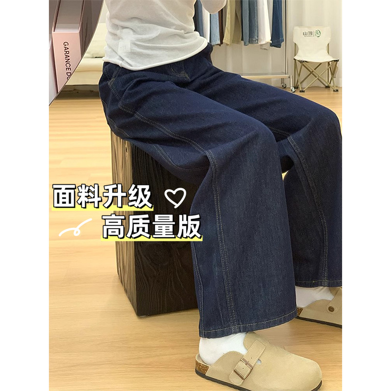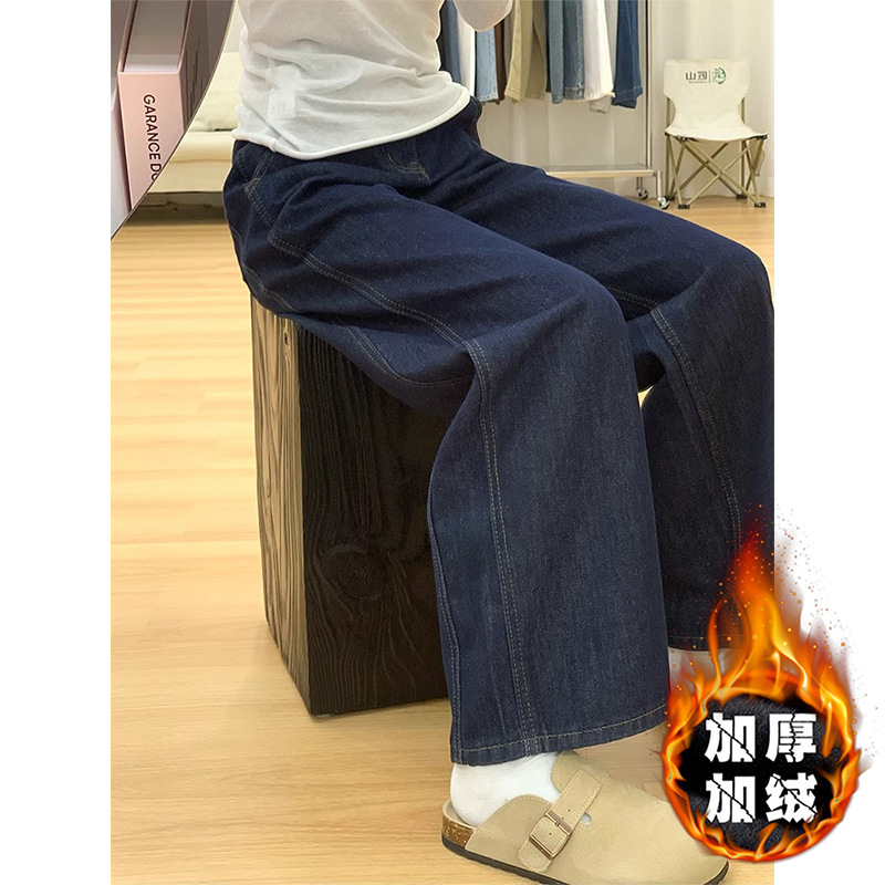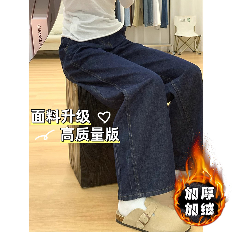플러스 사이즈 기모 다크 블루 넓은 다리 청바지 여자 2024 가을 및 겨울 높은 허리 통통녀 느슨한 레트로 올매치 스트레이트 바지스토어 가기