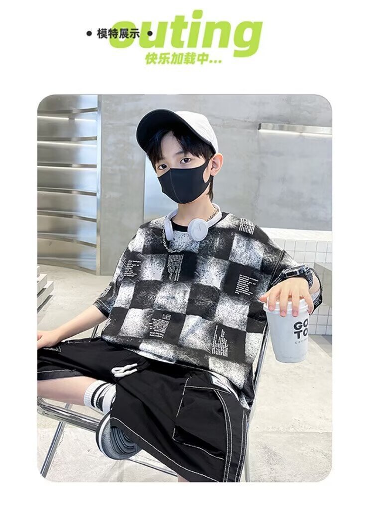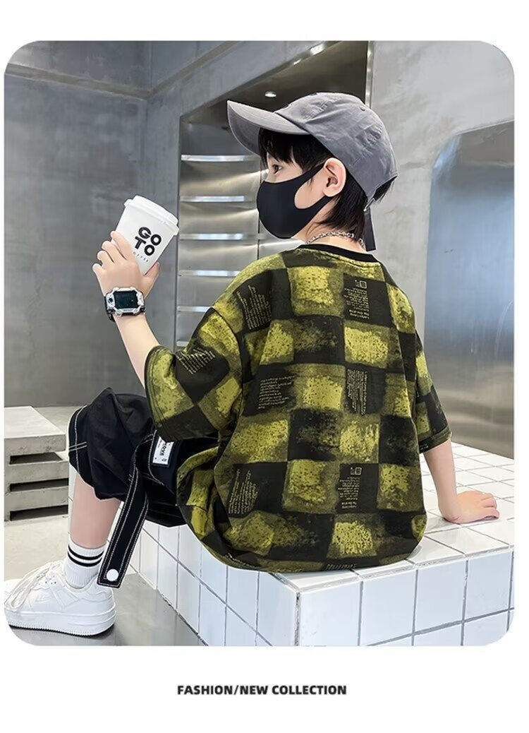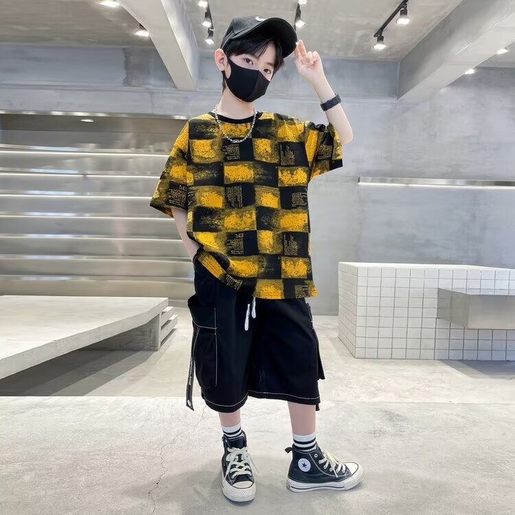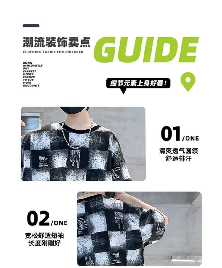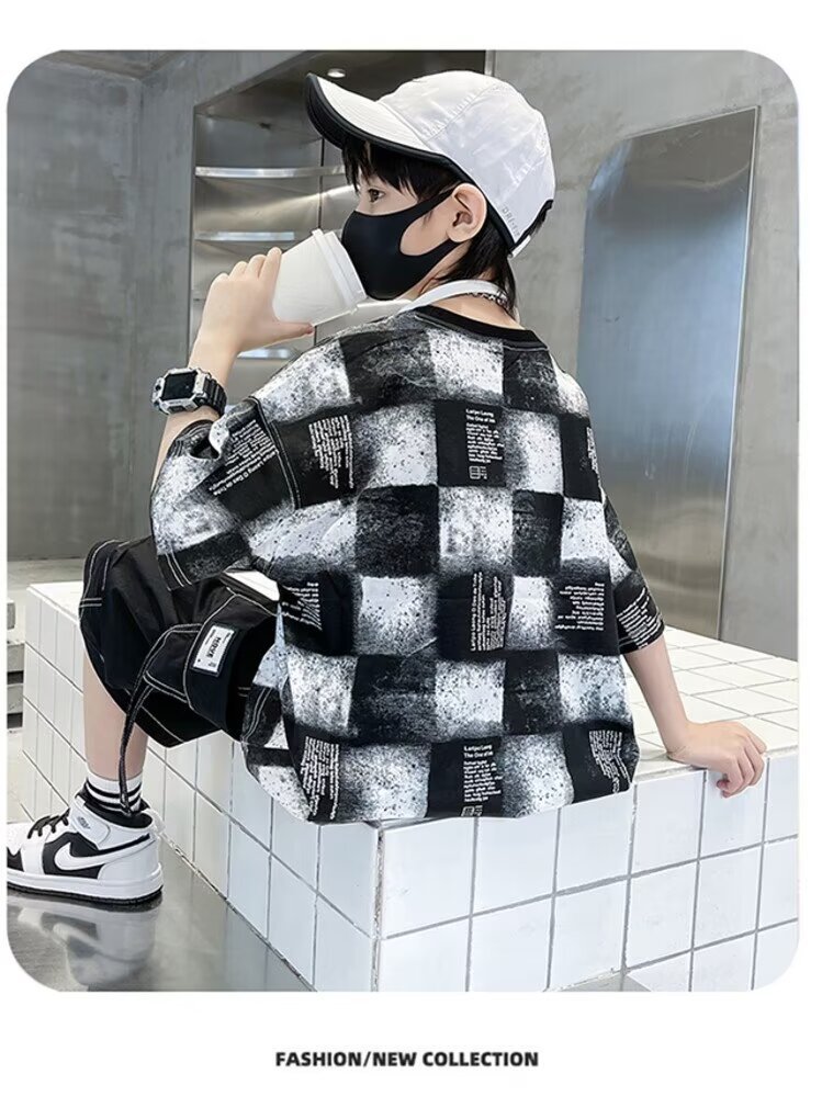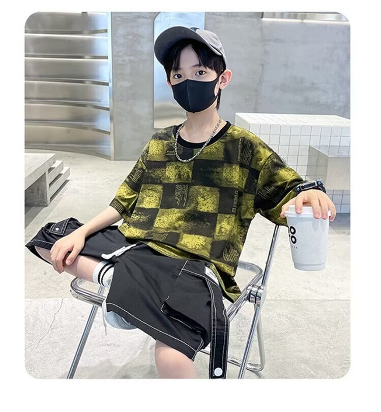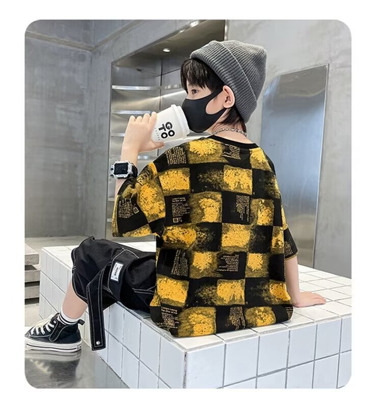 남자들의 여름 반소매 2024 잘 생긴 아동복 풀 프린트 만화 티슬리브 반소매 중견과 큰 어린이 거리 패션스토어 가기