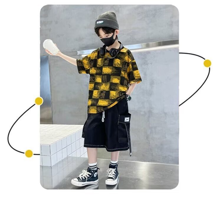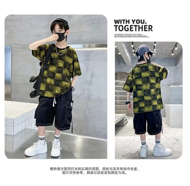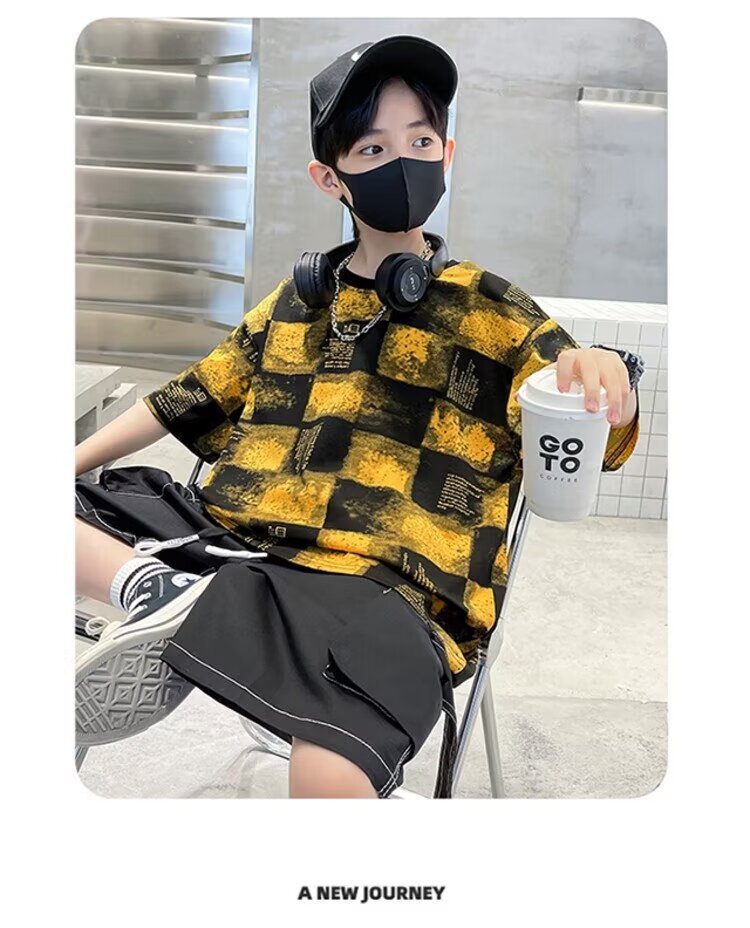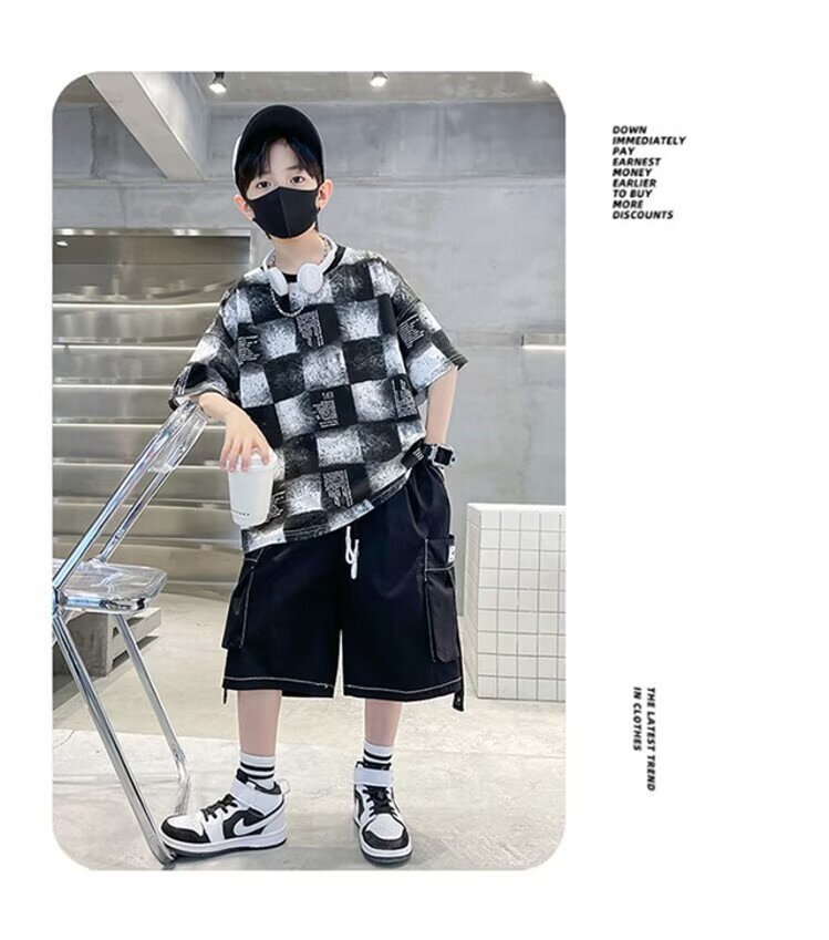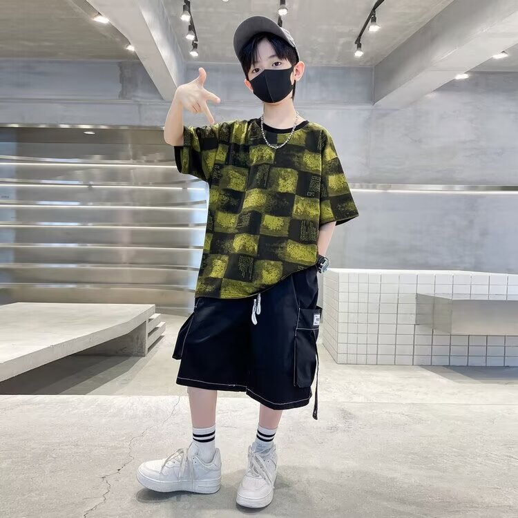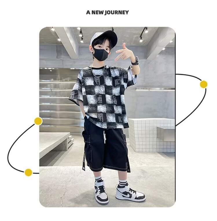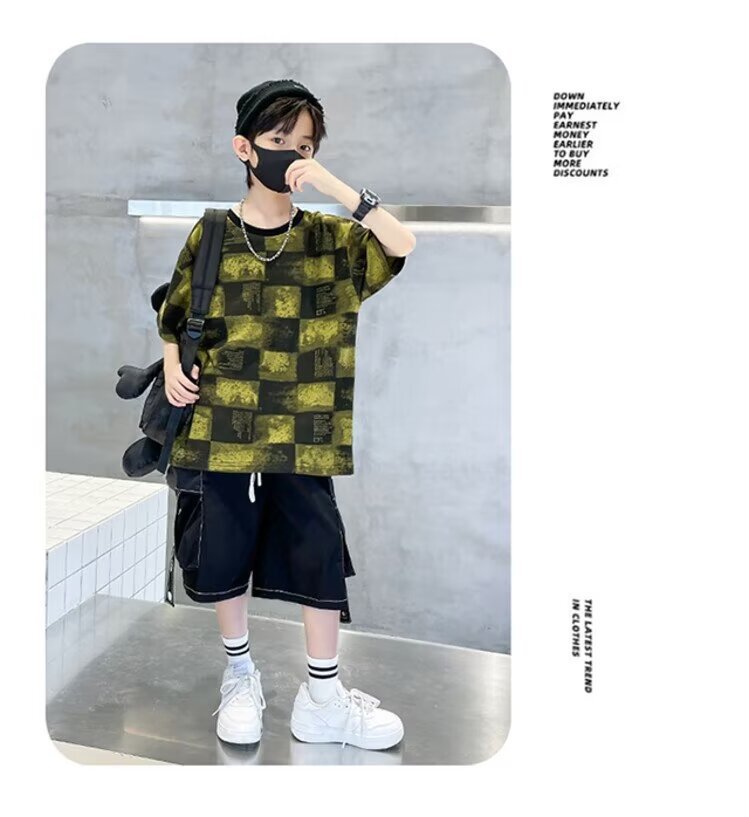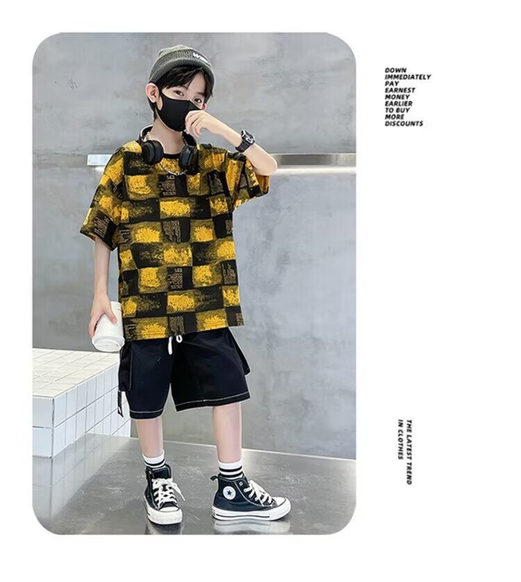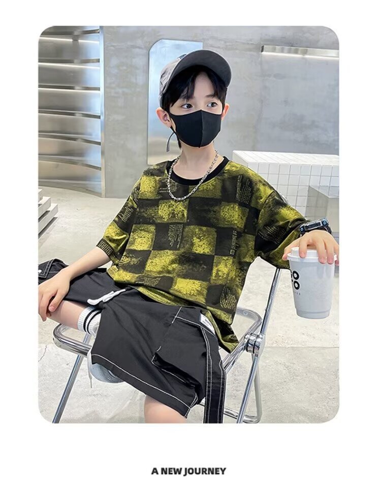 남자들의 여름 반소매 2024 잘 생긴 아동복 풀 프린트 만화 티슬리브 반소매 중견과 큰 어린이 거리 패션스토어 가기