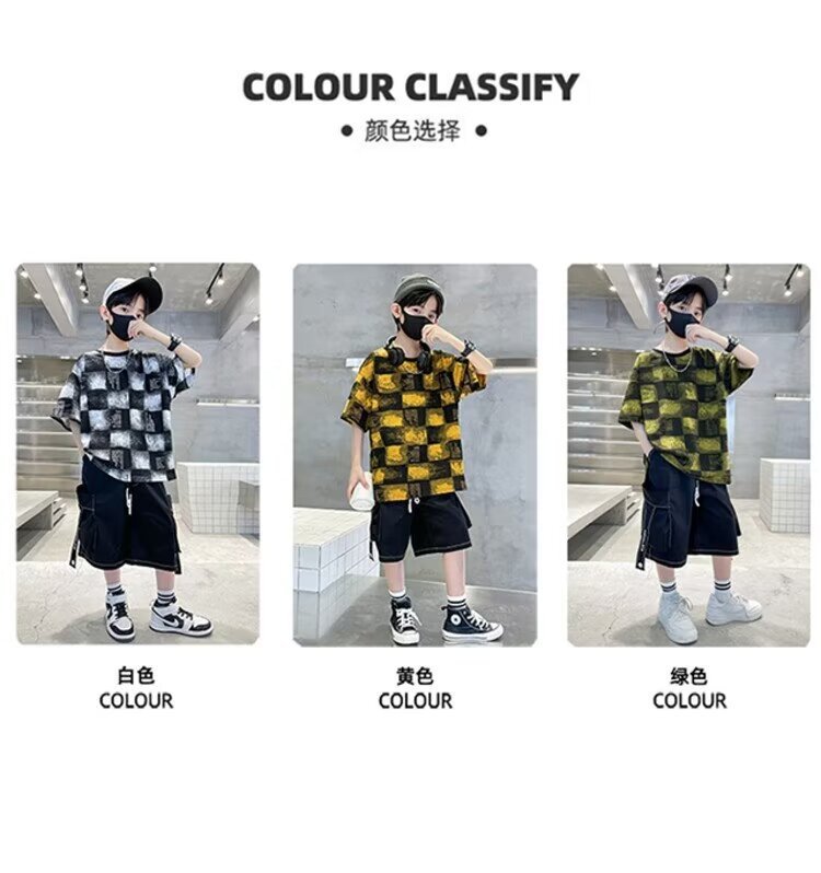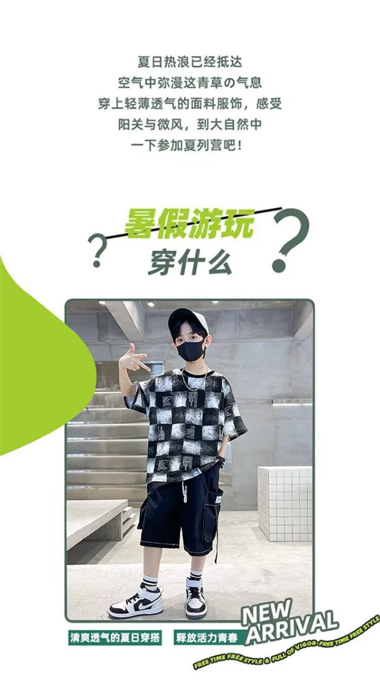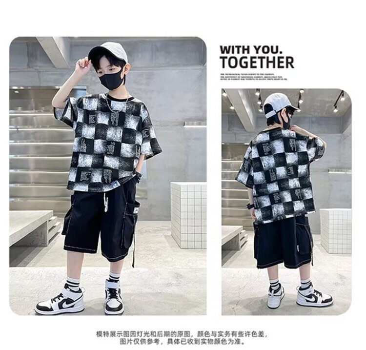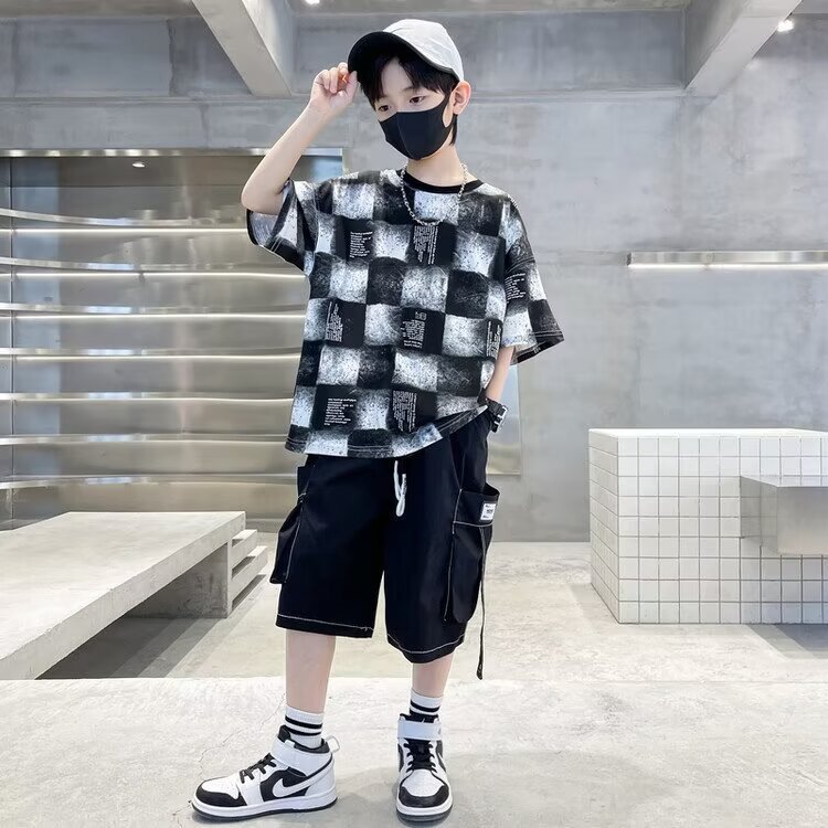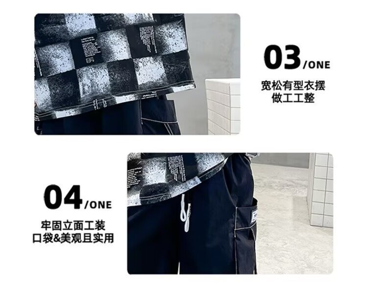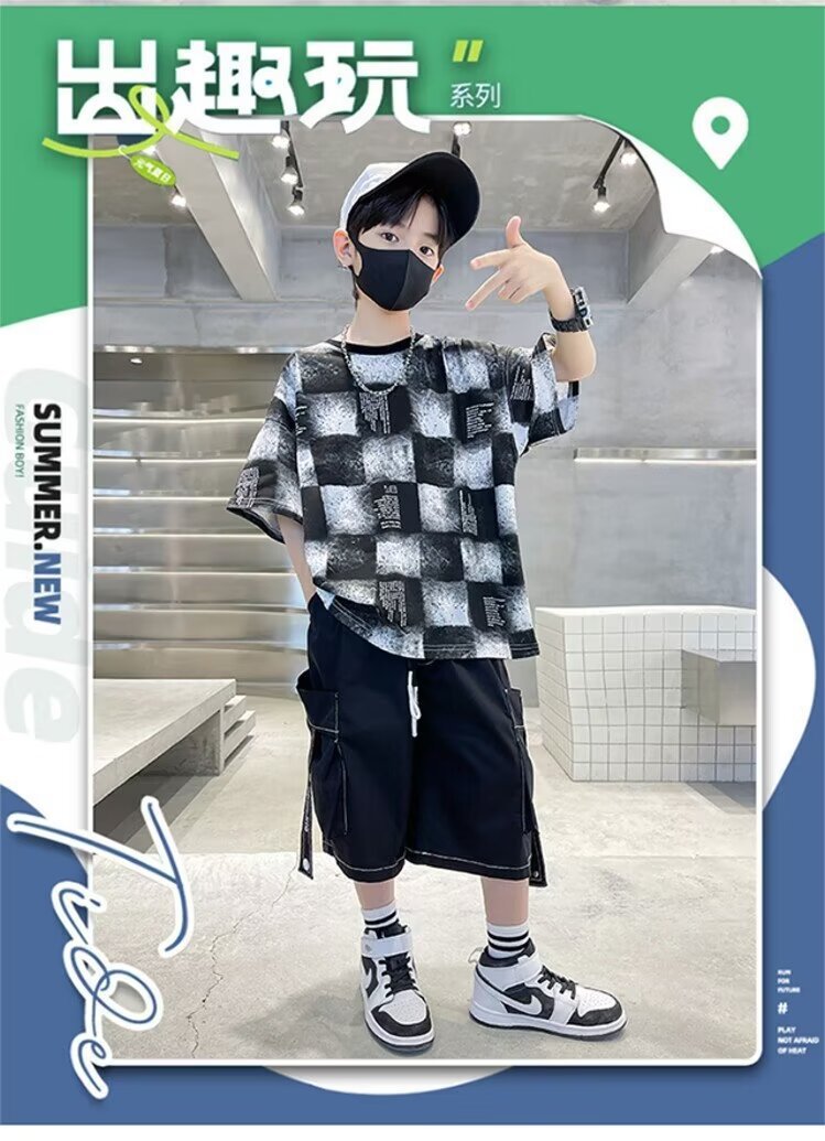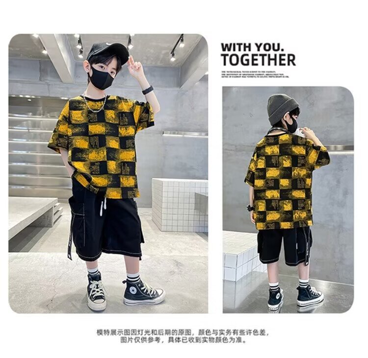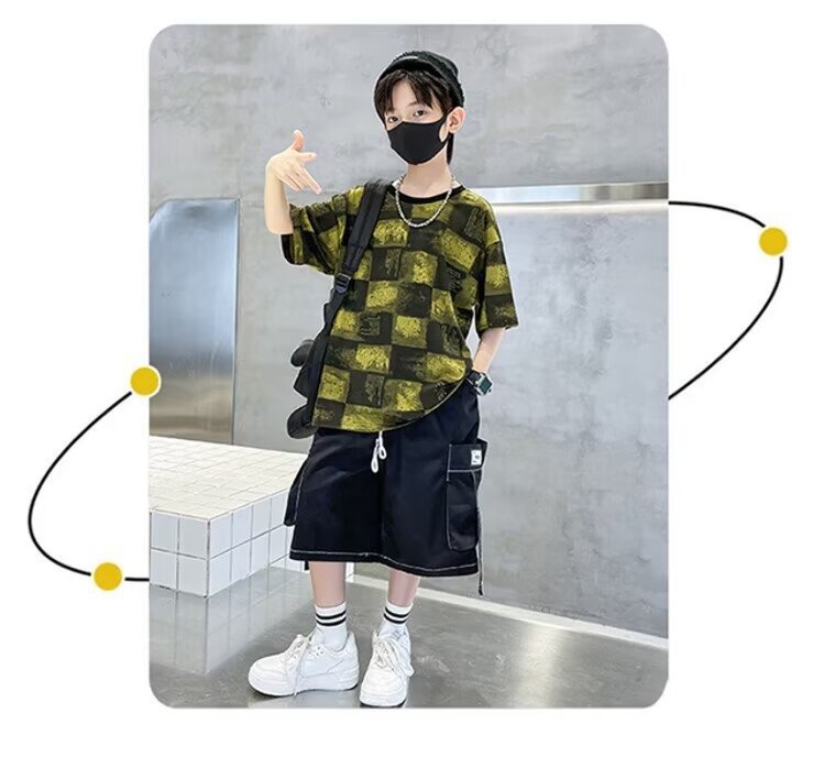 남자들의 여름 반소매 2024 잘 생긴 아동복 풀 프린트 만화 티슬리브 반소매 중견과 큰 어린이 거리 패션스토어 가기