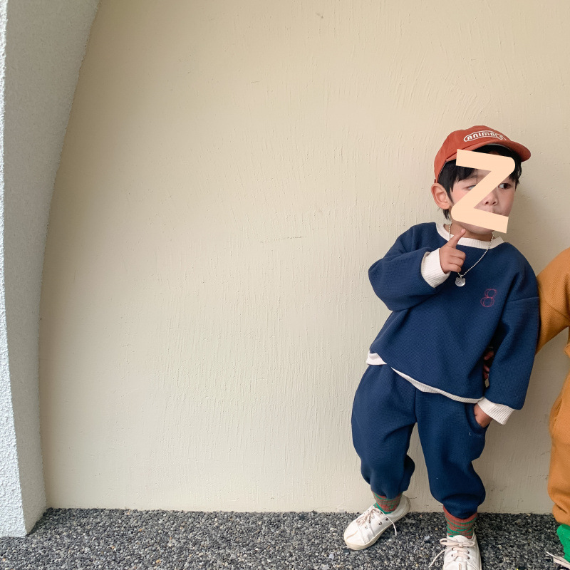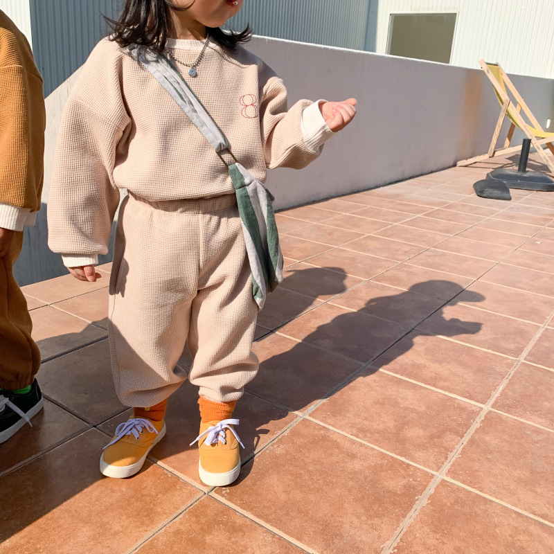 남학생과 여학생을위한 2025 세트 어린이 컬러 매칭 와플 스포츠 스웨터 단색 레저 투피스 봄 새로운 스타일스토어 가기