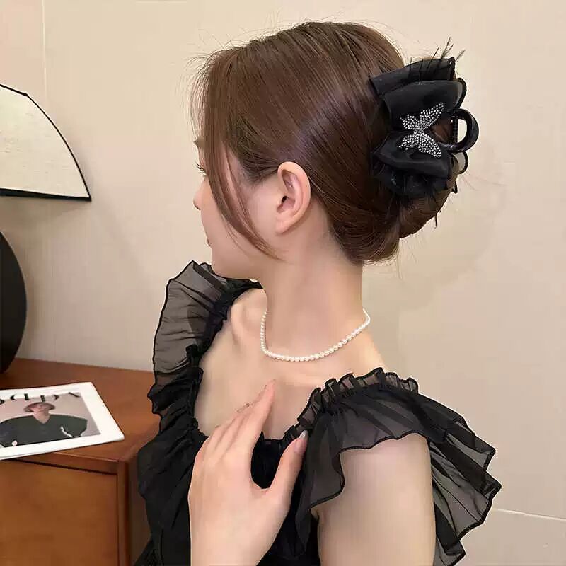 气质感羽毛黑色蝴蝶结抓夹女泡泡云朵发夹后脑勺大号鲨鱼夹