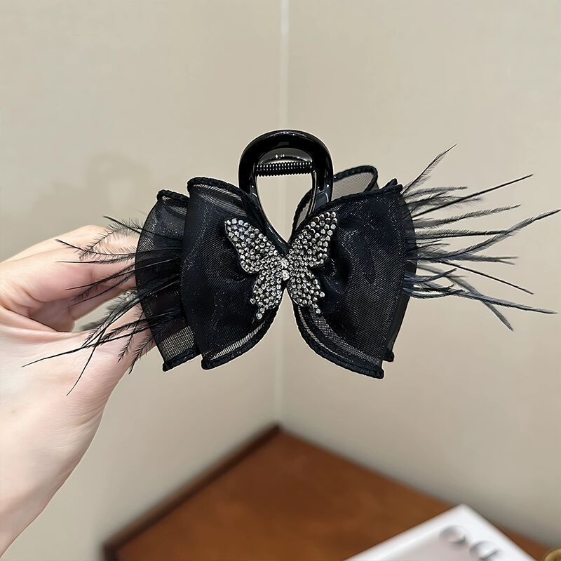 2024新款蝴蝶结黑色羽毛抓夹女后脑勺秋冬高级感鲨鱼夹毛毛发夹