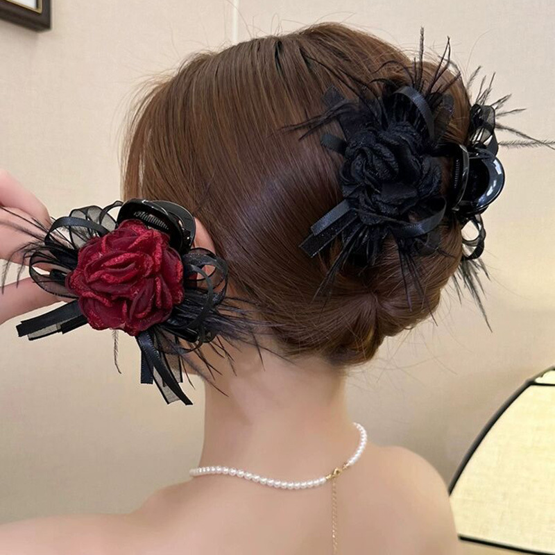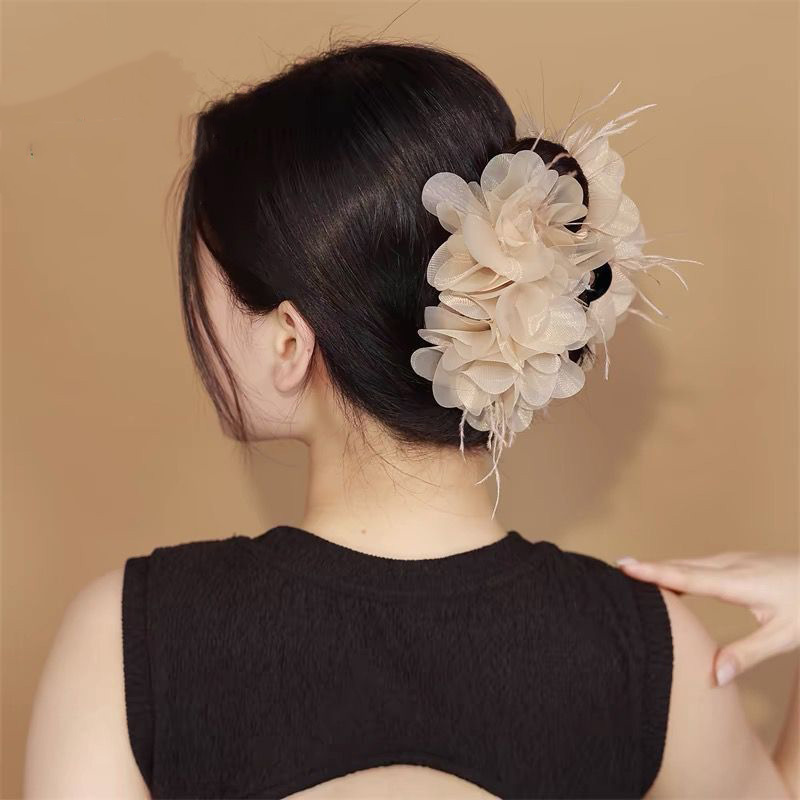 牡丹花羽毛流苏抓夹2024新款发夹后脑勺显发量蓬松高颅顶鲨鱼夹