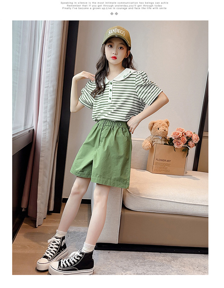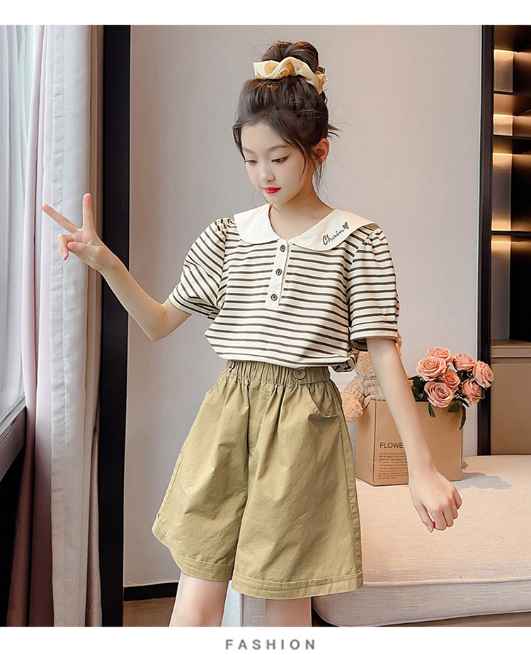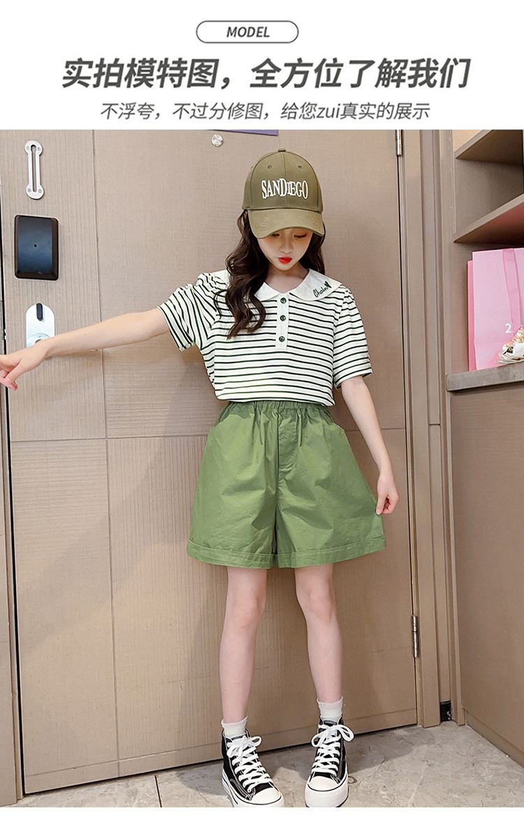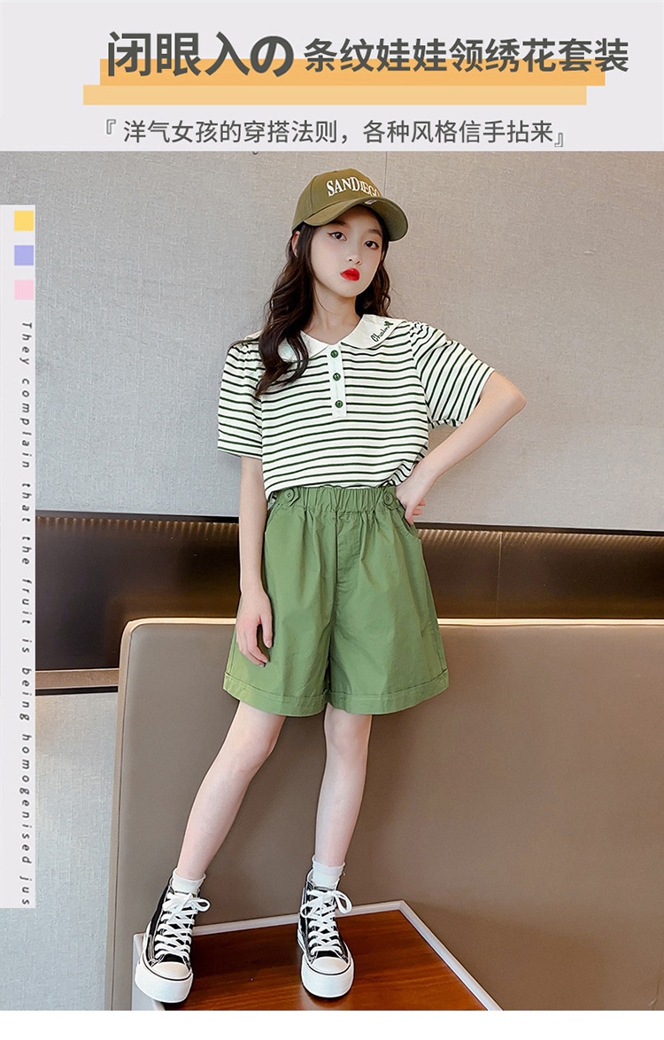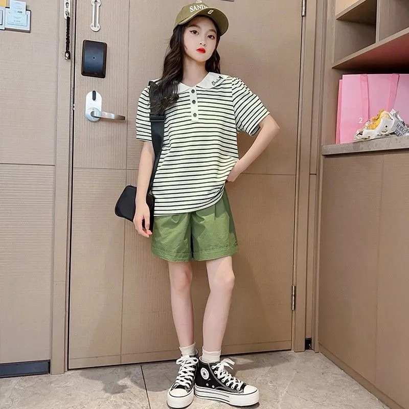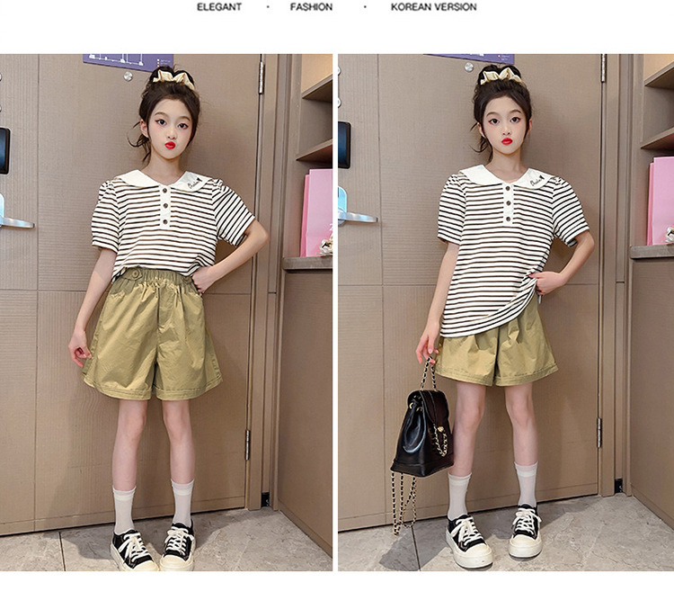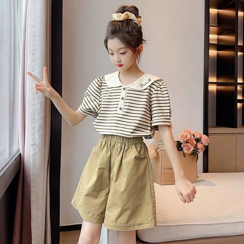 소녀 여름 세트 2024 새로운 한국 스타일 서양식 어린이 짧은 소매 소녀 중 큰 어린이 여름 원피스 줄무늬 투피스 세트
