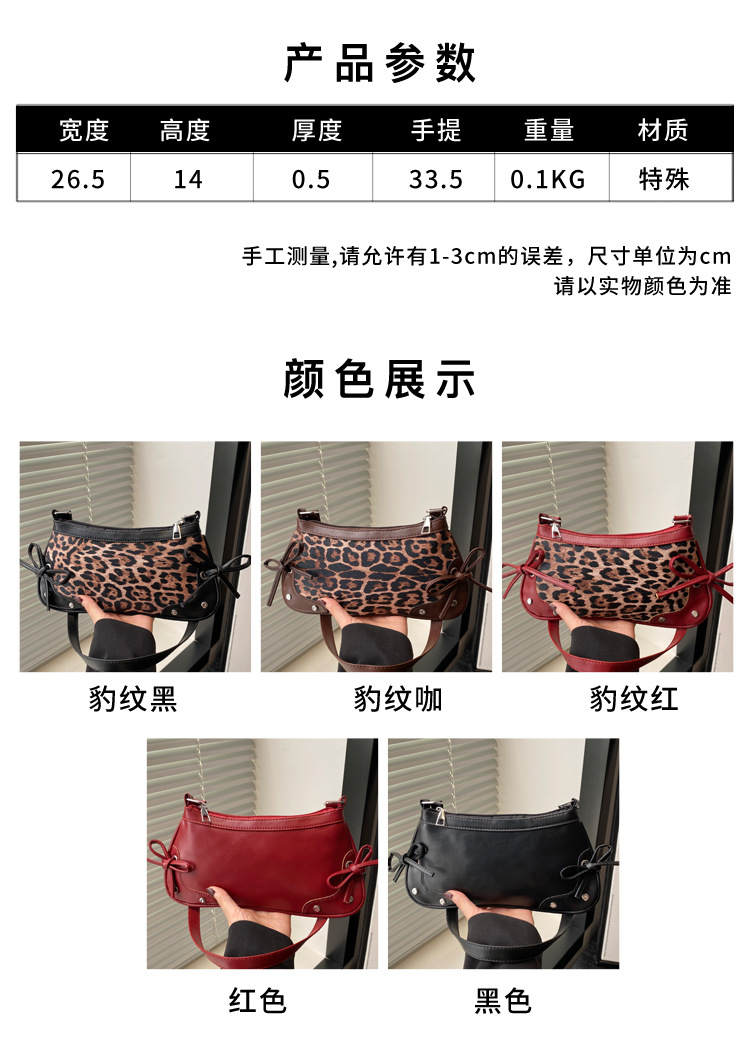 겨드랑이 여성 가방 2025 새로운 유행 패션 레오파드 인쇄 복고풍 어깨 가방 주름 Bowknot 유럽 맞춤형 Crossbody 가방