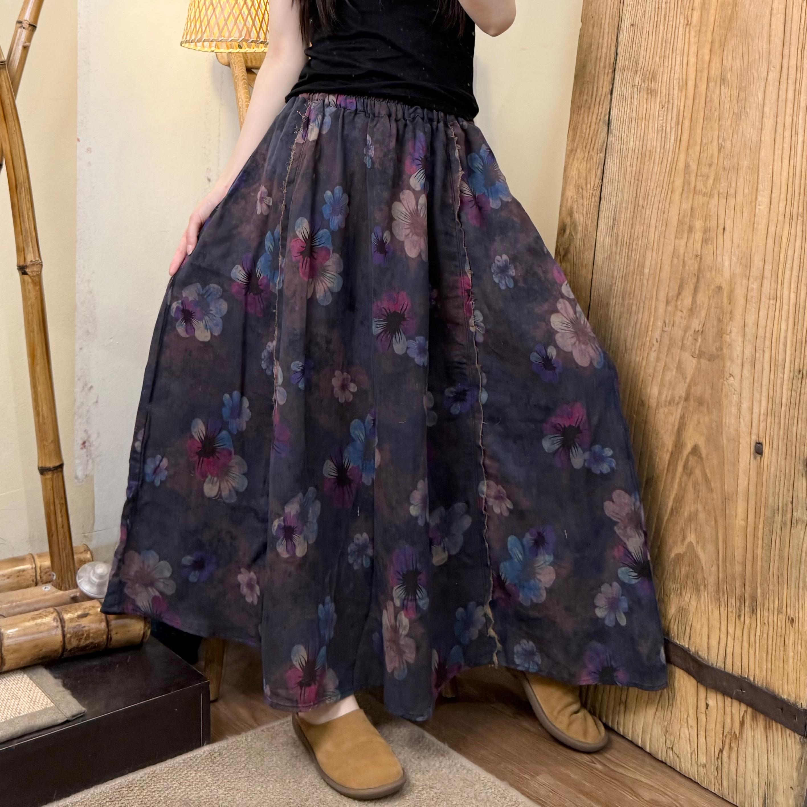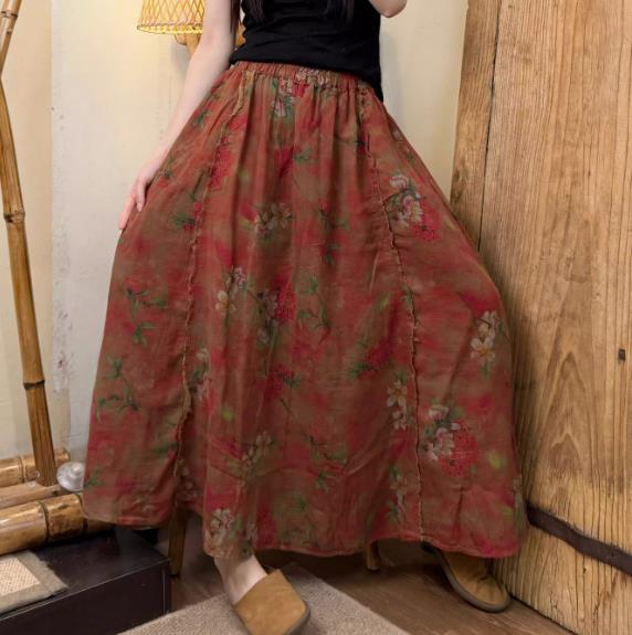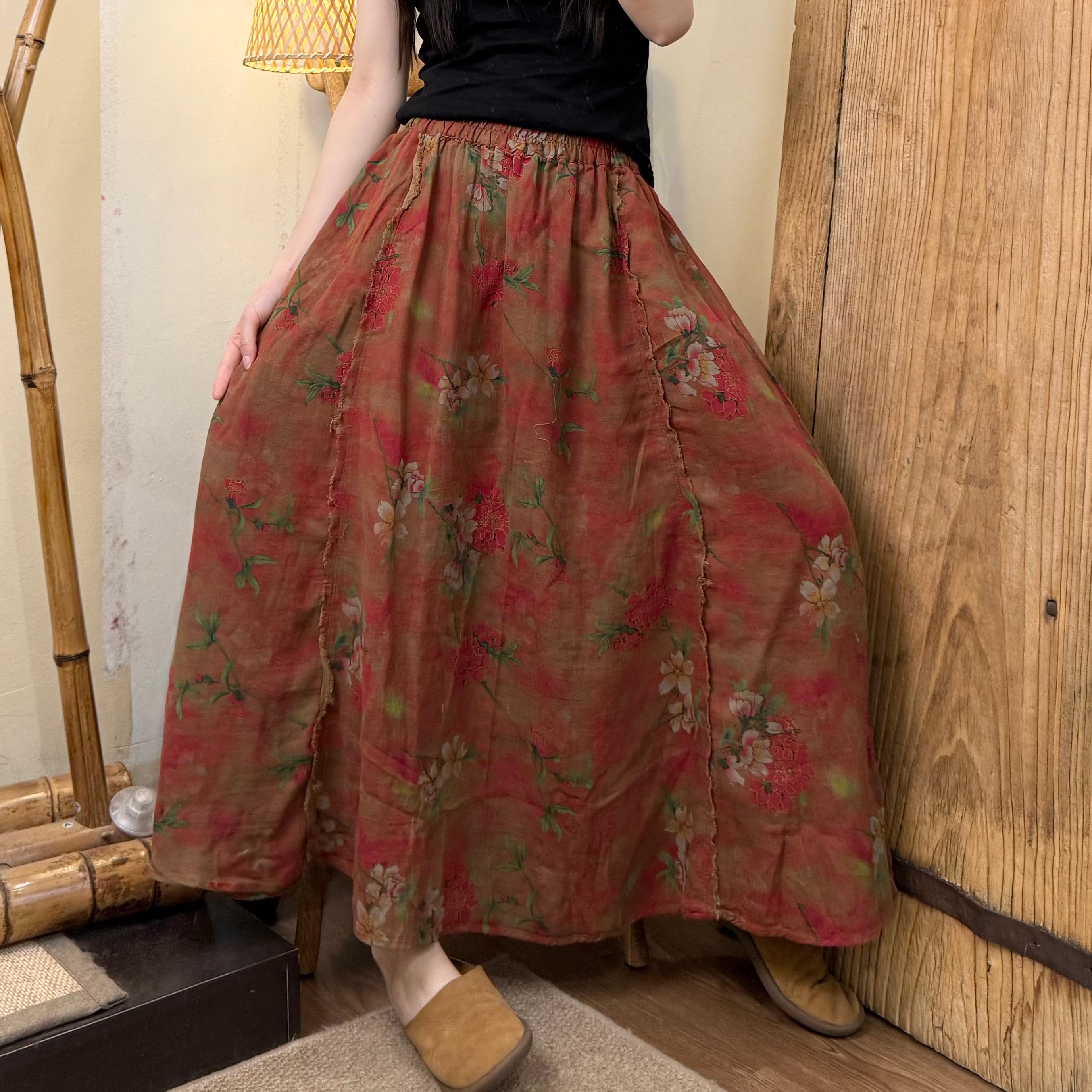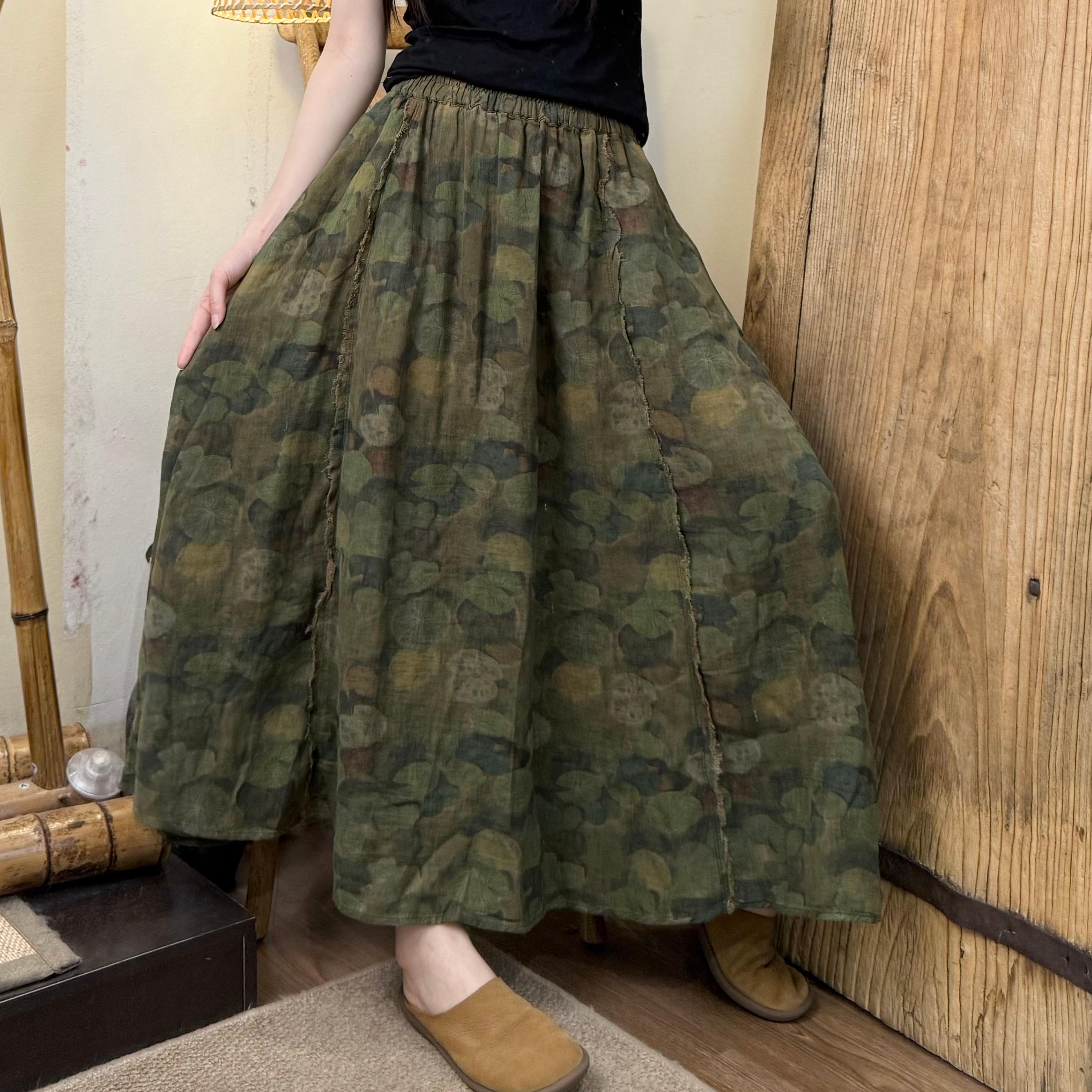 2025 여름 새로운 스타일 레트로 캐주얼 올 매치 예술적 간단한 디지털 인쇄 녹 코튼 원사 단일 레이어 스커트스토어 가기