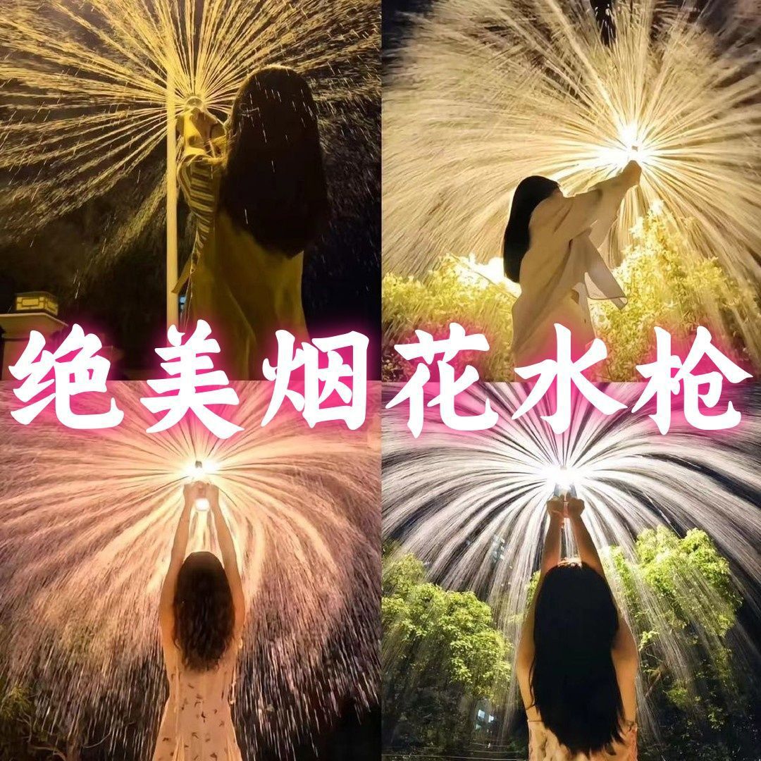 좋아하는 사람들과 불꽃 놀이와 물총을 재생합니다. 부부는 물 불꽃 놀이의 분위기를 기념하기 위해 가로등 아래에서 사진을 찍습니다. 로맨틱 워터 스프레이 소품스토어 가기