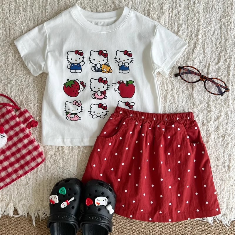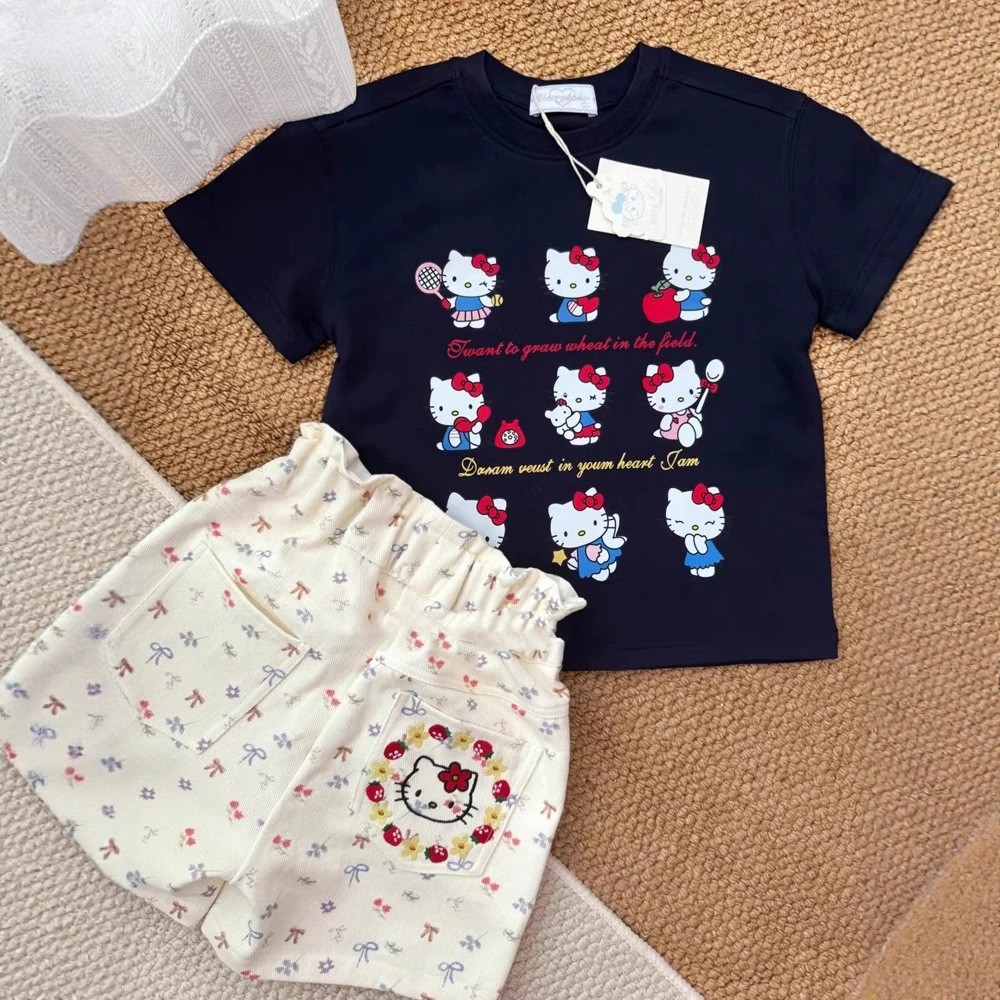 여자 여름 세트 2025 새로운 달콤한 꽃 KT 자수 반바지 아기면 승무원 짧은 소매 티셔츠스토어 가기
