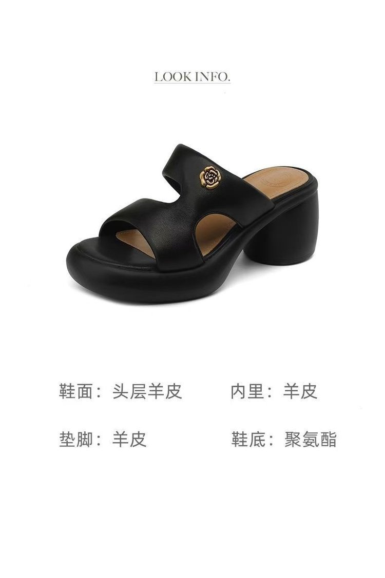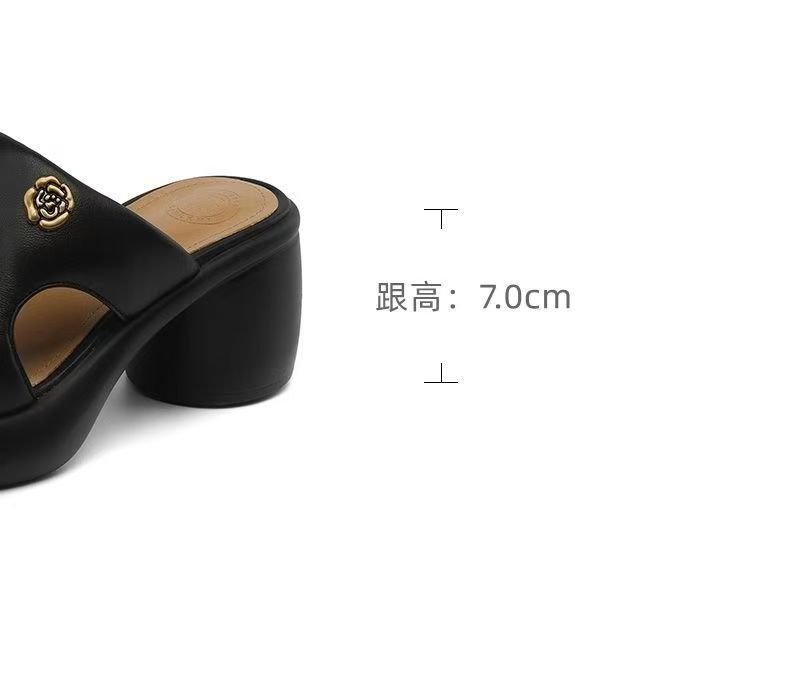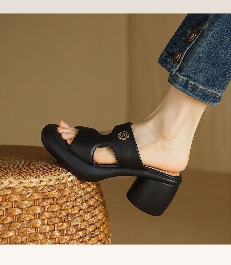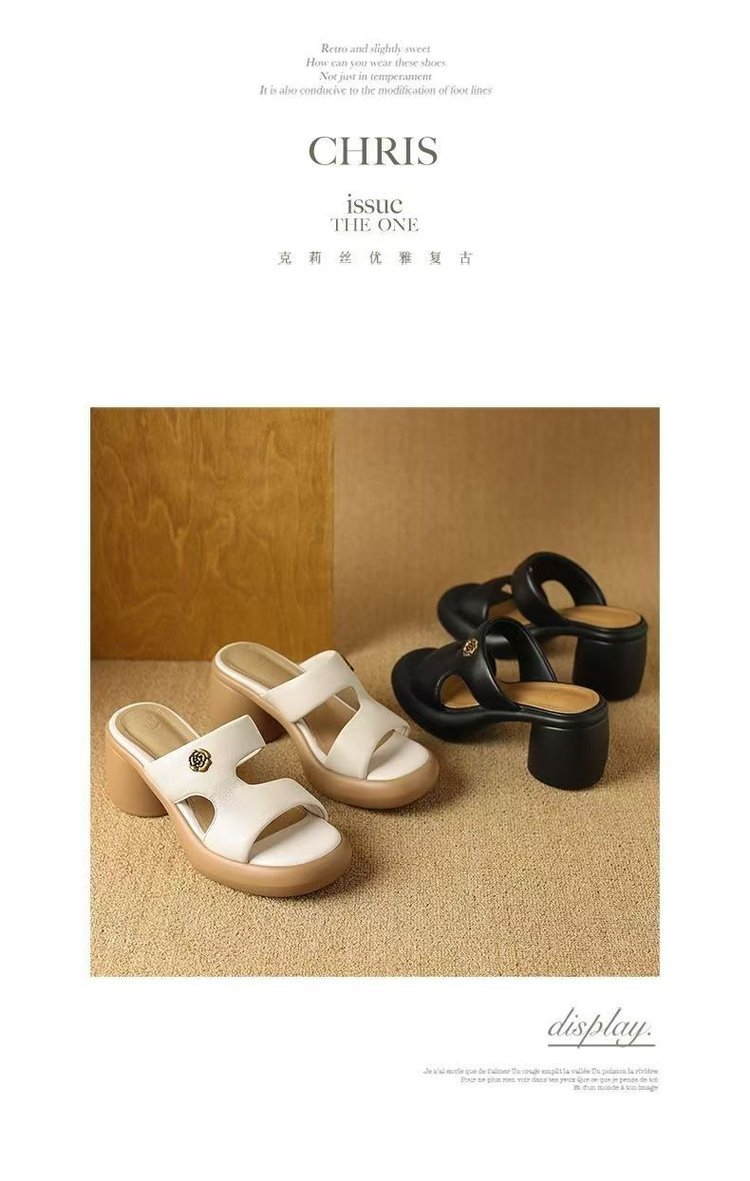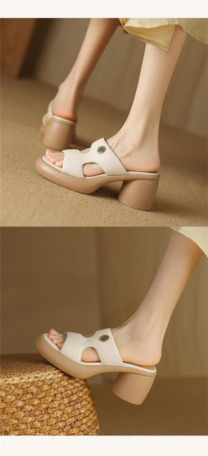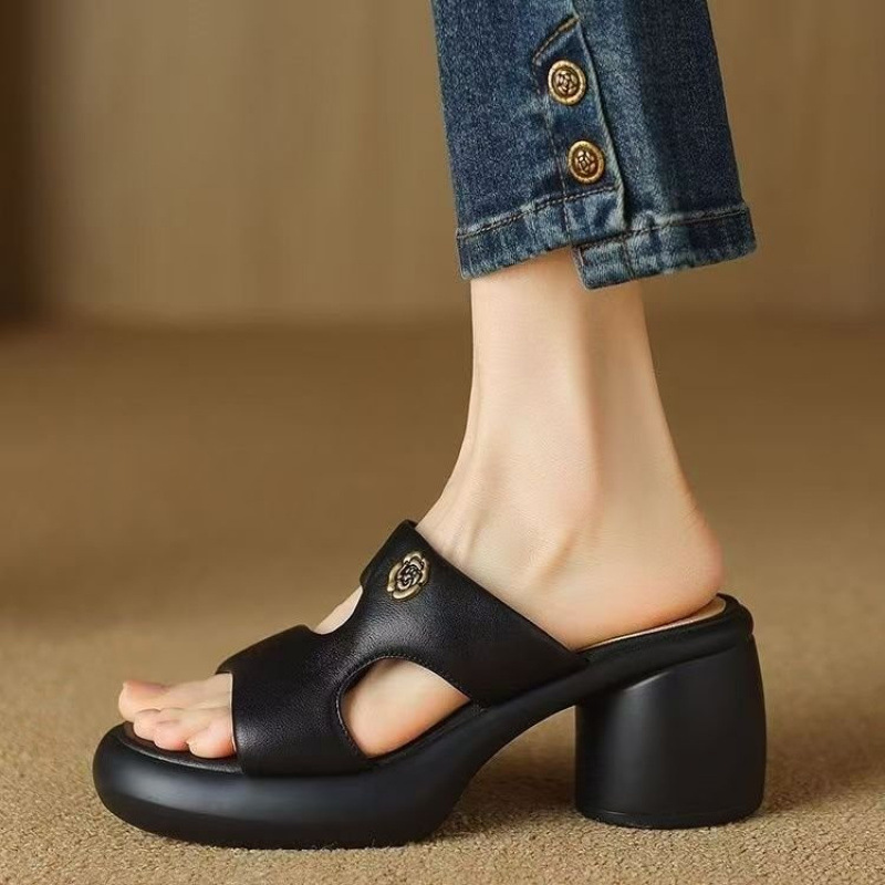 2025 여름 부드러운 가죽 프렌치 두꺼운 굽 두꺼운 밑창 샌들 도매 겉옷 패션 하이힐 오픈 발가락 슬리퍼 크로스 보더스토어 가기