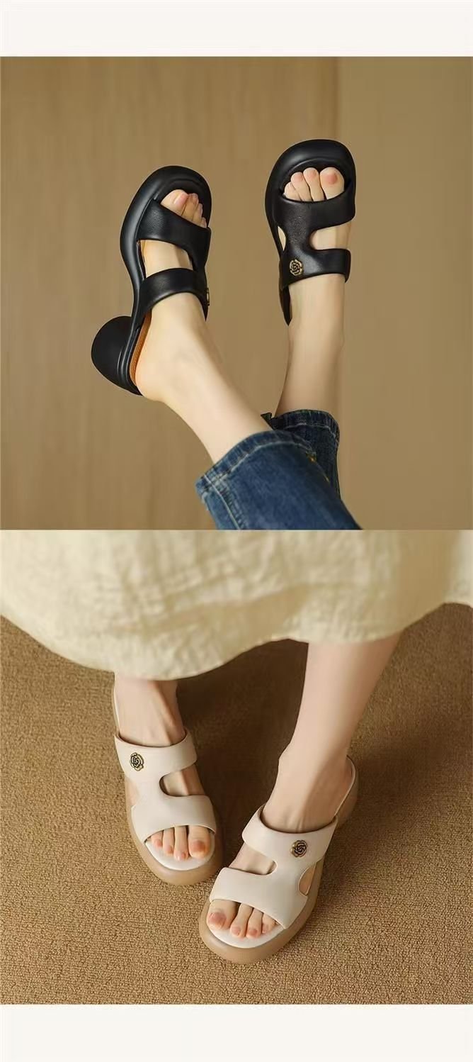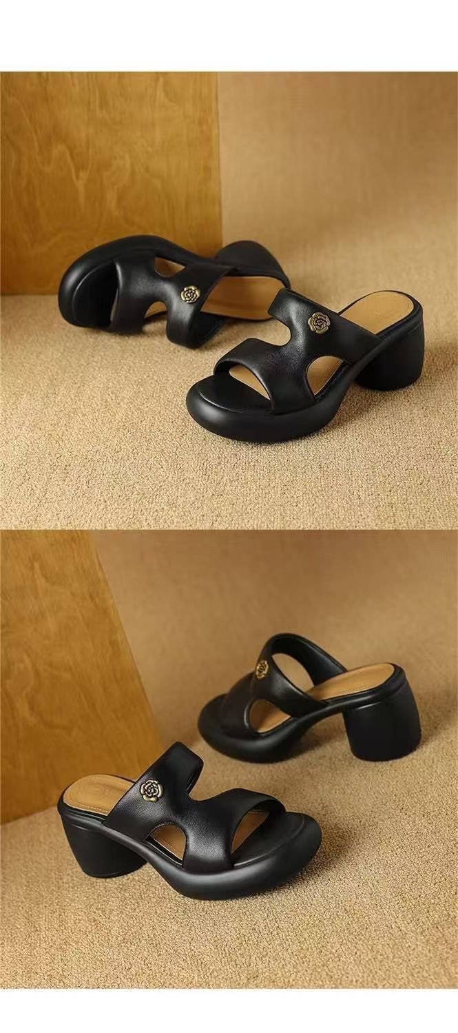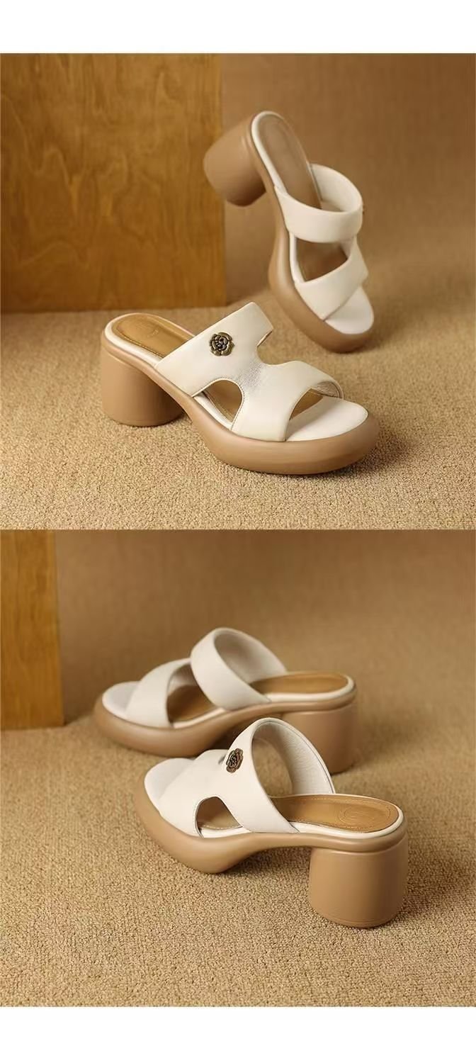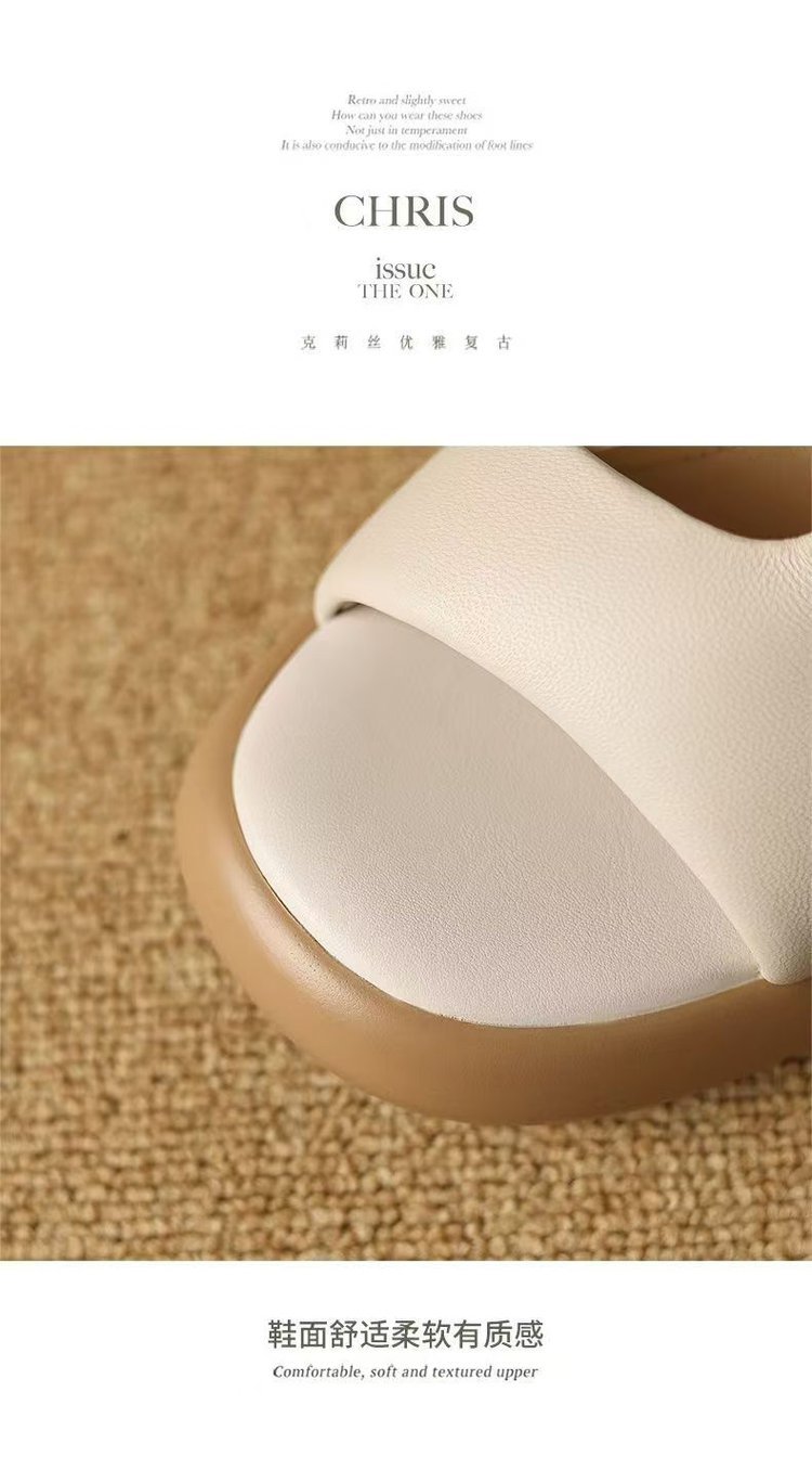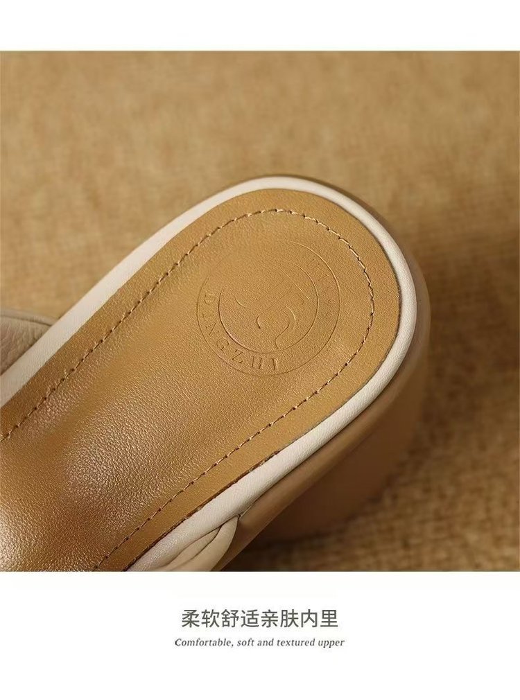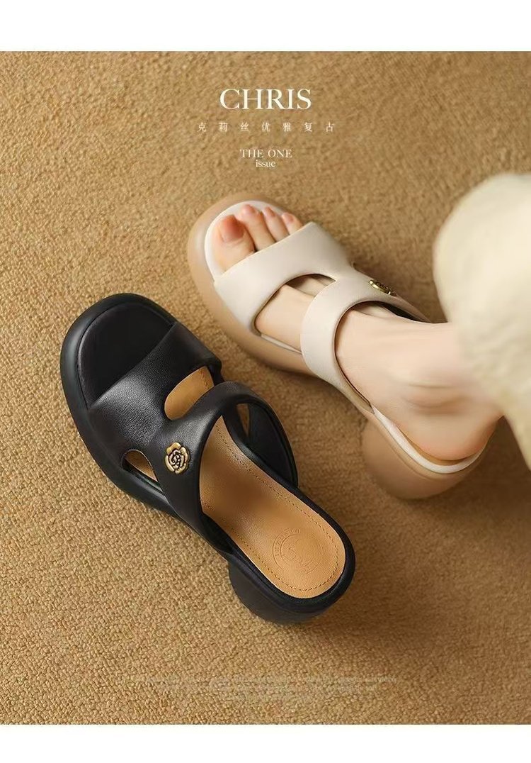 2025 여름 부드러운 가죽 프렌치 두꺼운 굽 두꺼운 밑창 샌들 도매 겉옷 패션 하이힐 오픈 발가락 슬리퍼 크로스 보더
