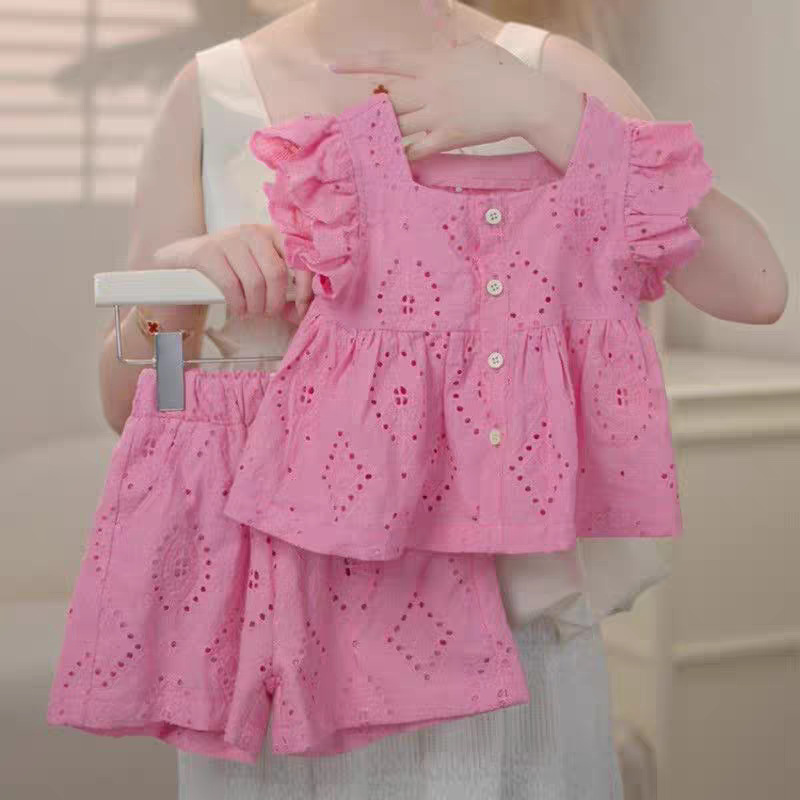 여자 여름 새로운 민소매 핑크 코튼 작은 플라잉 슬리브 탑 정장 핑크 레이디 스타일 투피스 세트 서양식스토어 가기