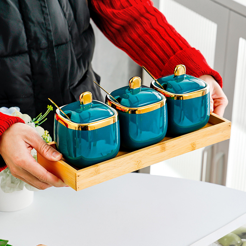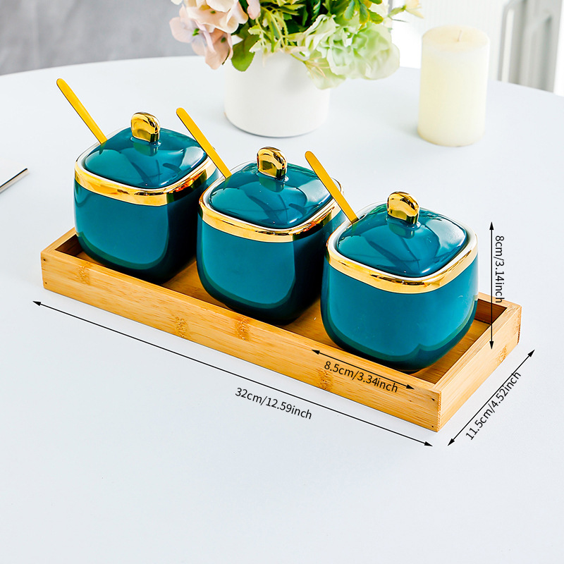 • 짙은 녹색 사각 세라믹 [3] 항아리 - 프리 스푼 + 나무 트레이