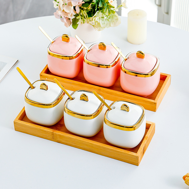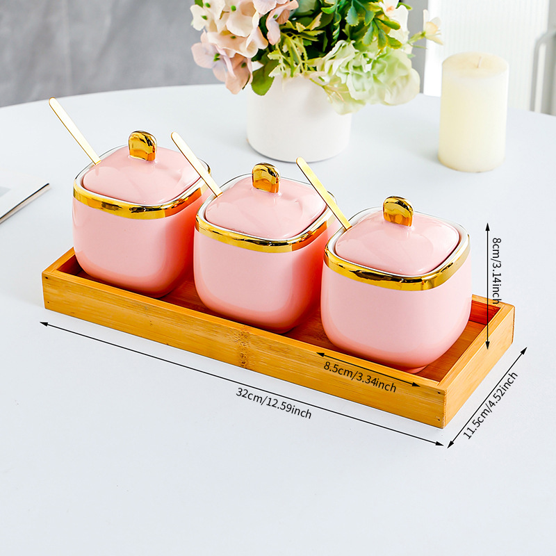 • 흰색 사각형 세라믹 [3] 항아리 - 무료 스푼 + 나무 트레이