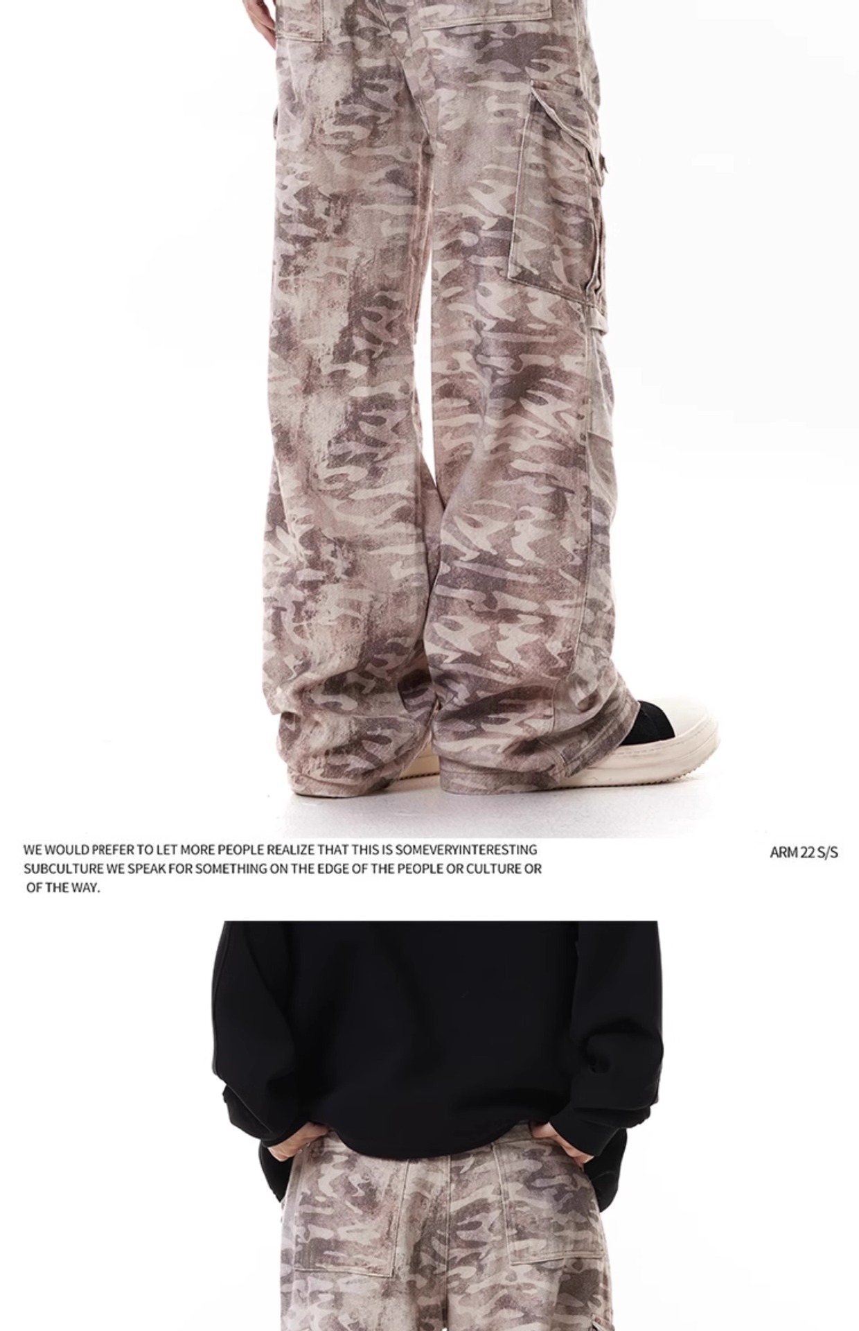 2024 새로운 레트로 은퇴 한 위장 잡힌 바지 남성용 루즈 스트레이트 아메리칸 멀티 포켓 와이드 레그 캐주얼 바지