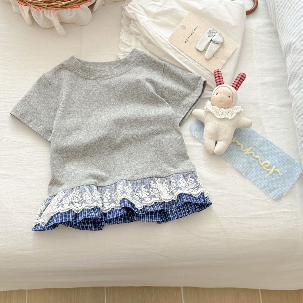 2025 여름 여성 아동복 가짜 투피스 반팔 티셔츠 새 캐주얼 한국 스타일 바느질 레이스 어린이 풀오버 탑