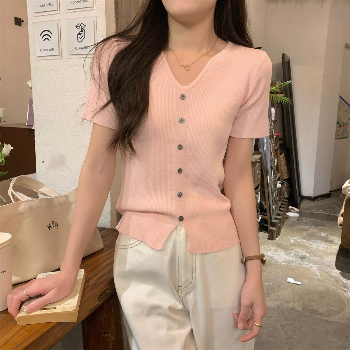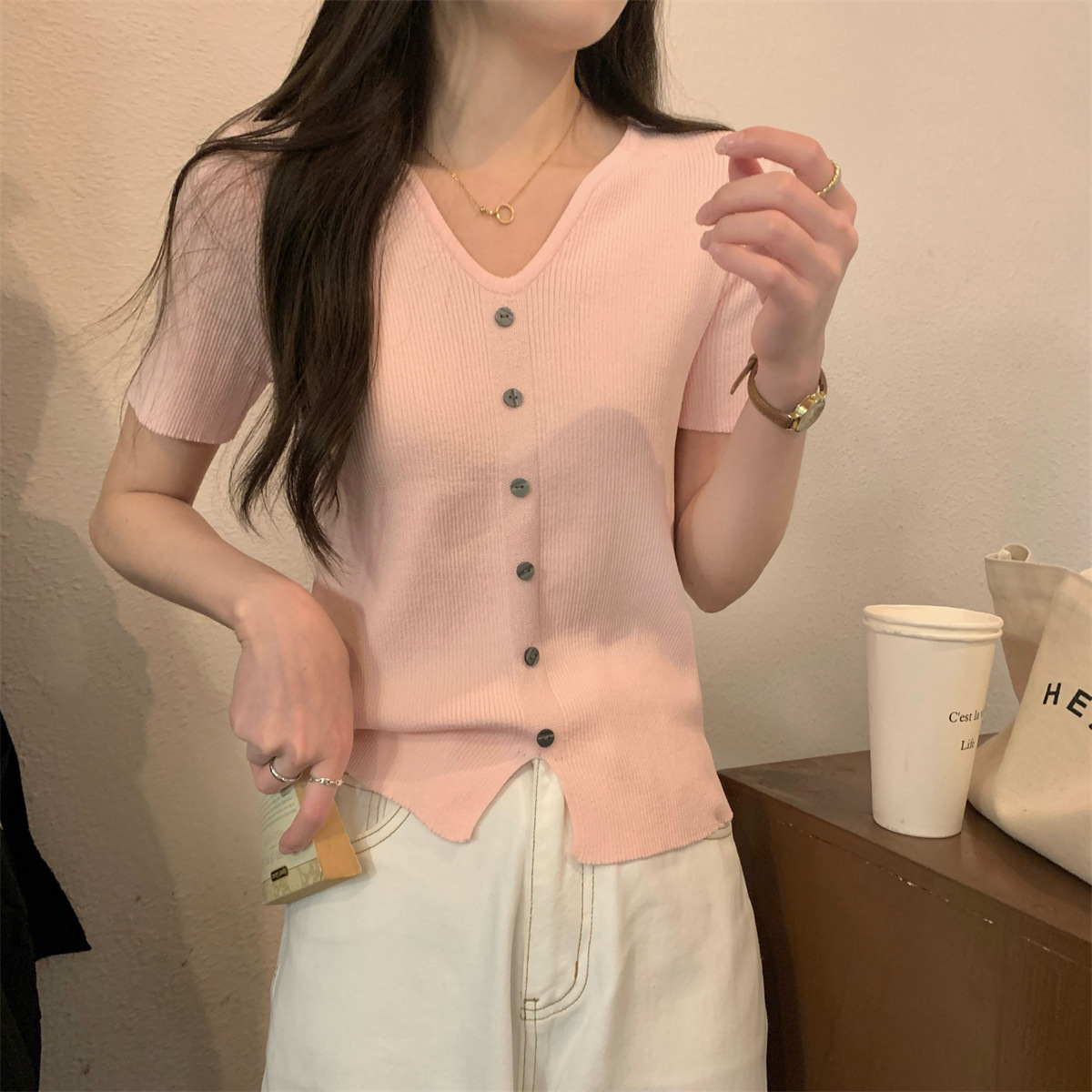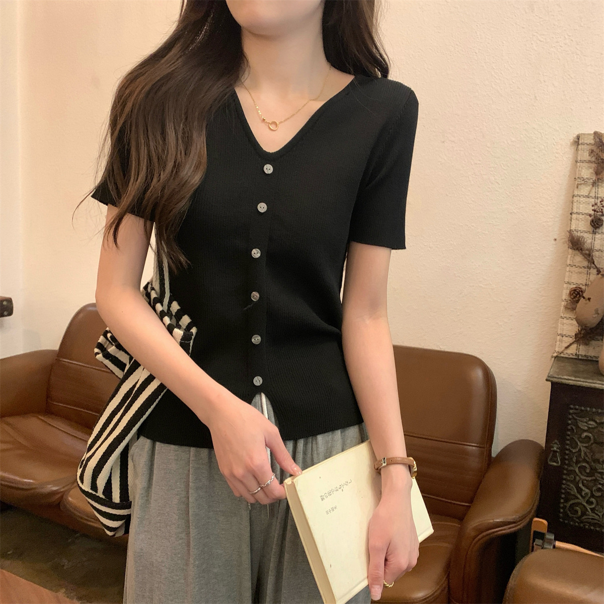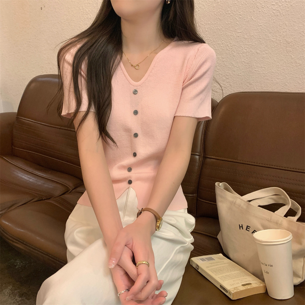 세련되고 독특한 여름 프랑스 로우 칼라 하이 엔드 버튼 아이스 실크 니트 반팔 티셔츠 여성용 짧은 작은 셔츠 탑