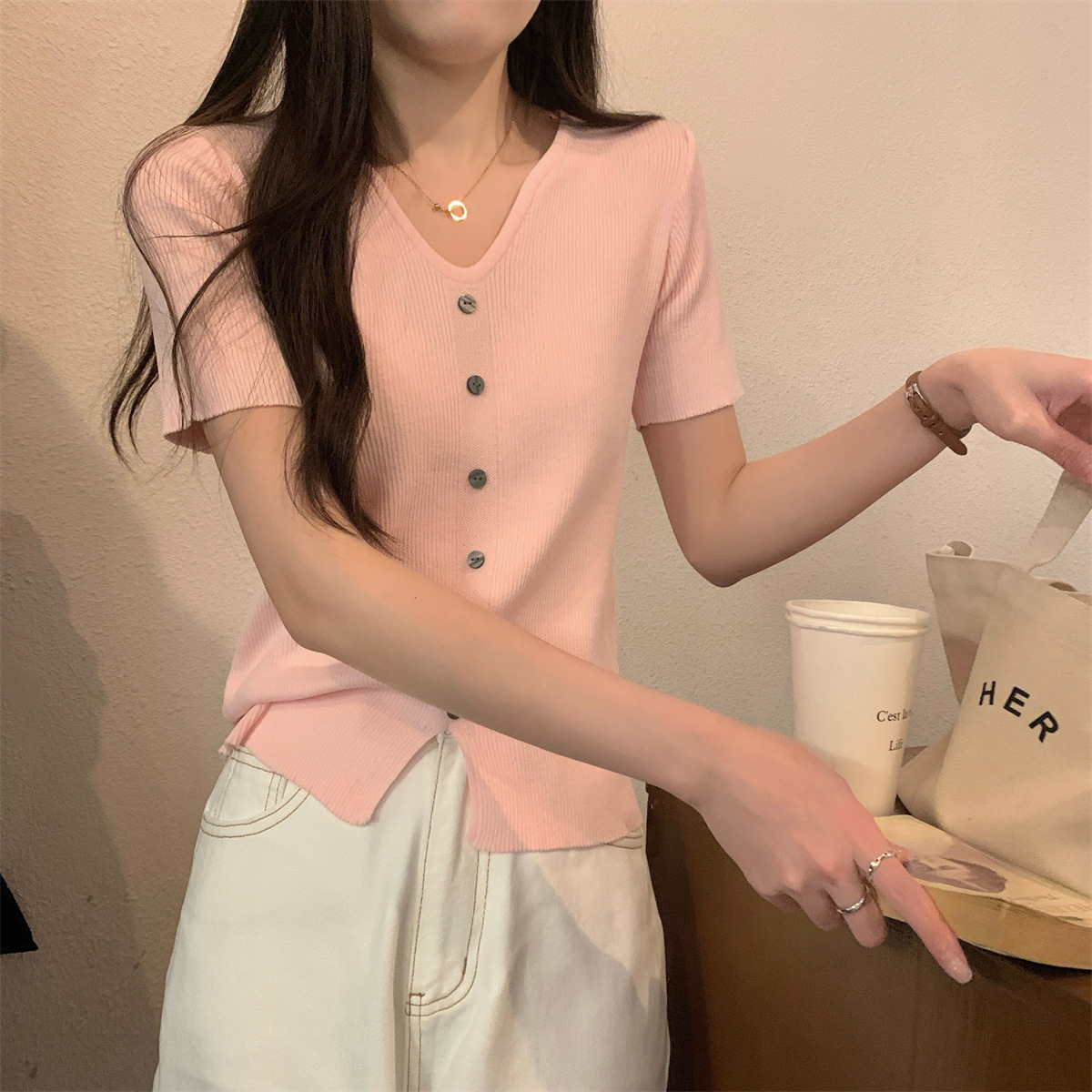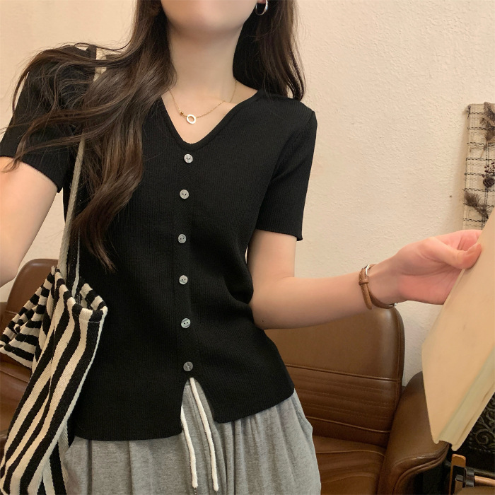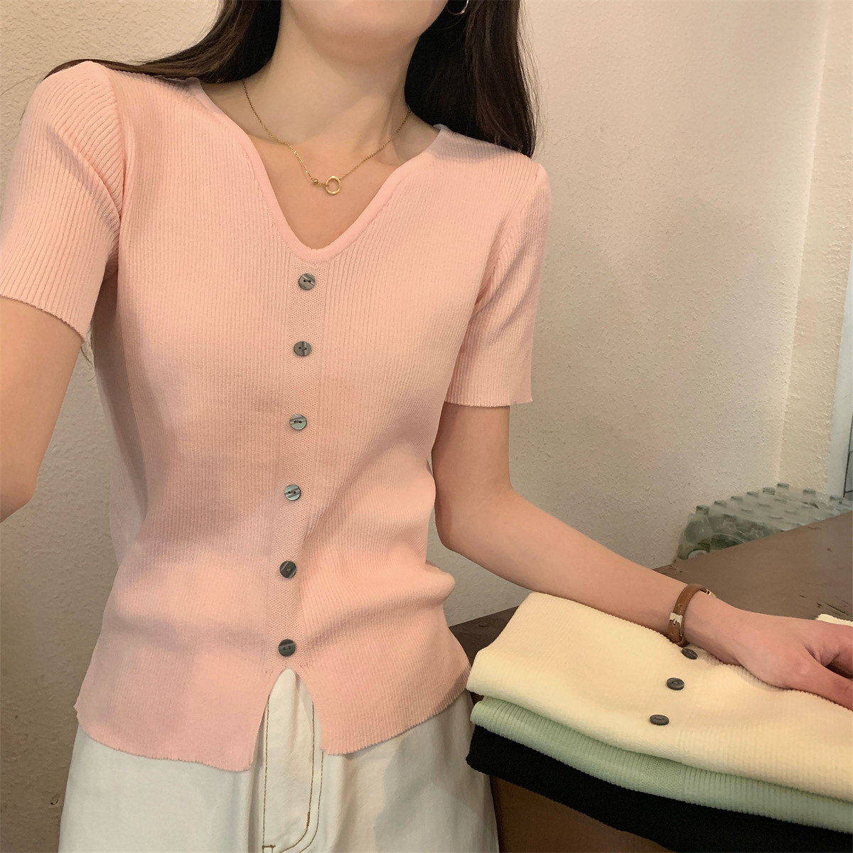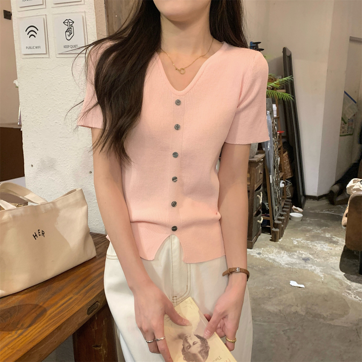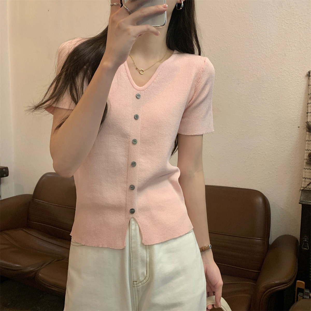 세련되고 독특한 여름 프랑스 로우 칼라 하이 엔드 버튼 아이스 실크 니트 반팔 티셔츠 여성용 짧은 작은 셔츠 탑