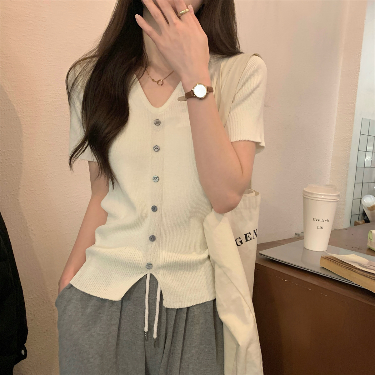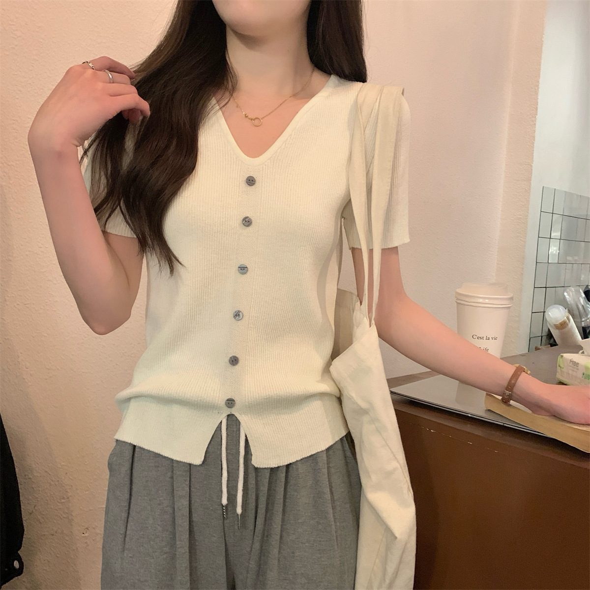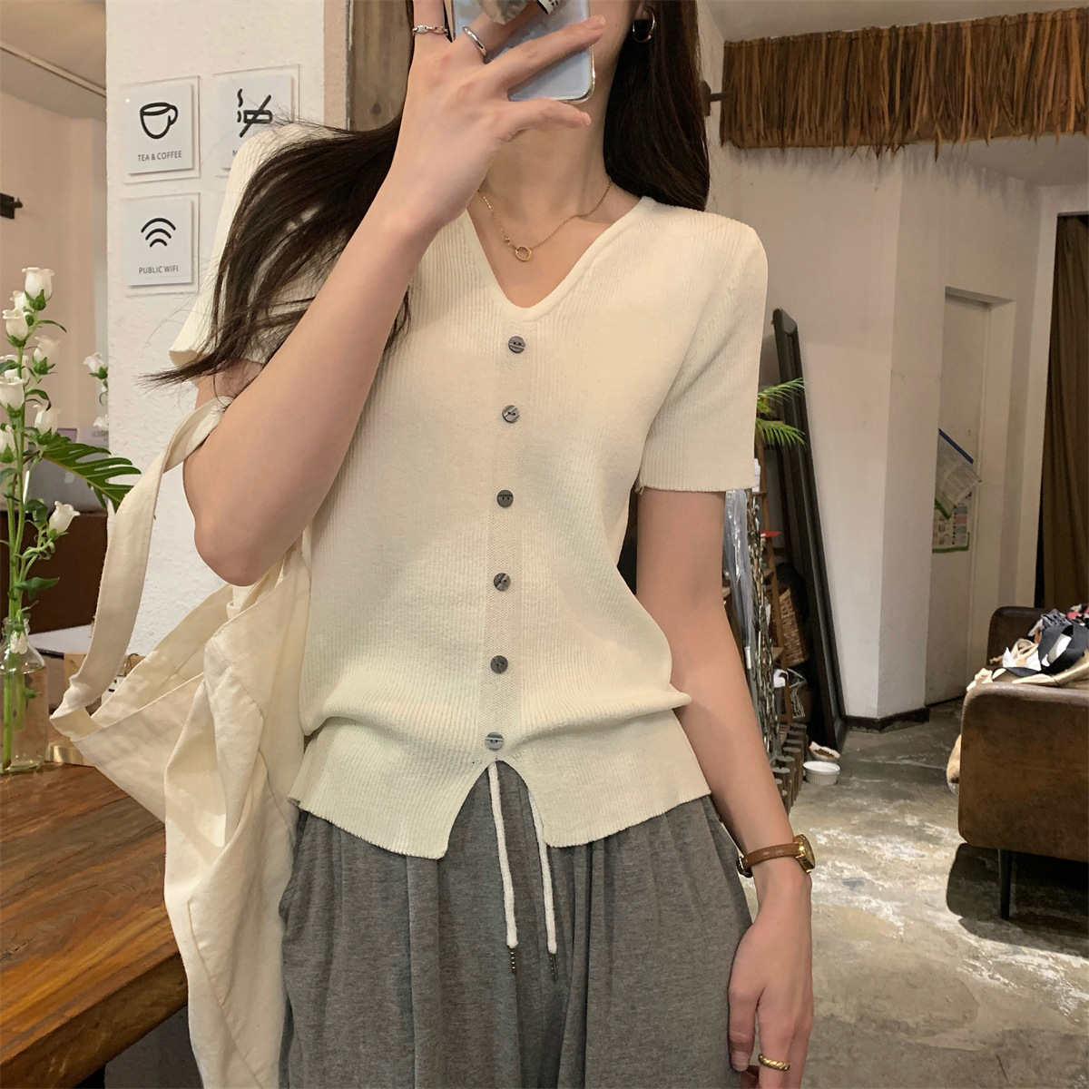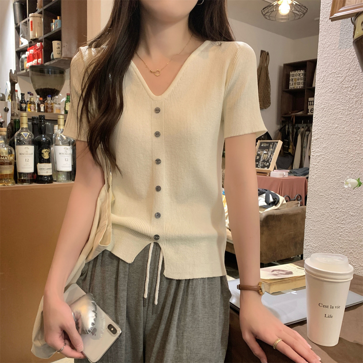 세련되고 독특한 여름 프랑스 로우 칼라 하이 엔드 버튼 아이스 실크 니트 반팔 티셔츠 여성용 짧은 작은 셔츠 탑스토어 가기