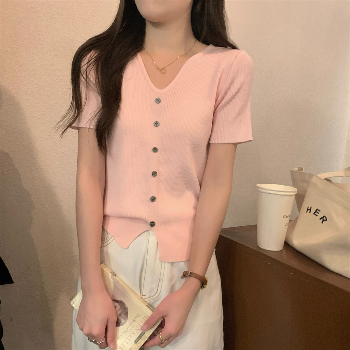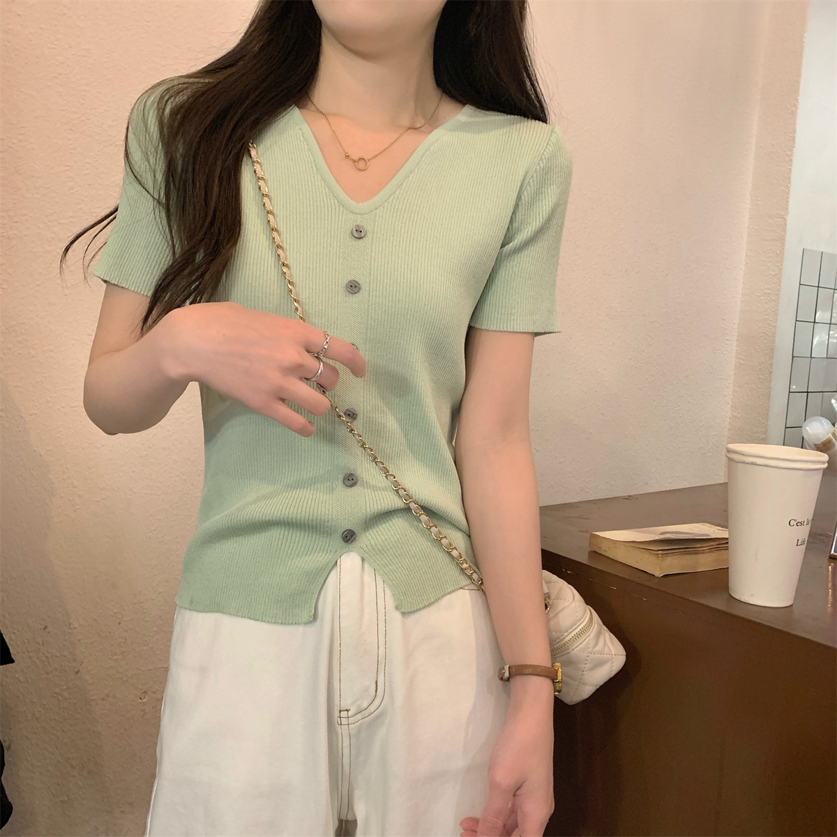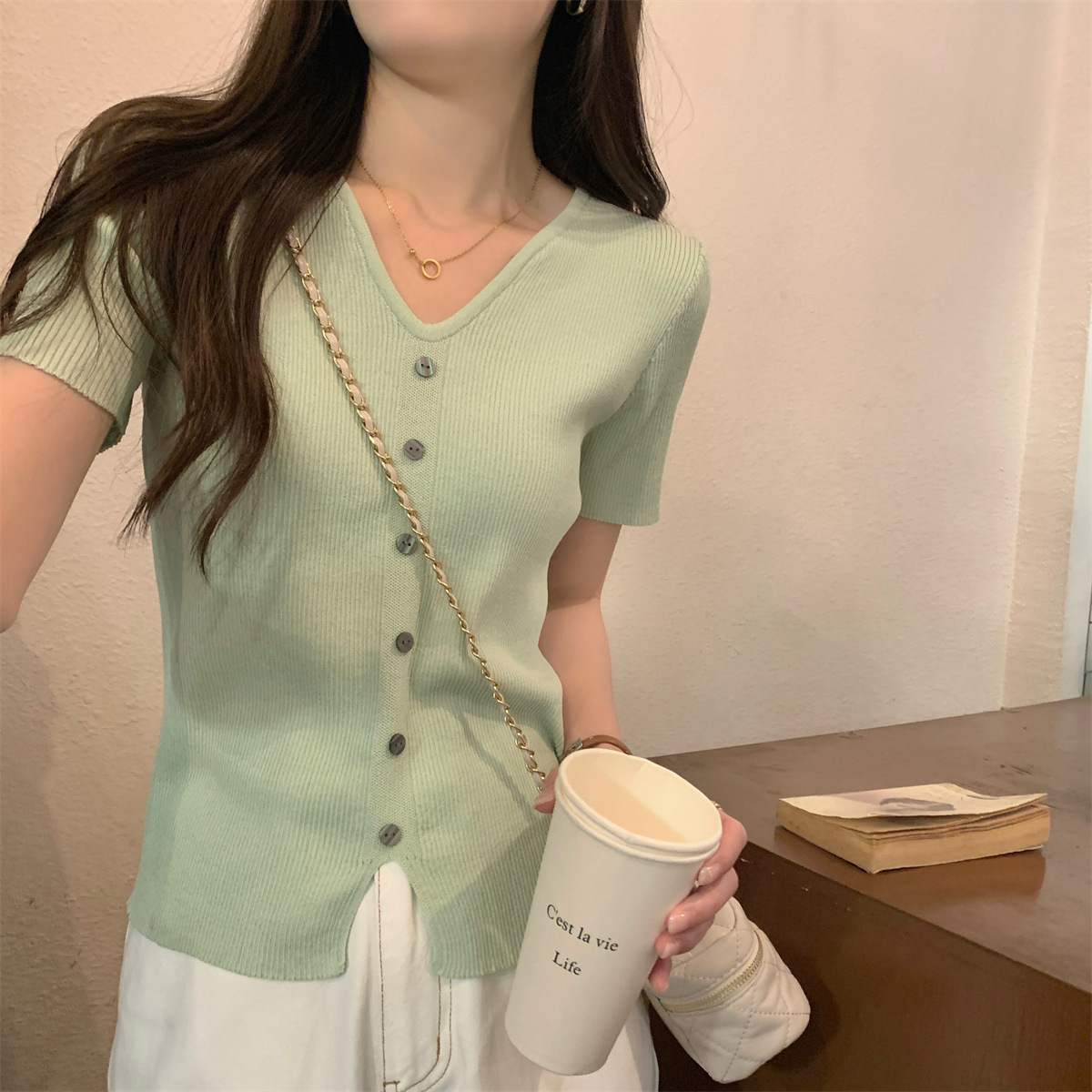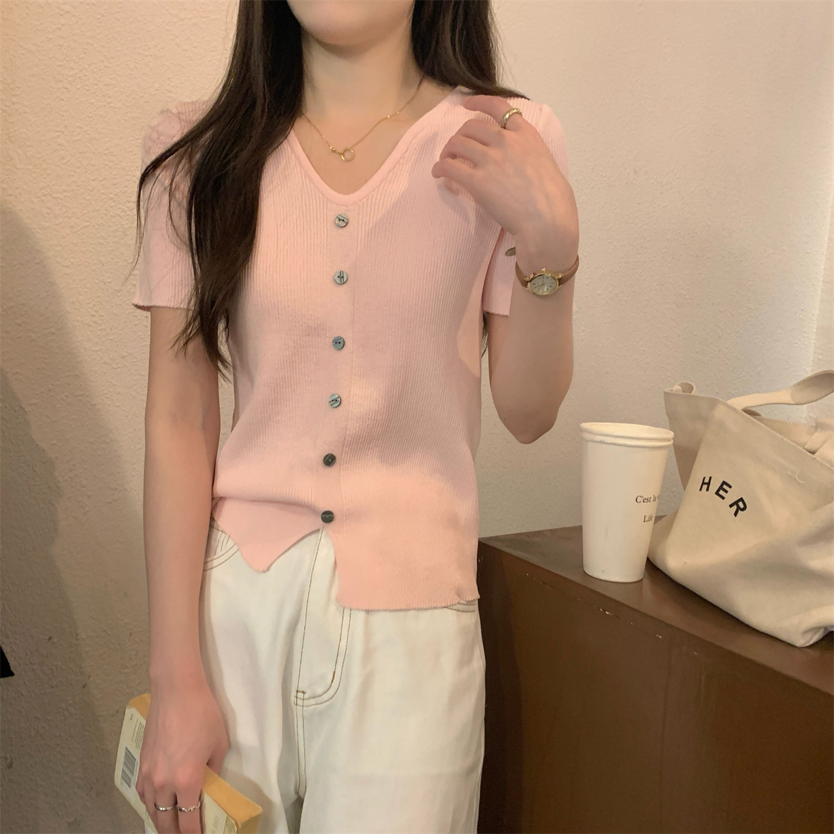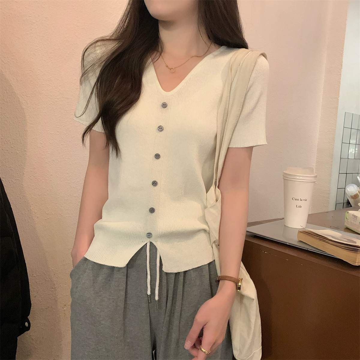 세련되고 독특한 여름 프랑스 로우 칼라 하이 엔드 버튼 아이스 실크 니트 반팔 티셔츠 여성용 짧은 작은 셔츠 탑스토어 가기