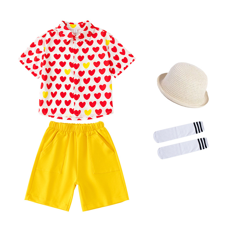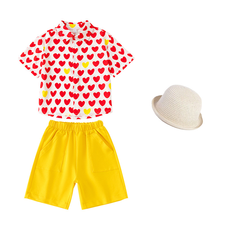 • 레드 하트 반팔 셔츠 + 노란색 반바지 + 흰색 밀짚모자