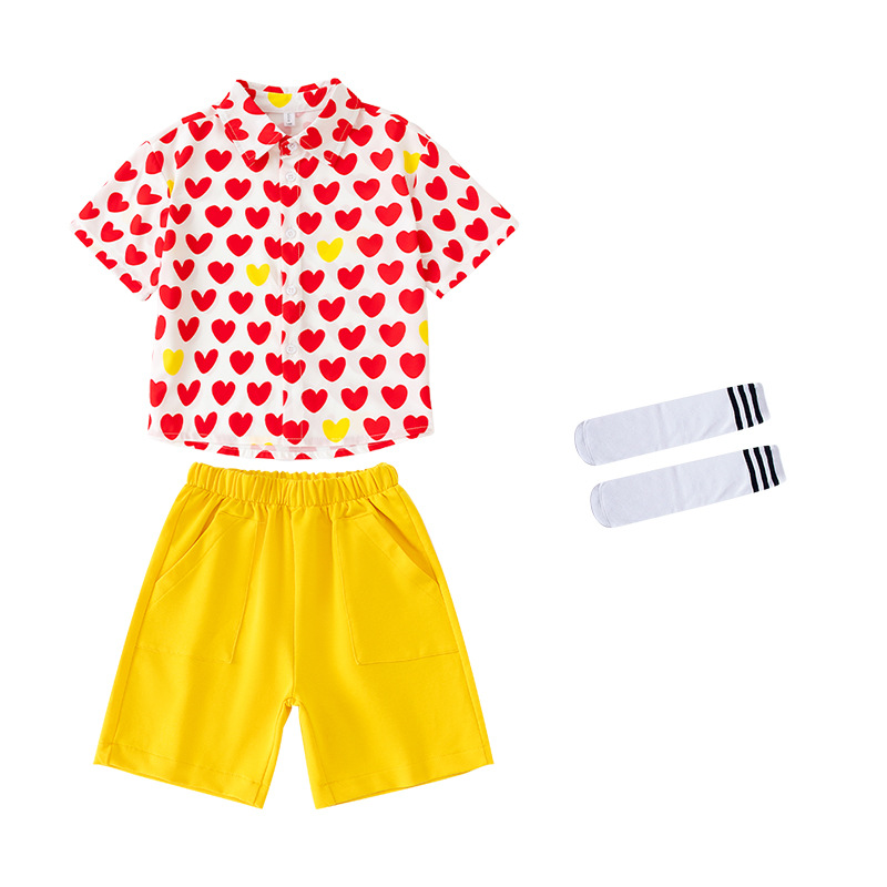 • 레드 하트 반팔 셔츠 + 옐로우 반바지 + 블랙 스트라이프 화이트 양말