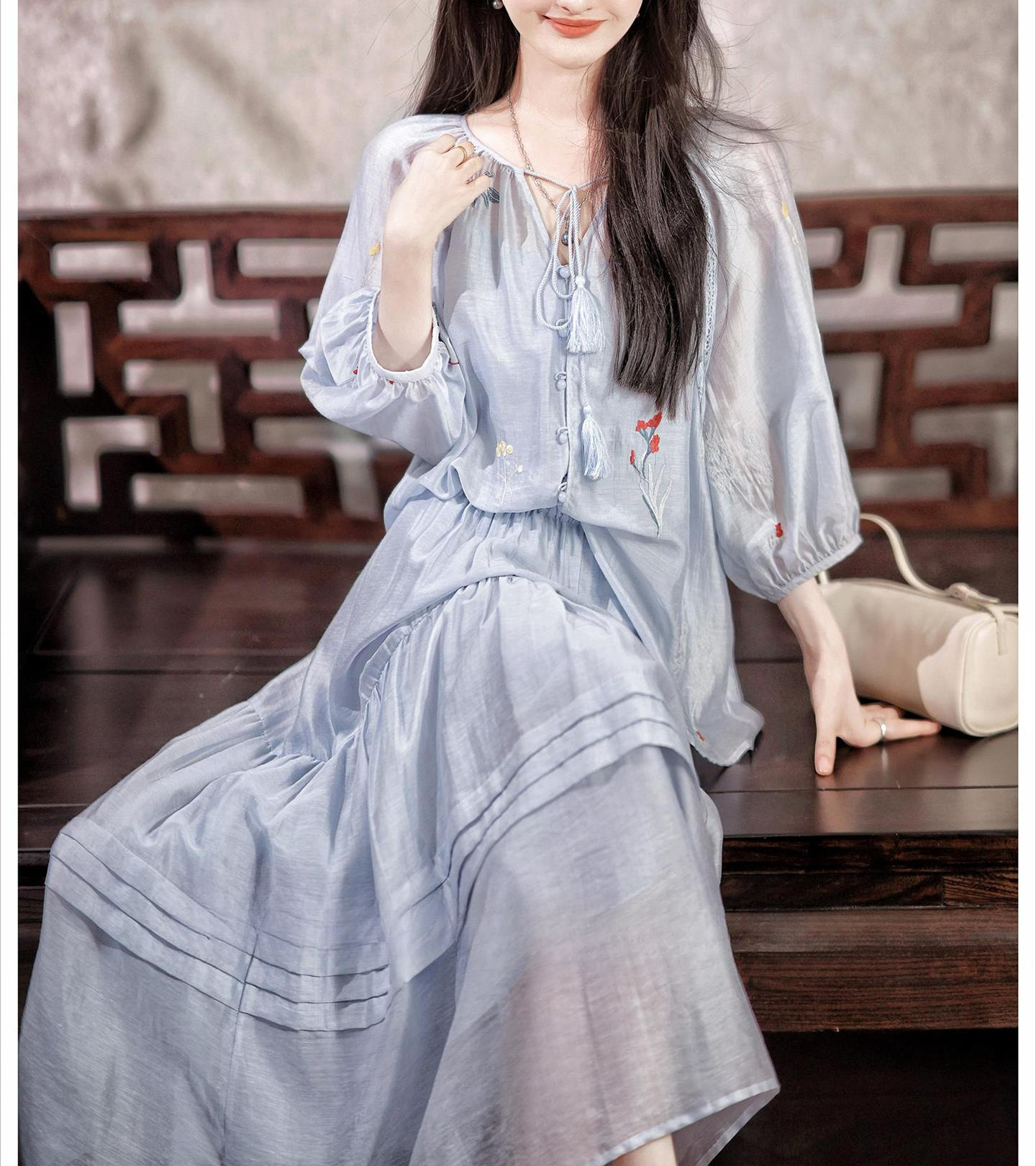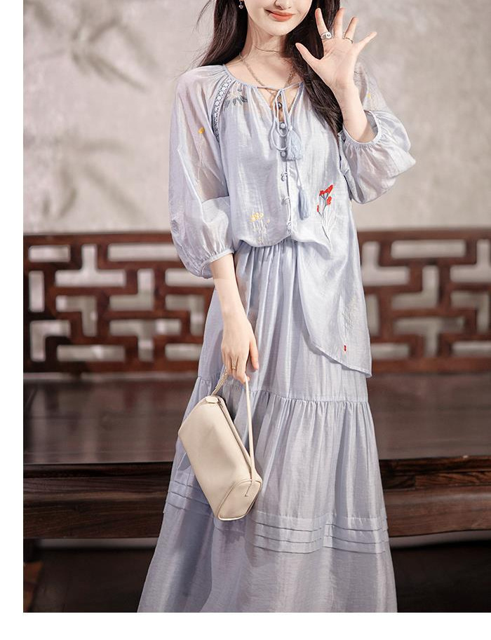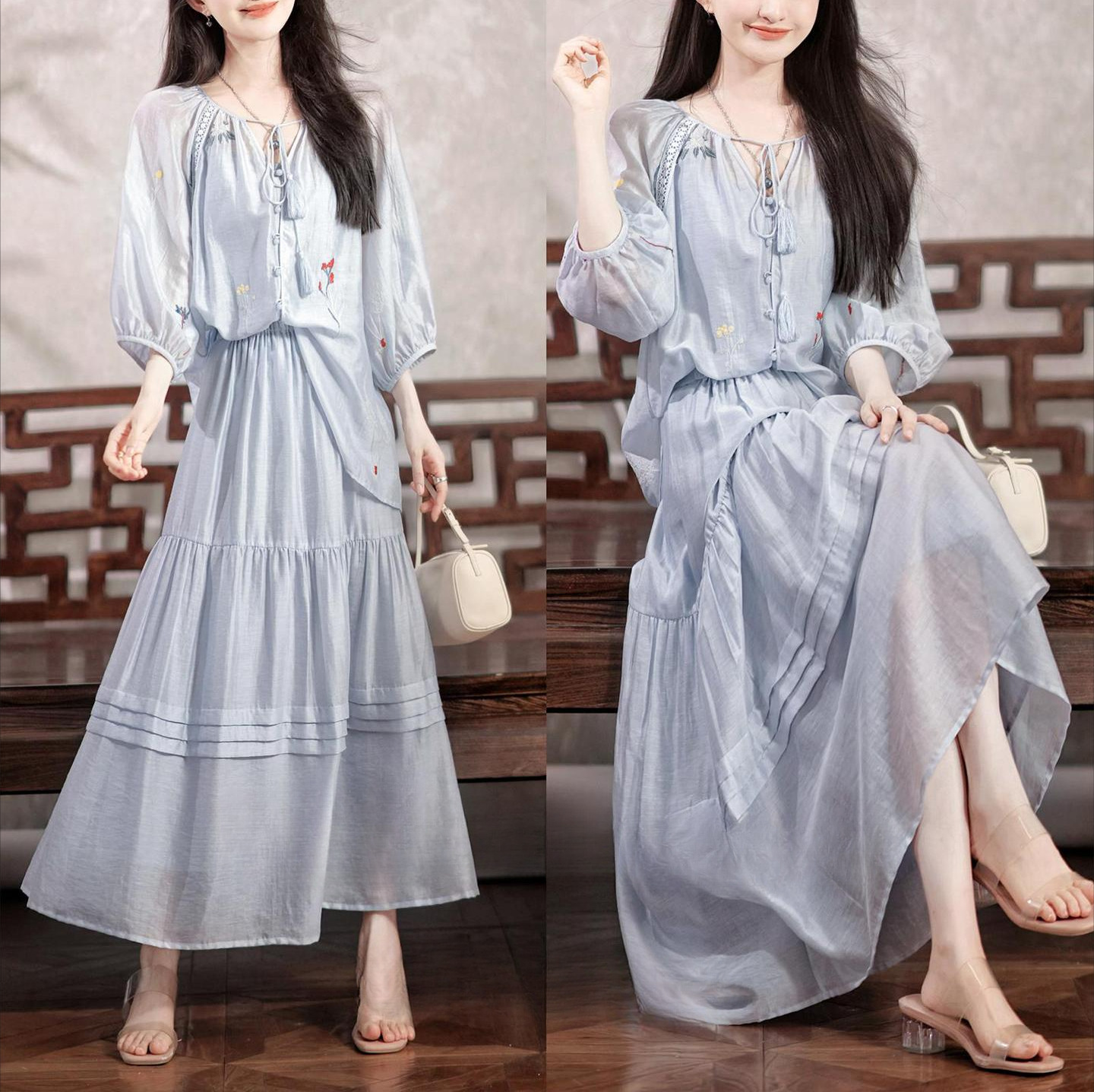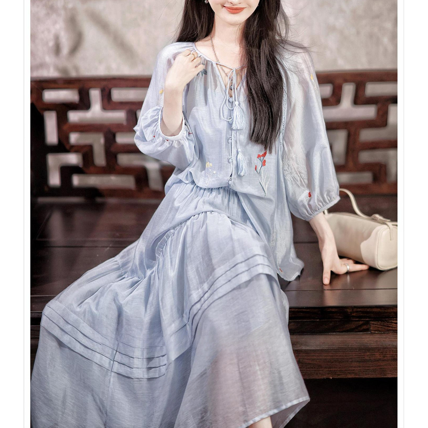 프랑스 로맨틱 블루 윈드 벨 자수 뽕나무 실크 셔츠 최고 여성 세트 여름 아름다운 스커트 투피스 유행 세트스토어 가기