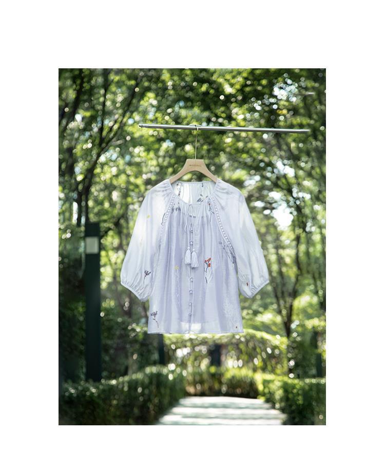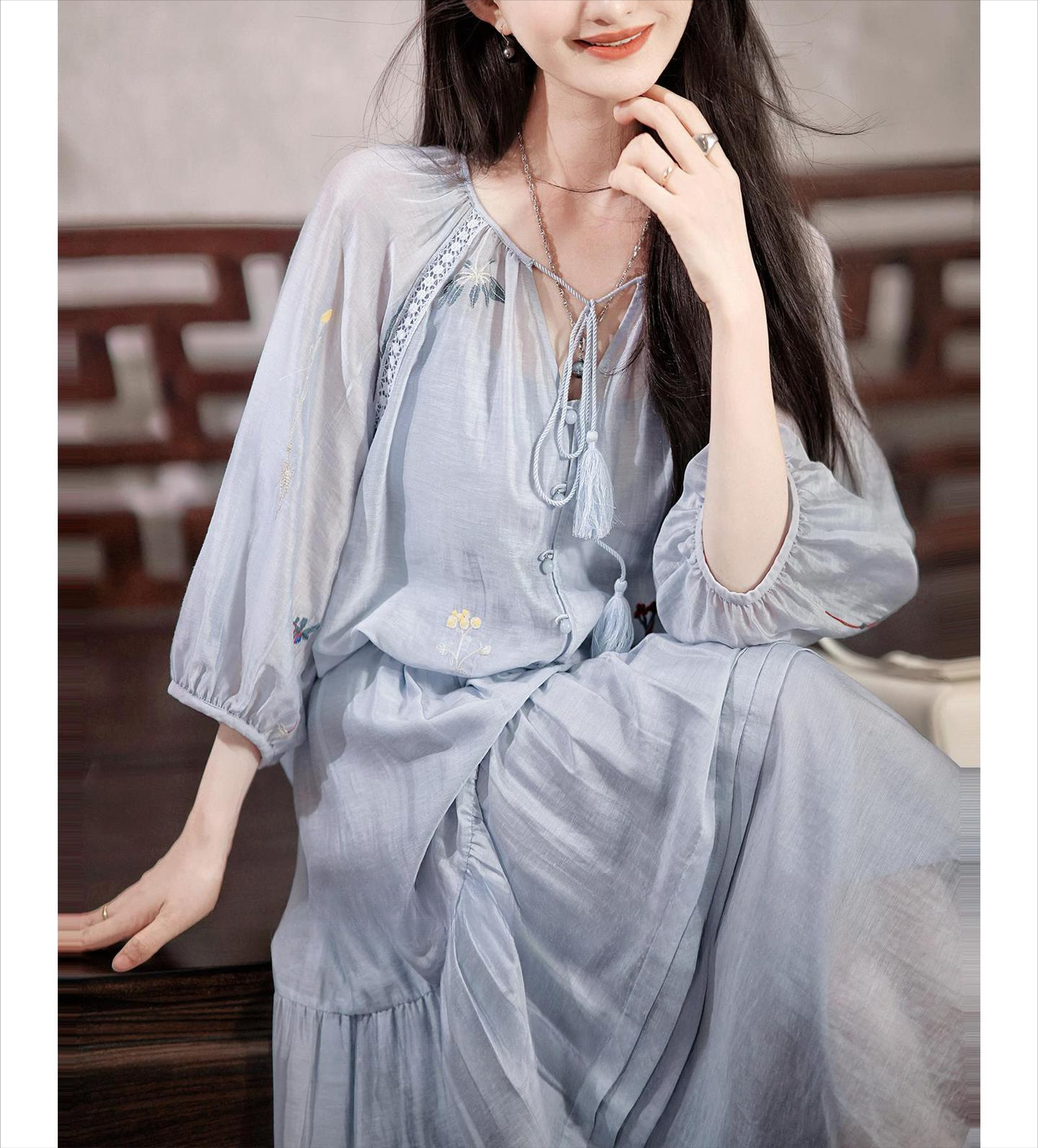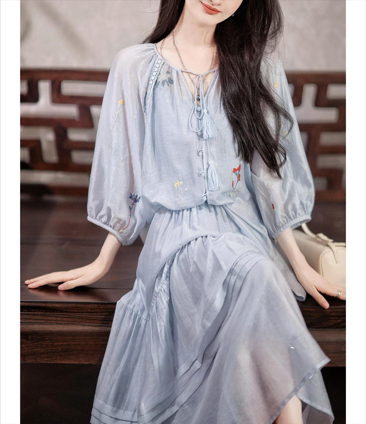 프랑스 로맨틱 블루 윈드 벨 자수 뽕나무 실크 셔츠 최고 여성 세트 여름 아름다운 스커트 투피스 유행 세트스토어 가기