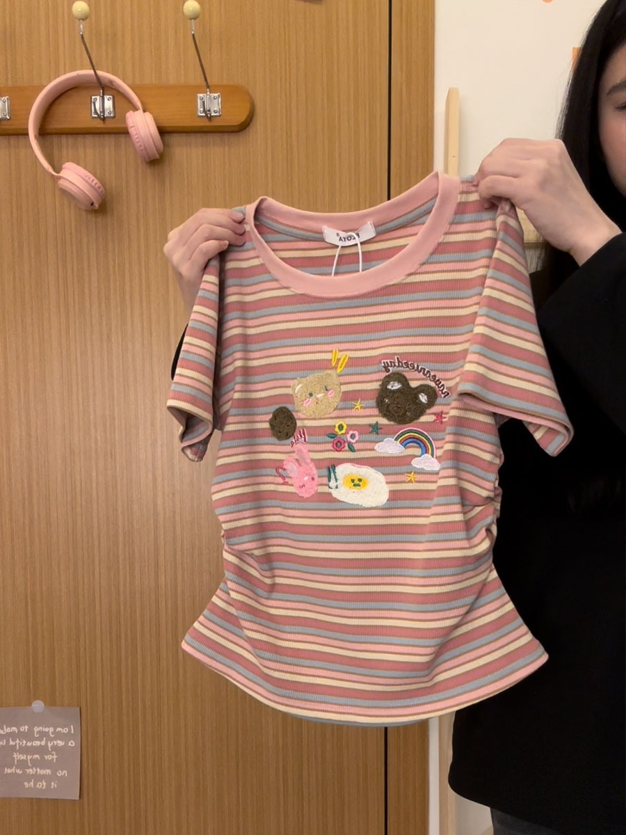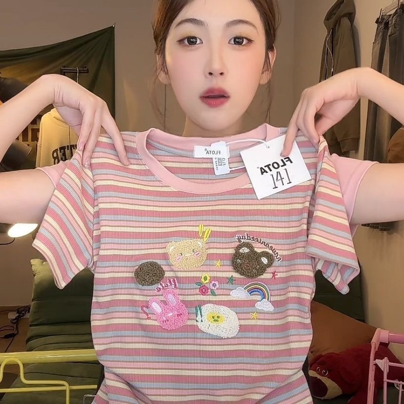도파민 자수 레인보우 스트라이프 숄더 반팔 티셔츠 여성 여름 짧은 스위트 칼리지 스타일 연령 감소 탑인