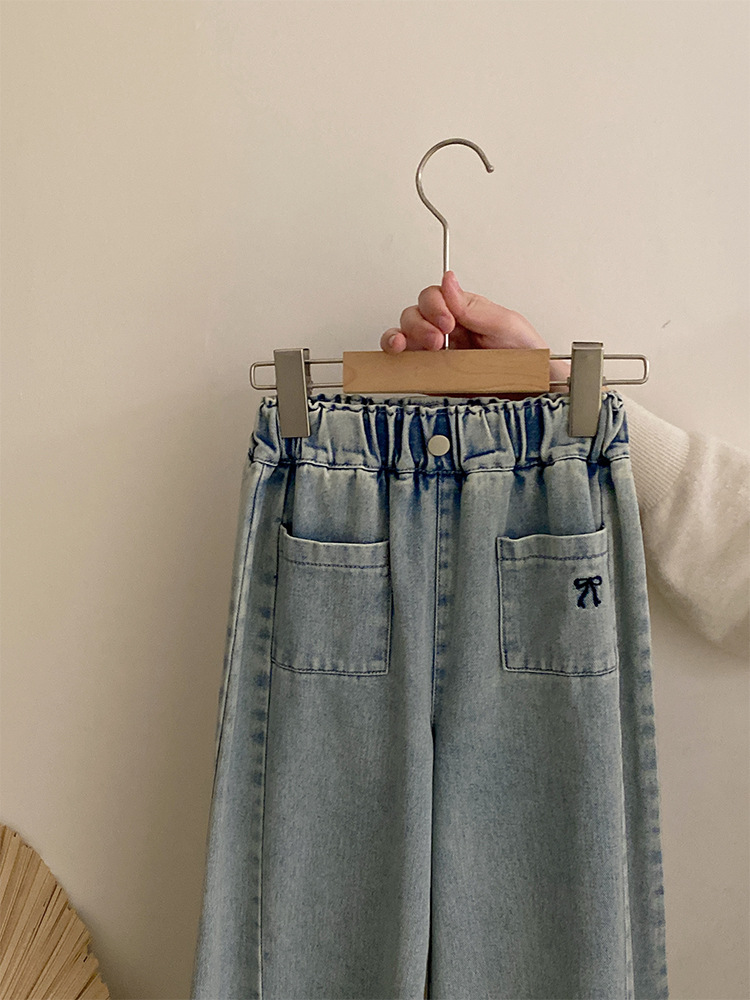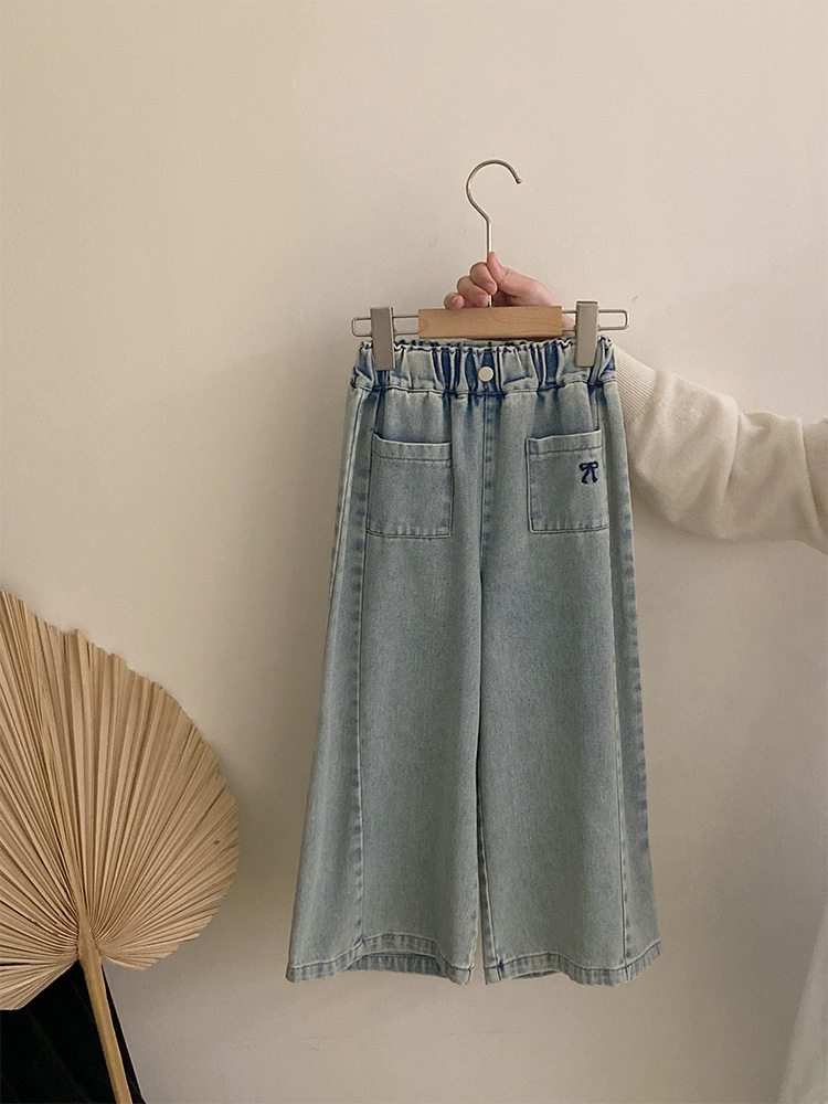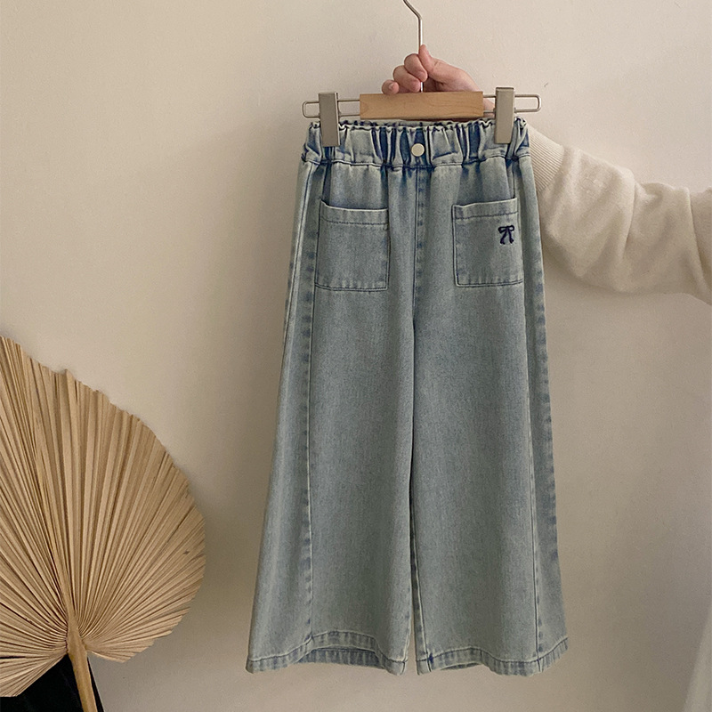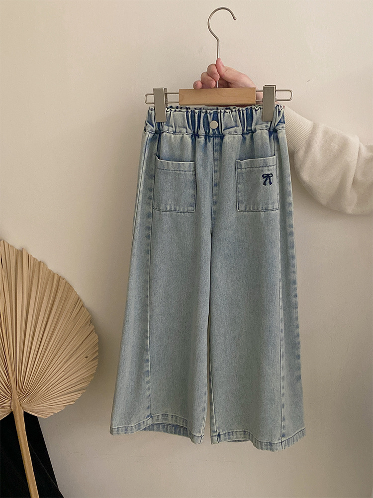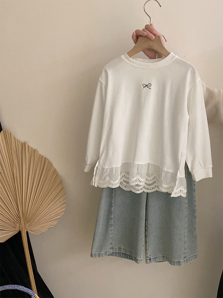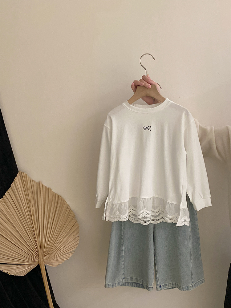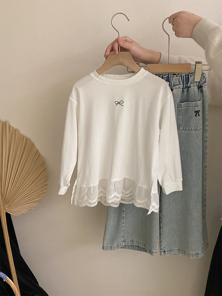 소녀 2025 봄 달콤한 머리 레이스베이스 셔츠 어린이 서양식 활 인쇄 넓은 다리 트렌디 바지