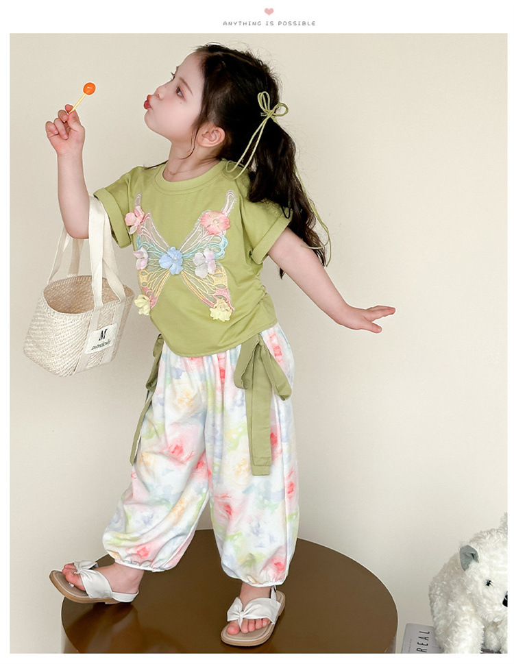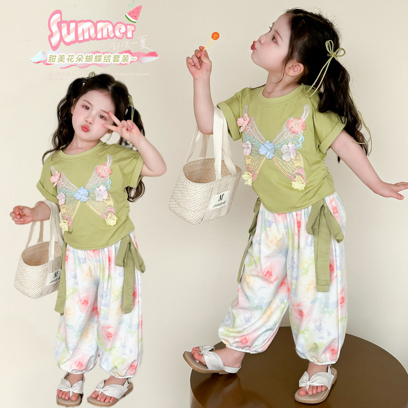 여자 여름 정장 2025 새로운 어린이 스타일 활 반팔 T 모기 방지 바지 투피스 세트 아기 아동복스토어 가기