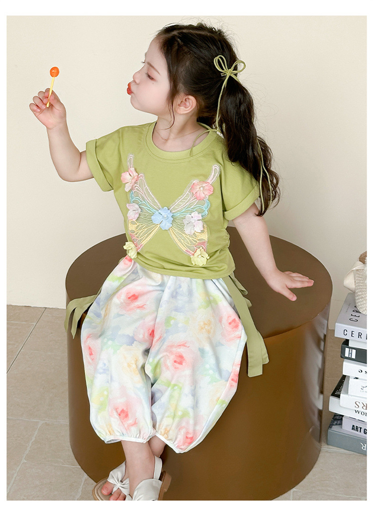 여자 여름 정장 2025 새로운 어린이 스타일 활 반팔 T 모기 방지 바지 투피스 세트 아기 아동복