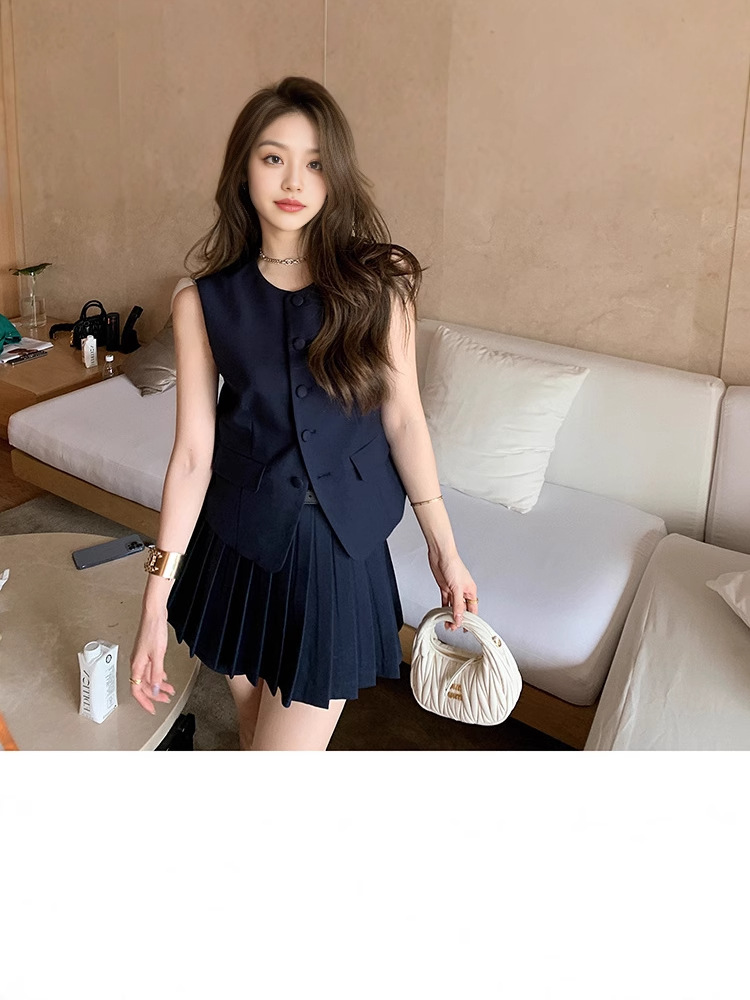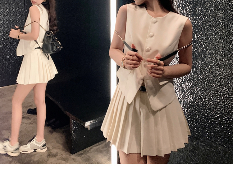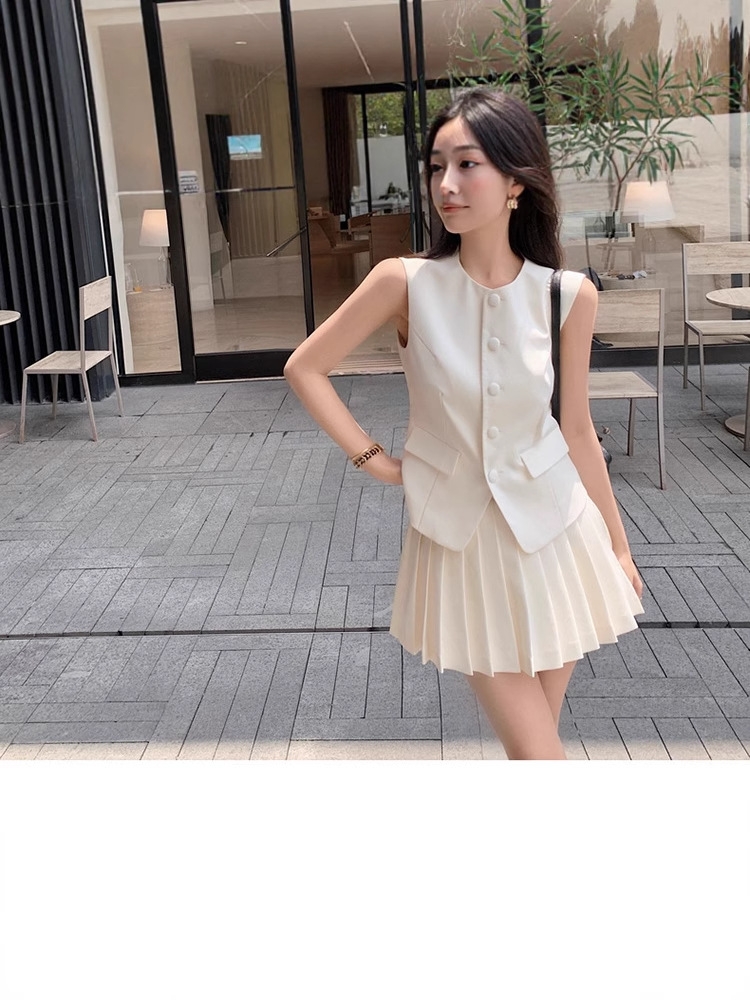 여름 여성을 위한 스타 유럽 패션 조끼 정장 새로운 한국식 슬리밍 플리츠 스커트 투피스 세트