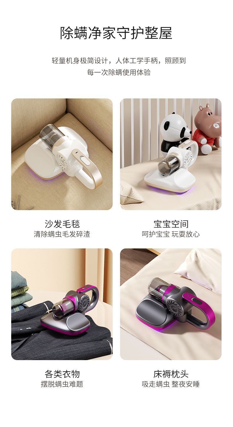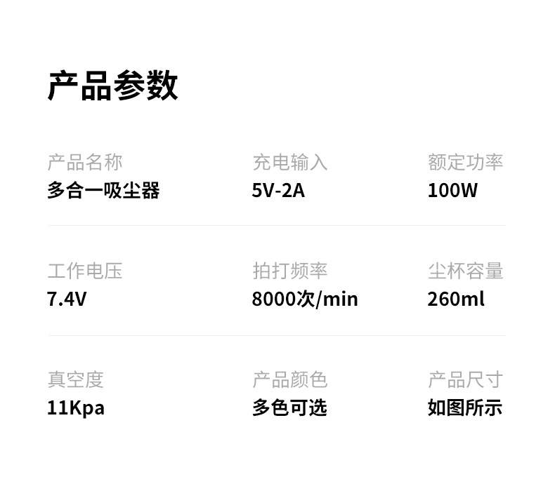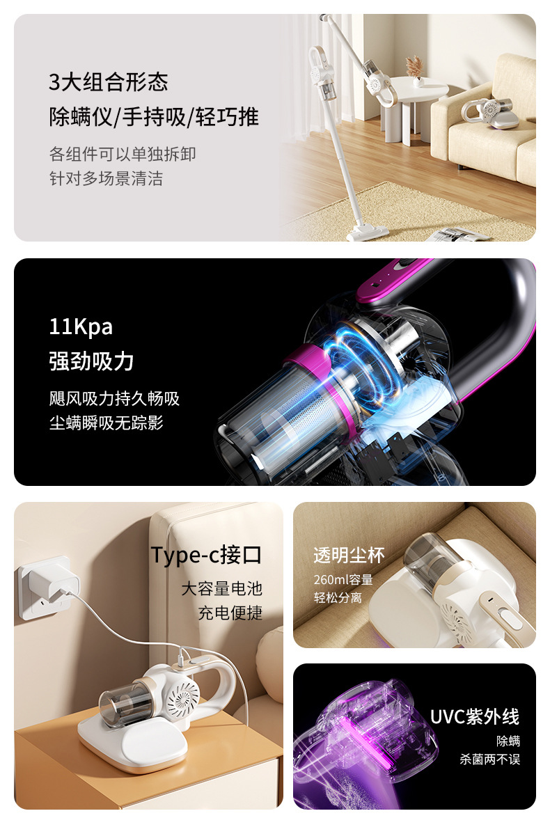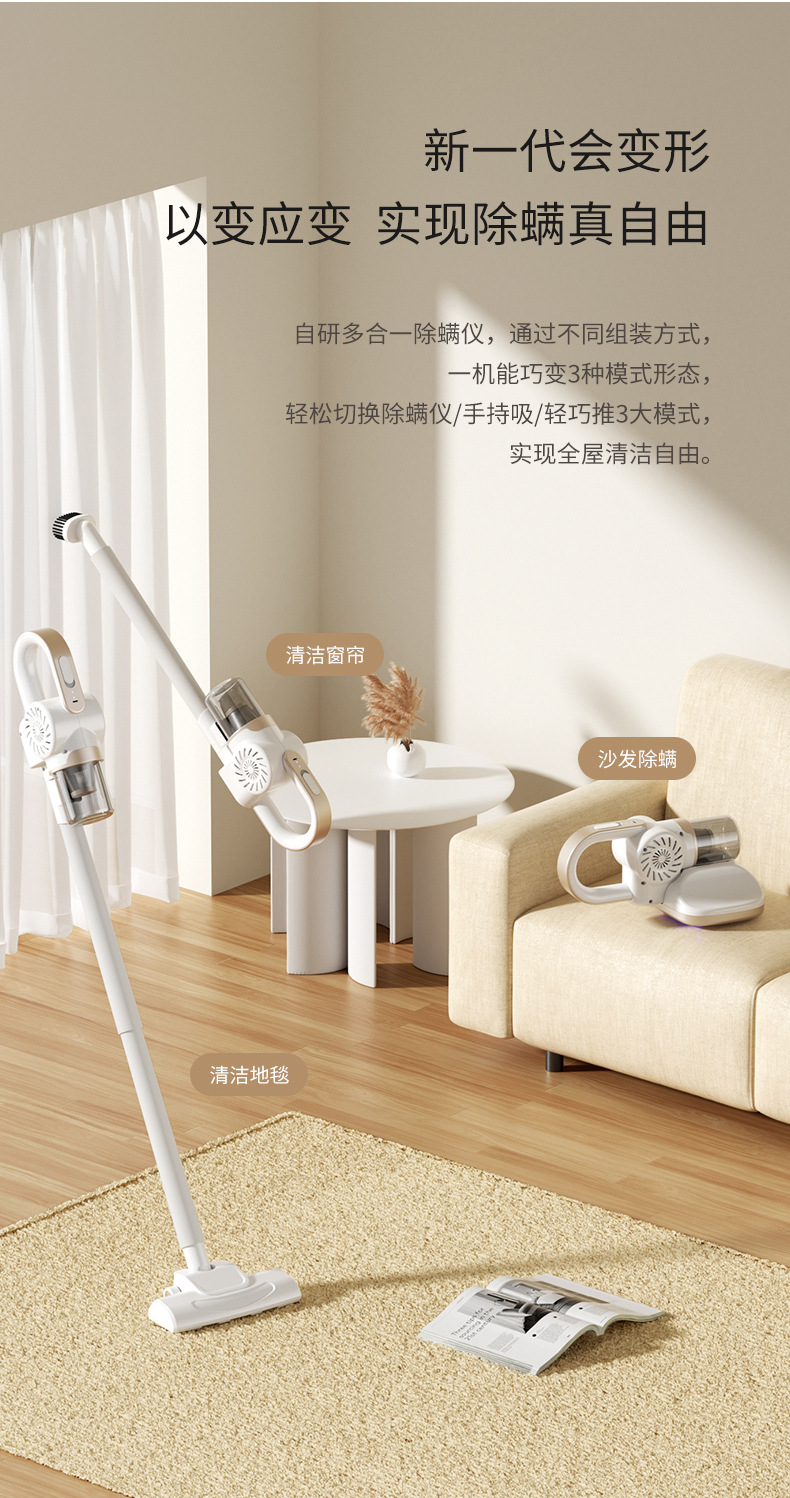 产品配件:主机*1、地板刷连接管*2、地板刷*1、二合一扁吸*1、除螨头*1
