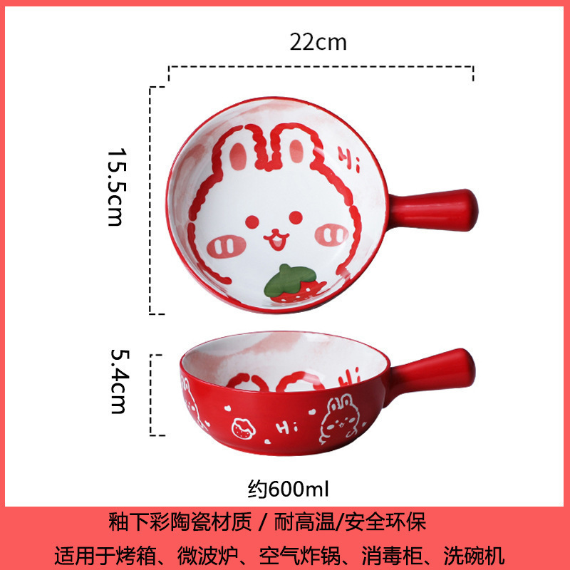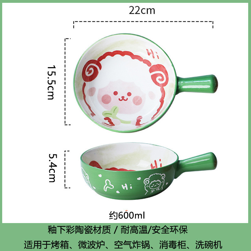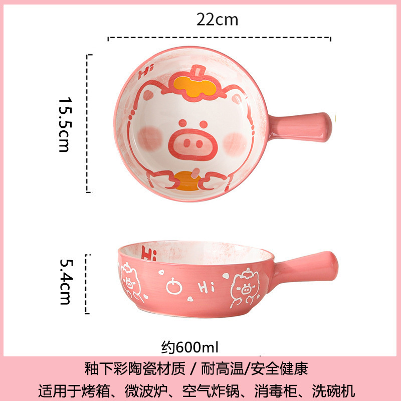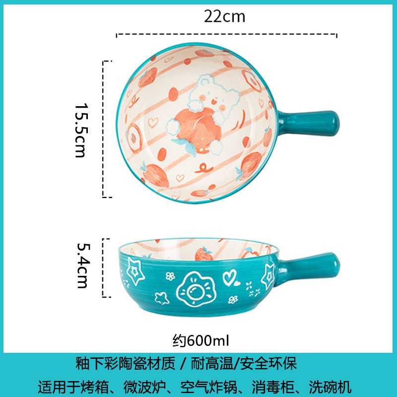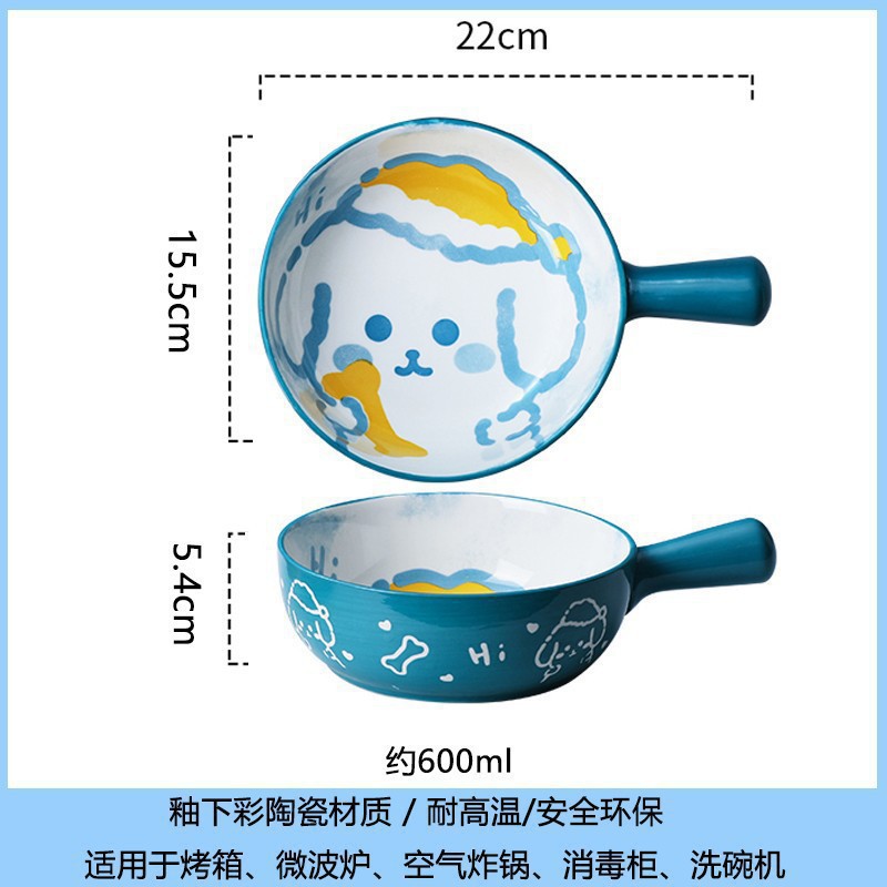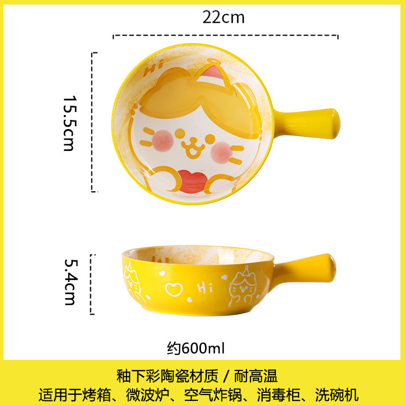 손잡이가있는 가정용 유약 컬러 세라믹 베이킹 그릇 귀여운 샐러드 그릇 만화 어린이 학생 기숙사 싱글 핸들 인스턴트 국수 그릇스토어 가기