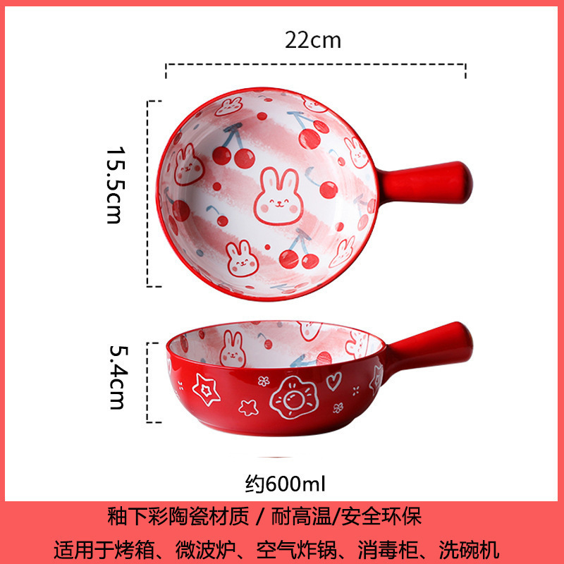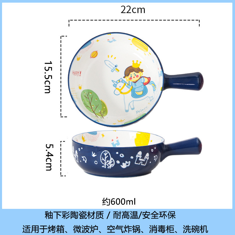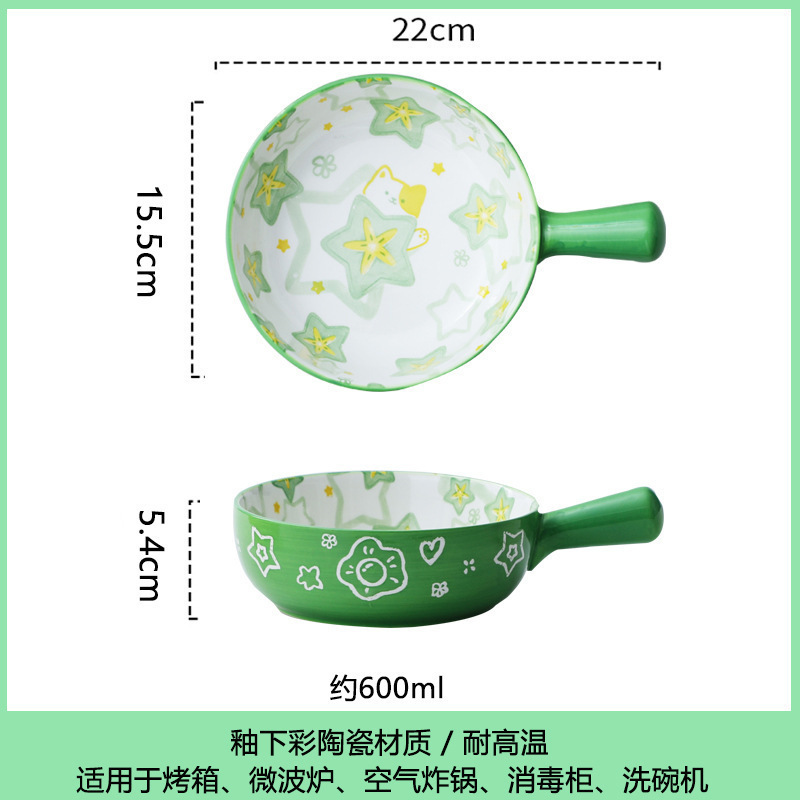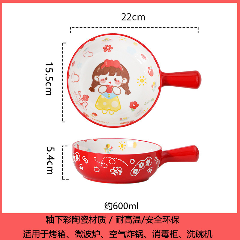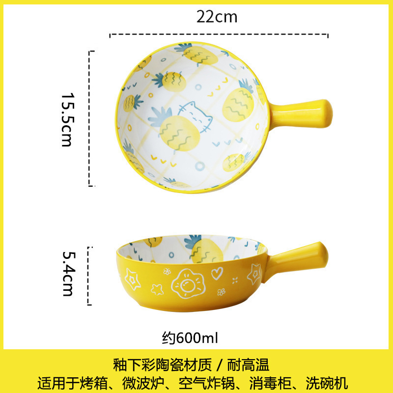 손잡이가있는 가정용 유약 컬러 세라믹 베이킹 그릇 귀여운 샐러드 그릇 만화 어린이 학생 기숙사 싱글 핸들 인스턴트 국수 그릇