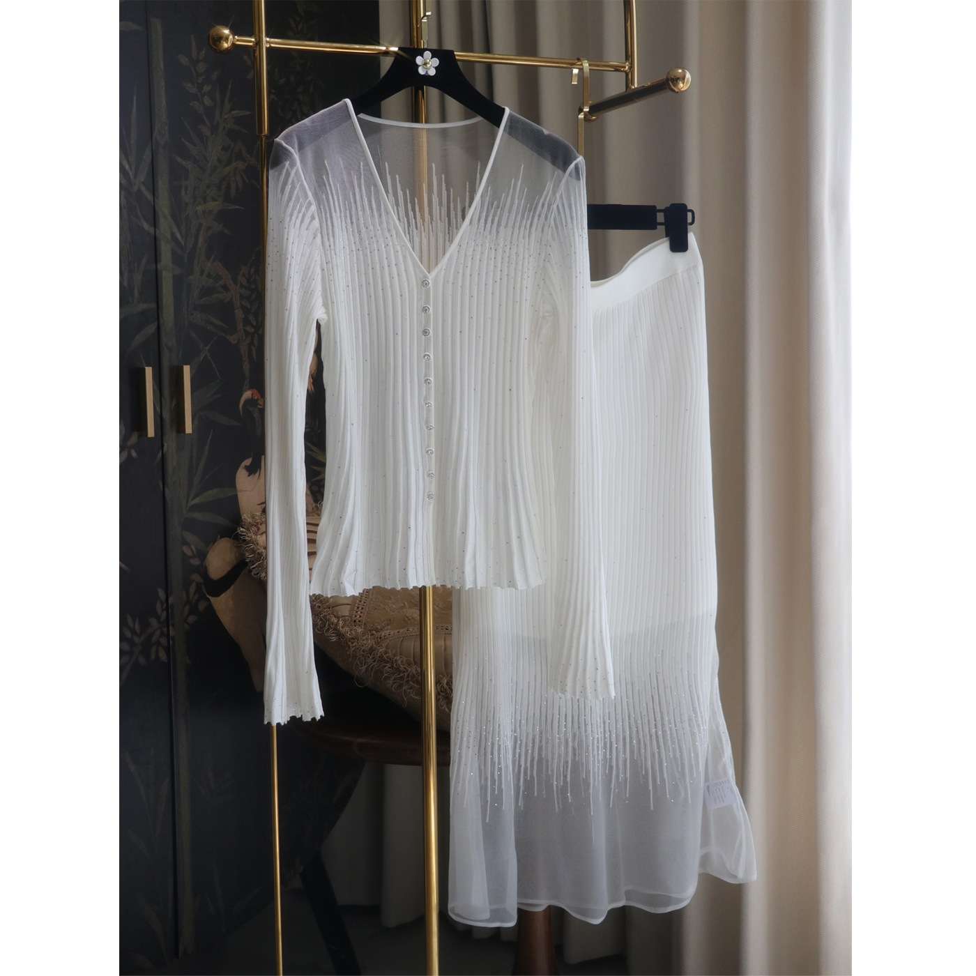CHAO 플래시 다이아몬드 풍부한 유명인 천 골드 스타일 로맨틱 슬림 슬림 룩 세미 투명 화이트 니트 원피스