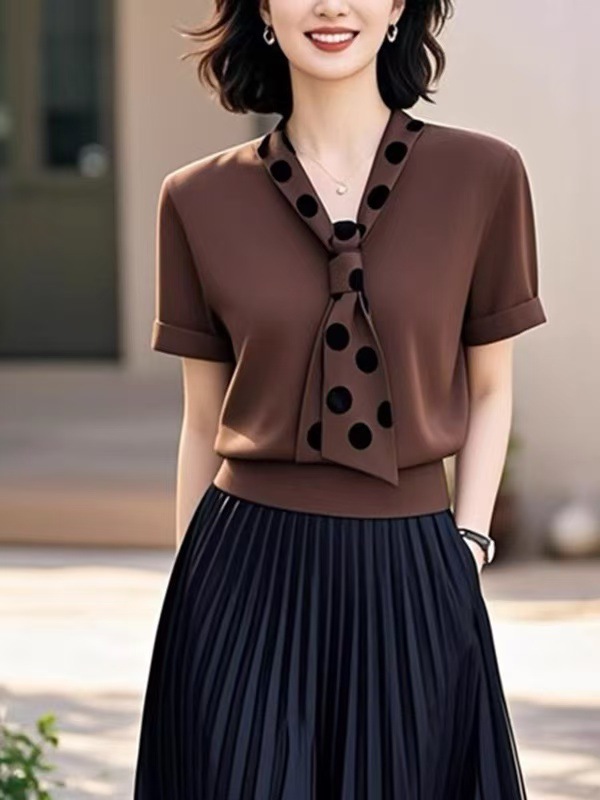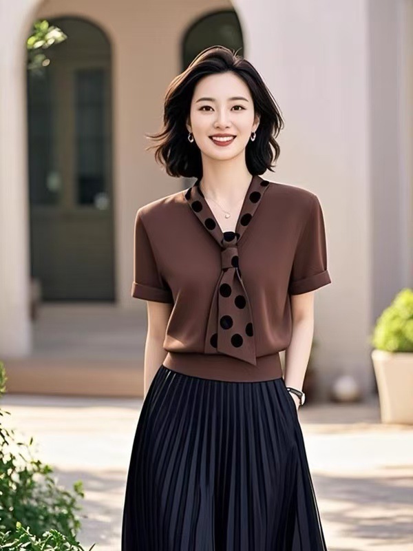가벼운 성숙한 기질 디자인 센스 다크 브라운 반팔 원피스 2025 여성의 새로운 감각 여름 세트
