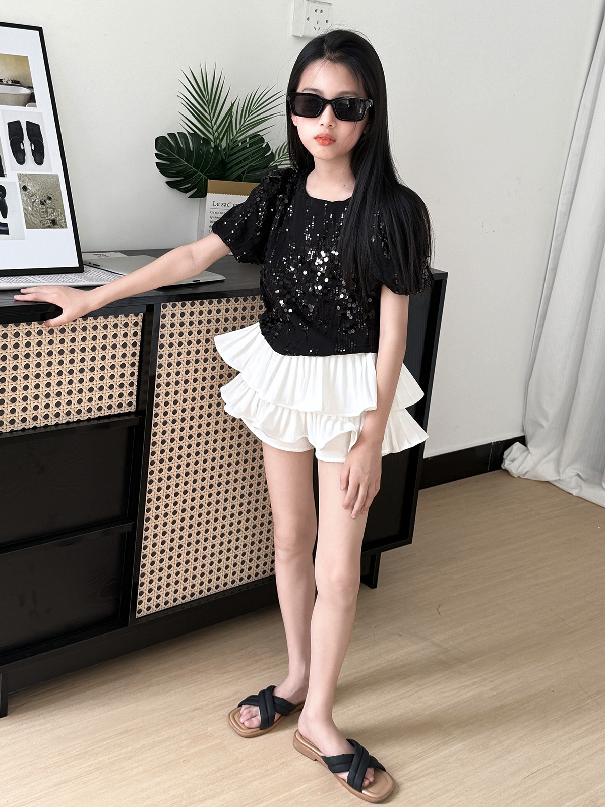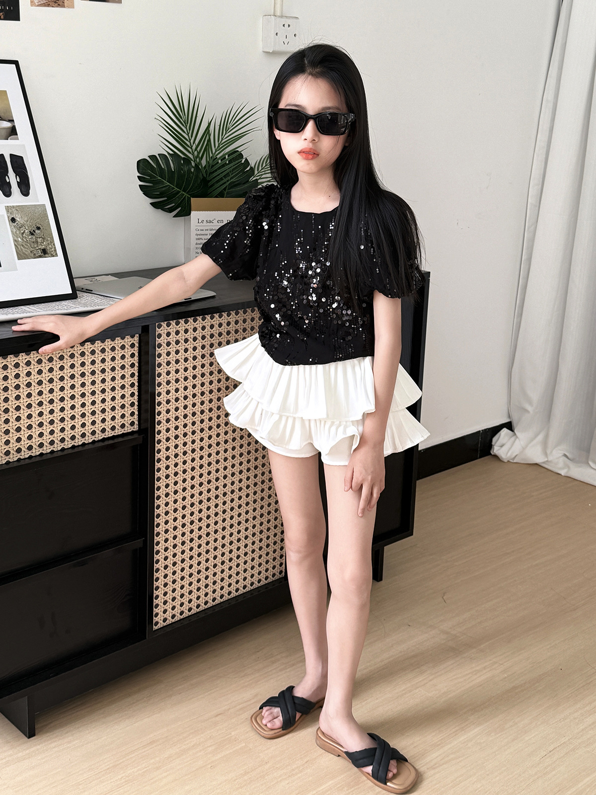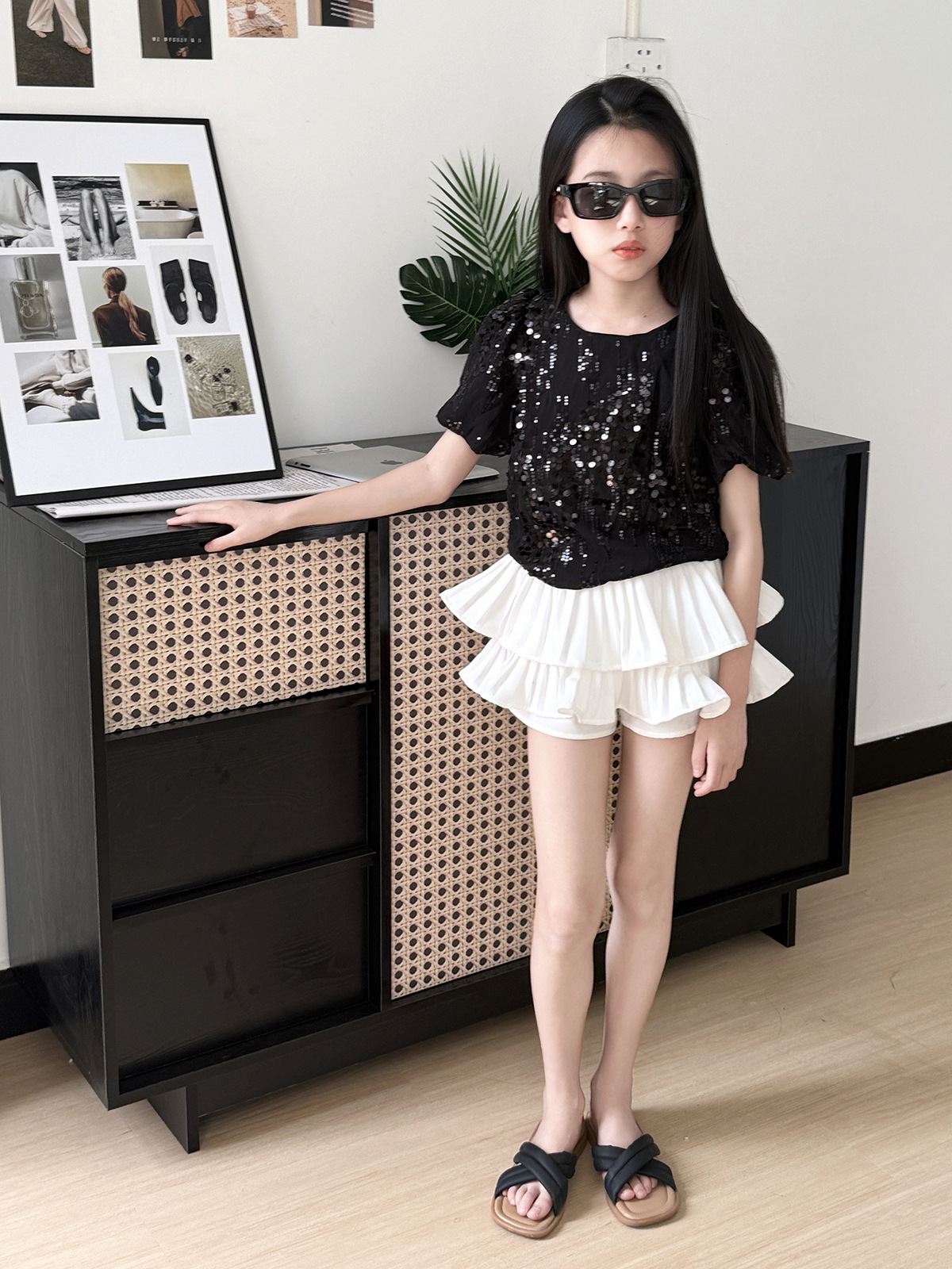 소녀 2025 여름 새로운 달콤한 중공업 Sequin 시폰 셔츠 주름 치마 바지 여름 반바지스토어 가기