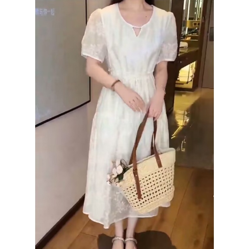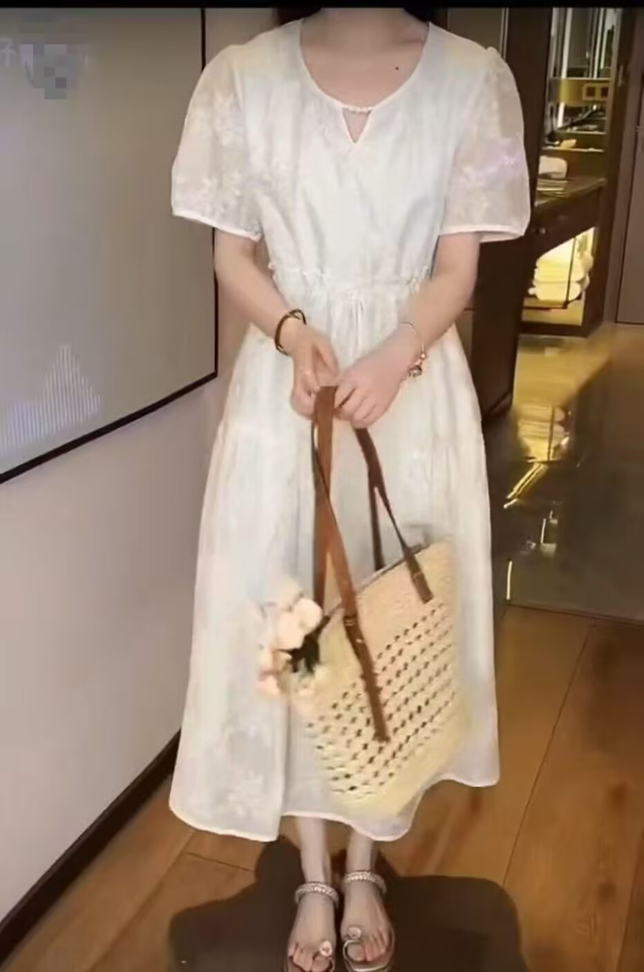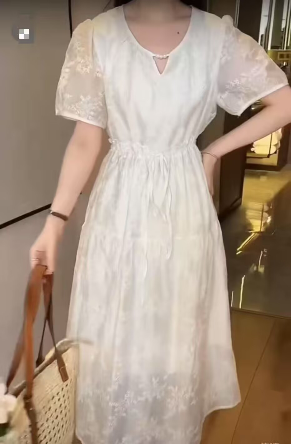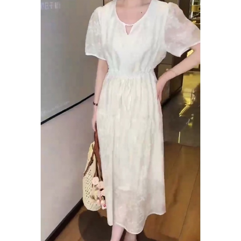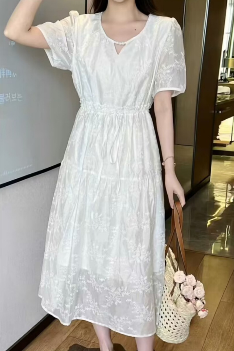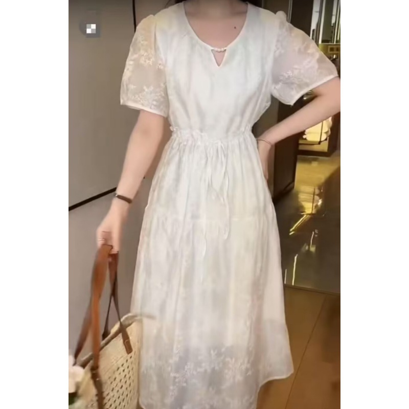 고급 프렌치 레이스 업 허리 원피스 여성용 여름 25 새로운 느슨한 슬리밍 퍼프 슬리브 크루 넥 미드 길이 원피스