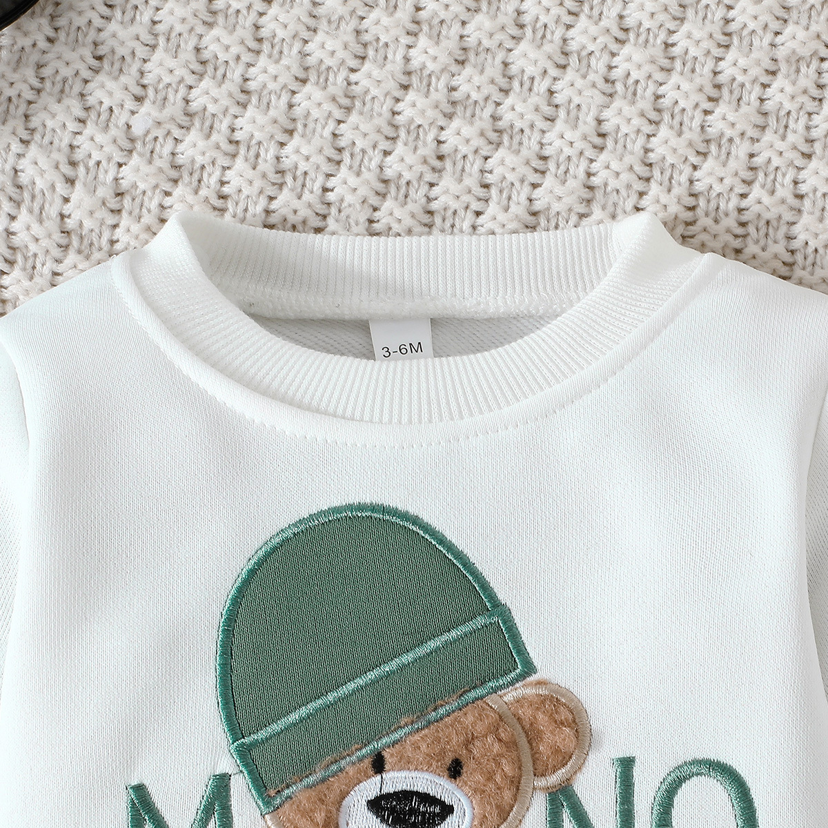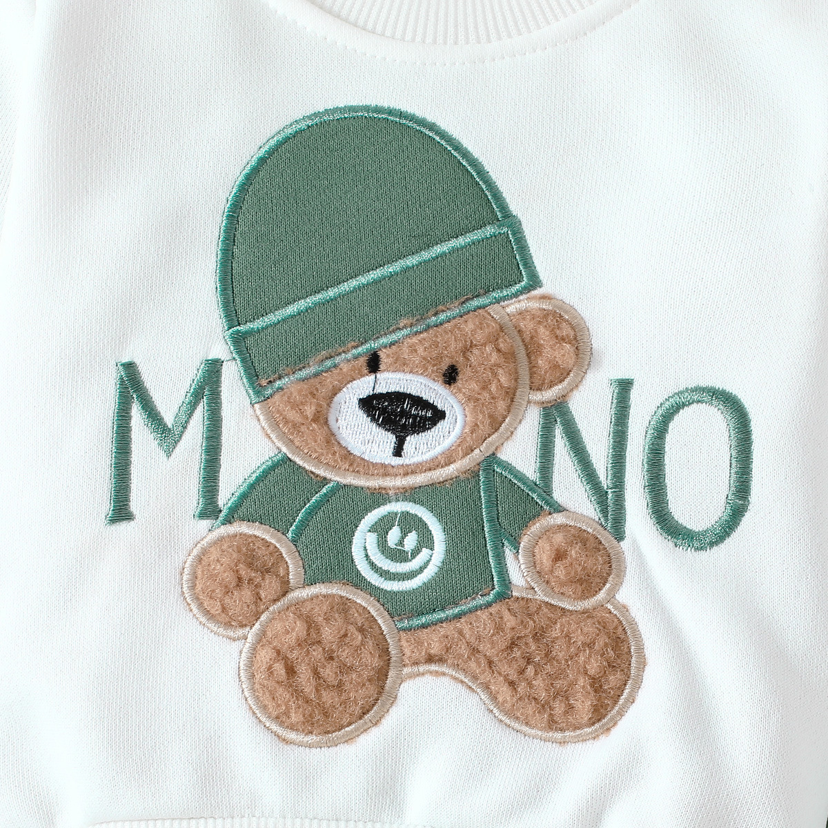2025 국경 간 대외 무역 아동 의류 가을, 겨울 새로운 만화 편지 모자 곰 수 놓은 스웨트 셔츠와 바지 투피스 세트스토어 가기