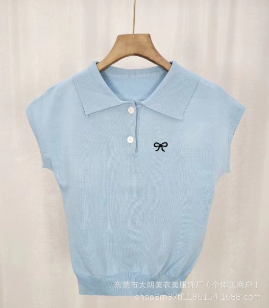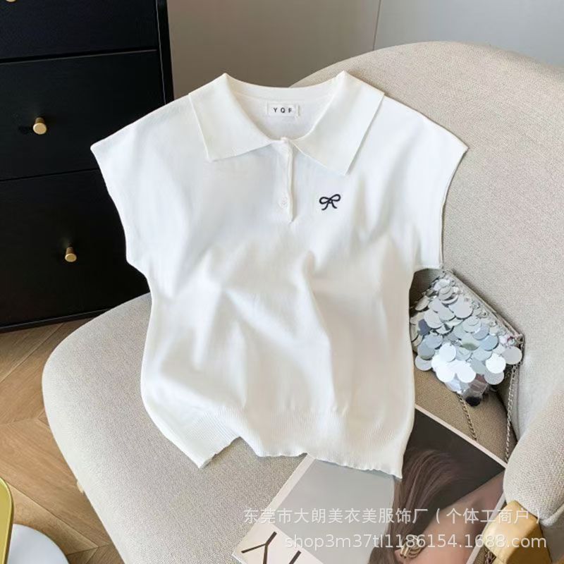 자수 Bowknot 프레피 스타일 프렌치 폴로 칼라 반팔 니트 여성 탑 여름 연령 감소 다목적 얼음 실크스토어 가기