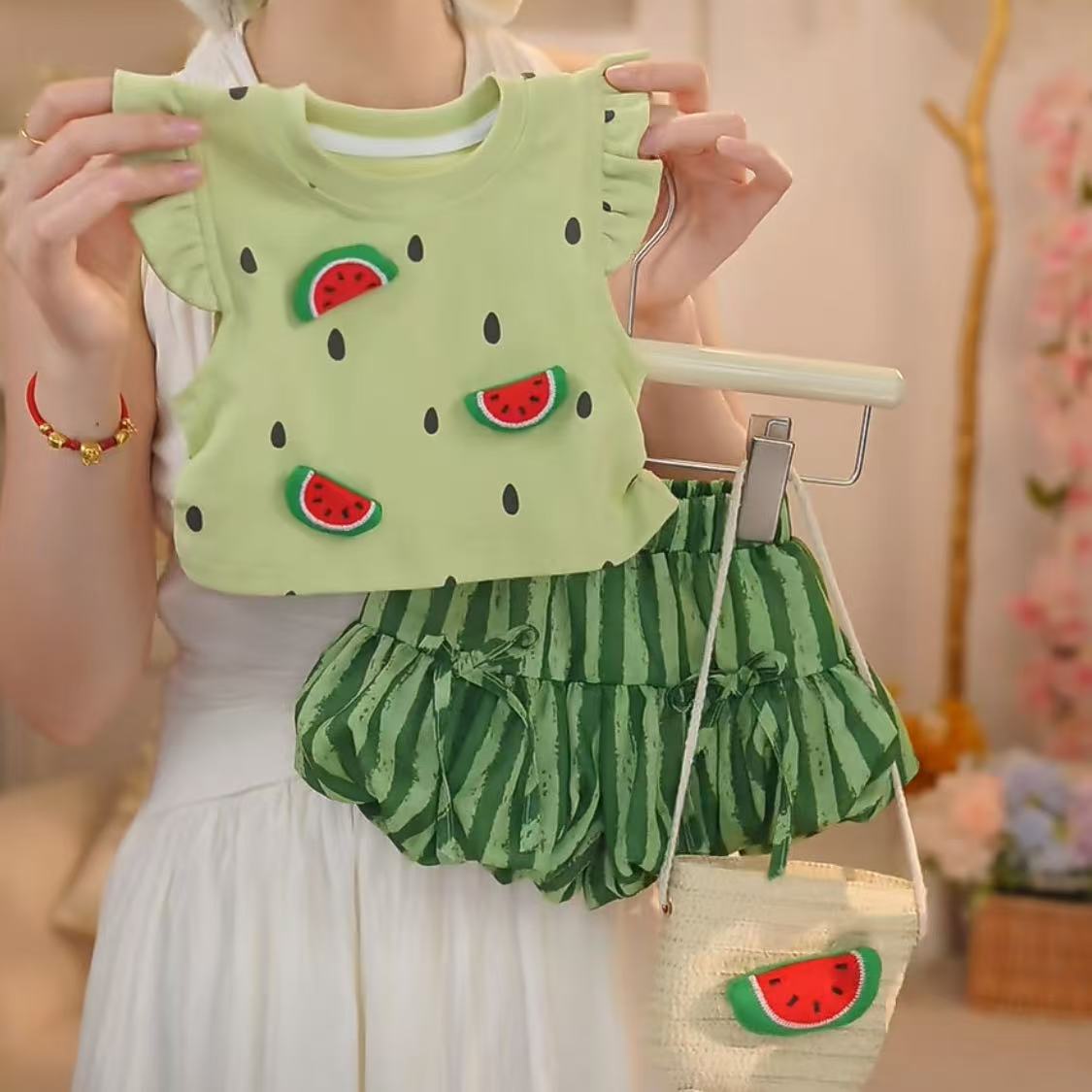 [핑크 집] 여름 새 소녀 아동복 세트 민트 그린 귀여운 달콤한 시원한 3 차원 수박 세트
