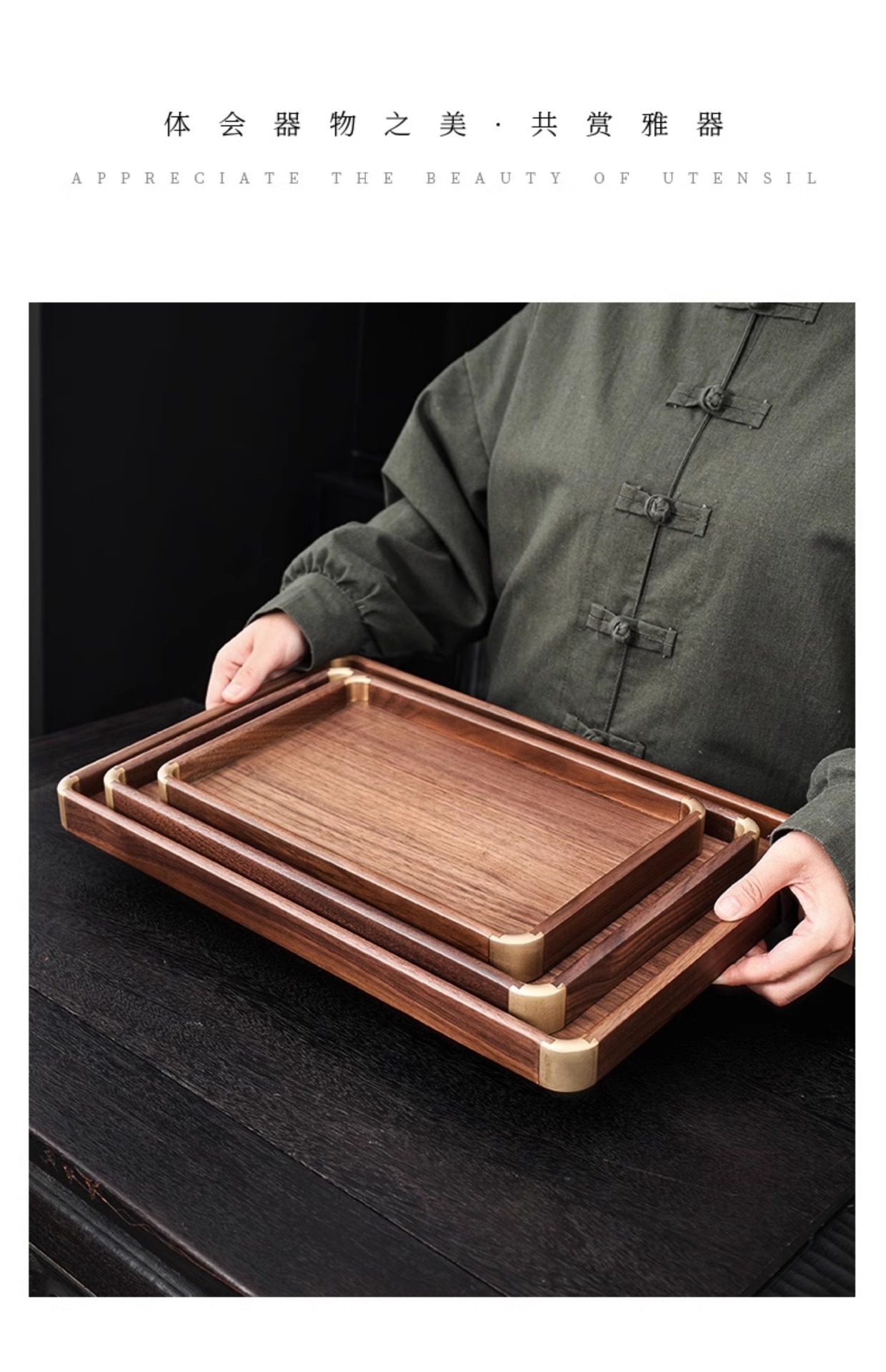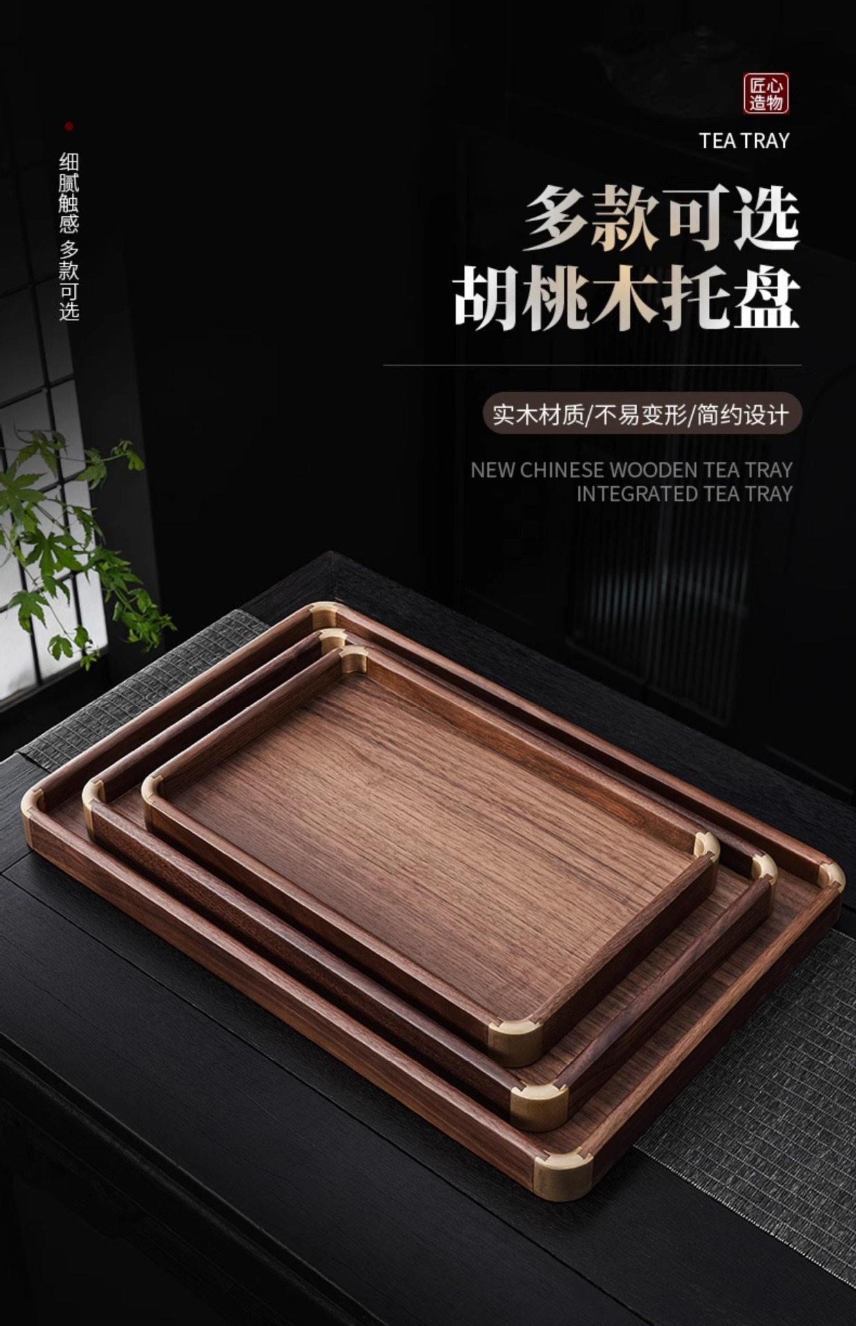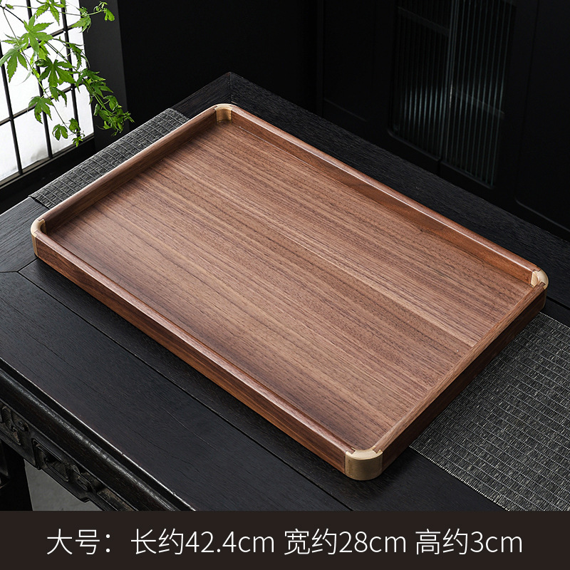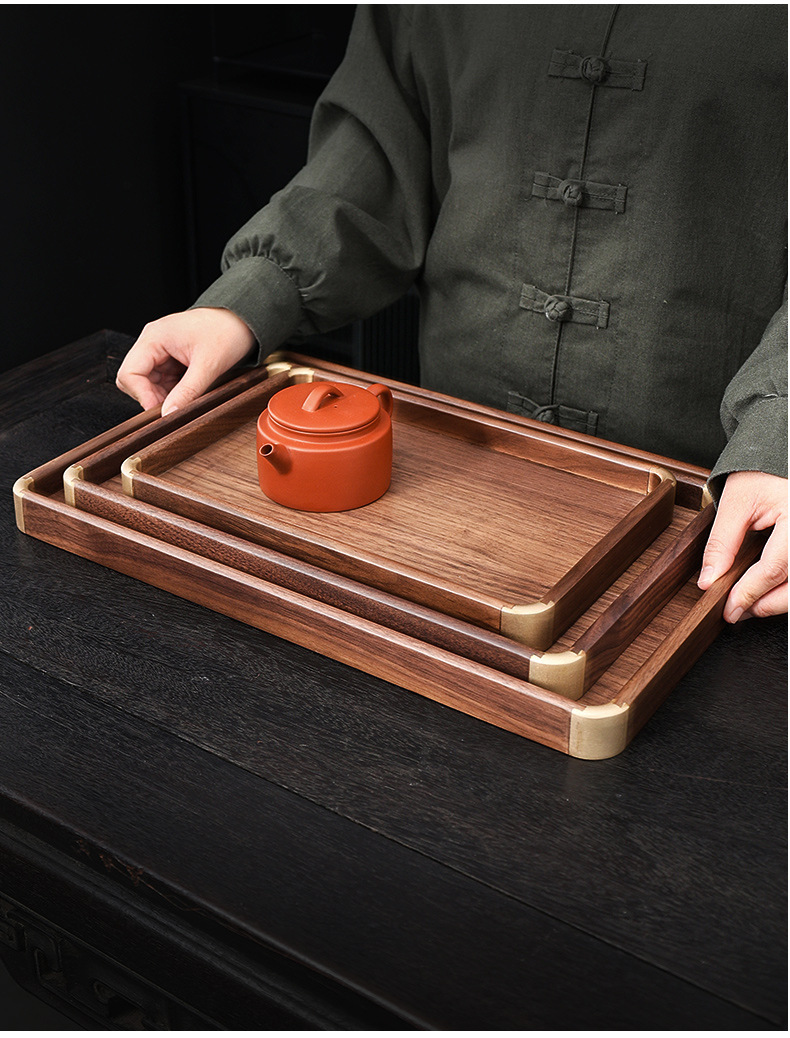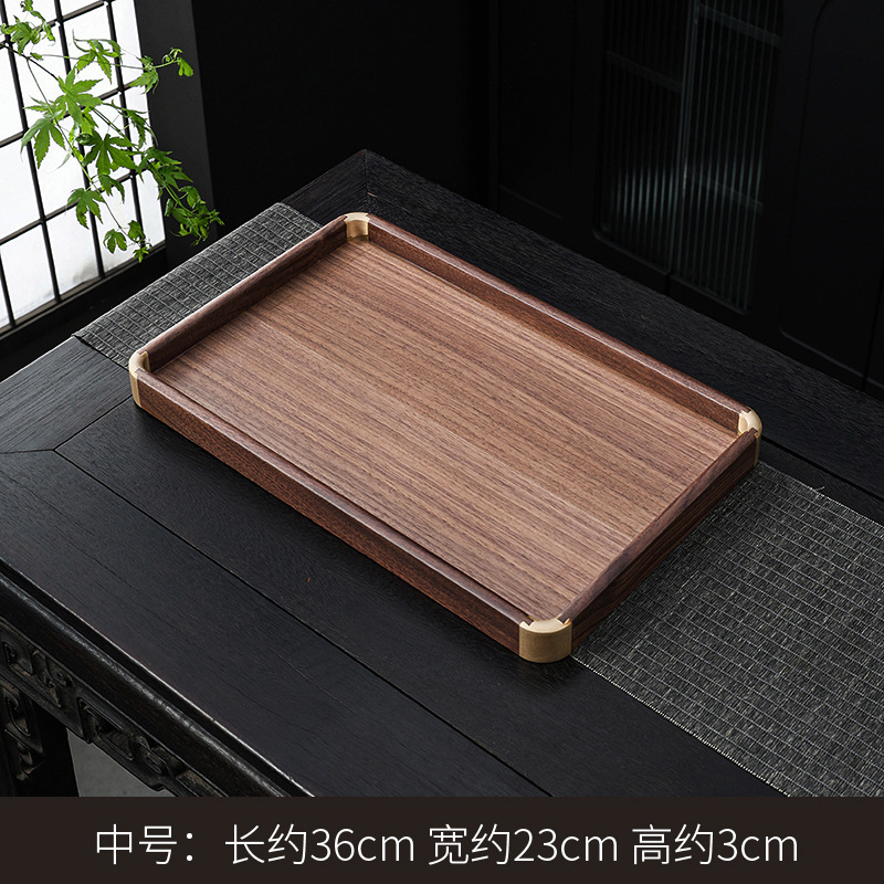 천연 북미 호두나무 차 트레이, 나무 트레이, 가정용 직사각형 수납 트레이, 구리 코너 상감 트레이, 트레이