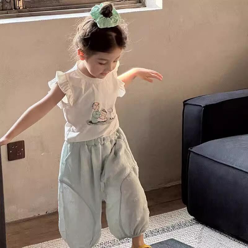시안 닝 일곱 여성의 보물 세트 여름 새로운 어린이 귀여운 레이스 만화 조끼 번들 발 안티 모기 바지 2 피스 유행 세트