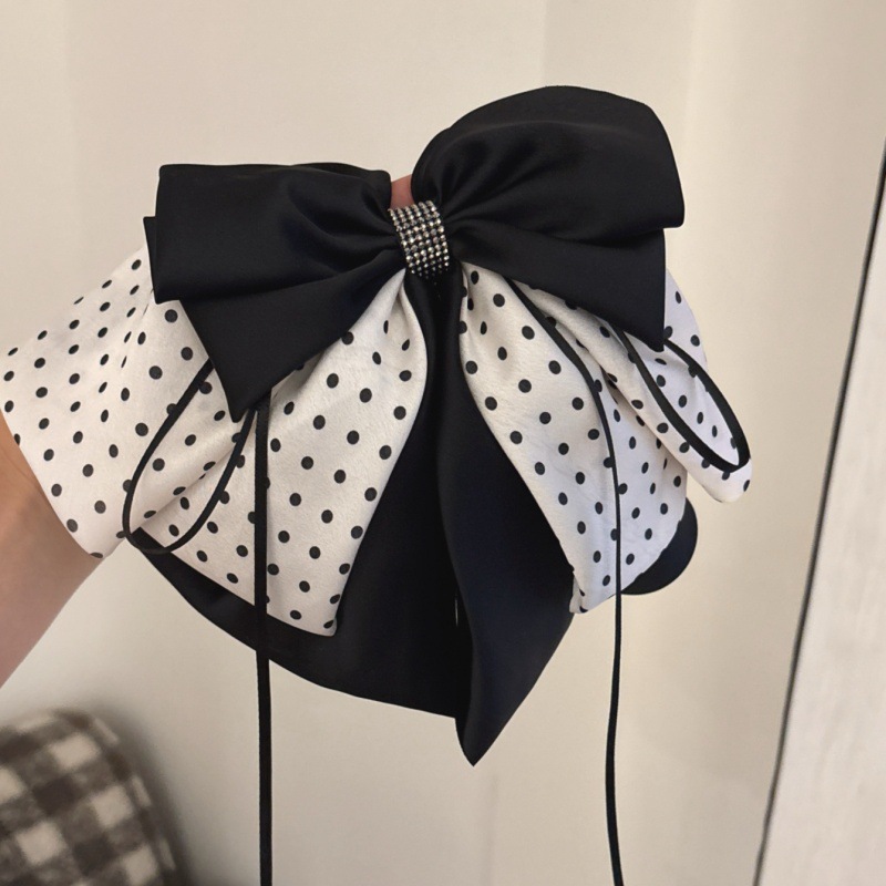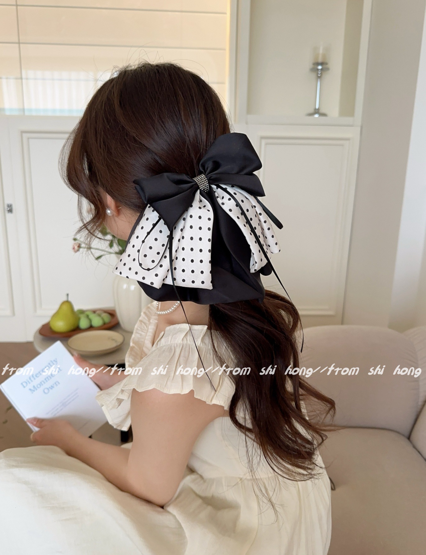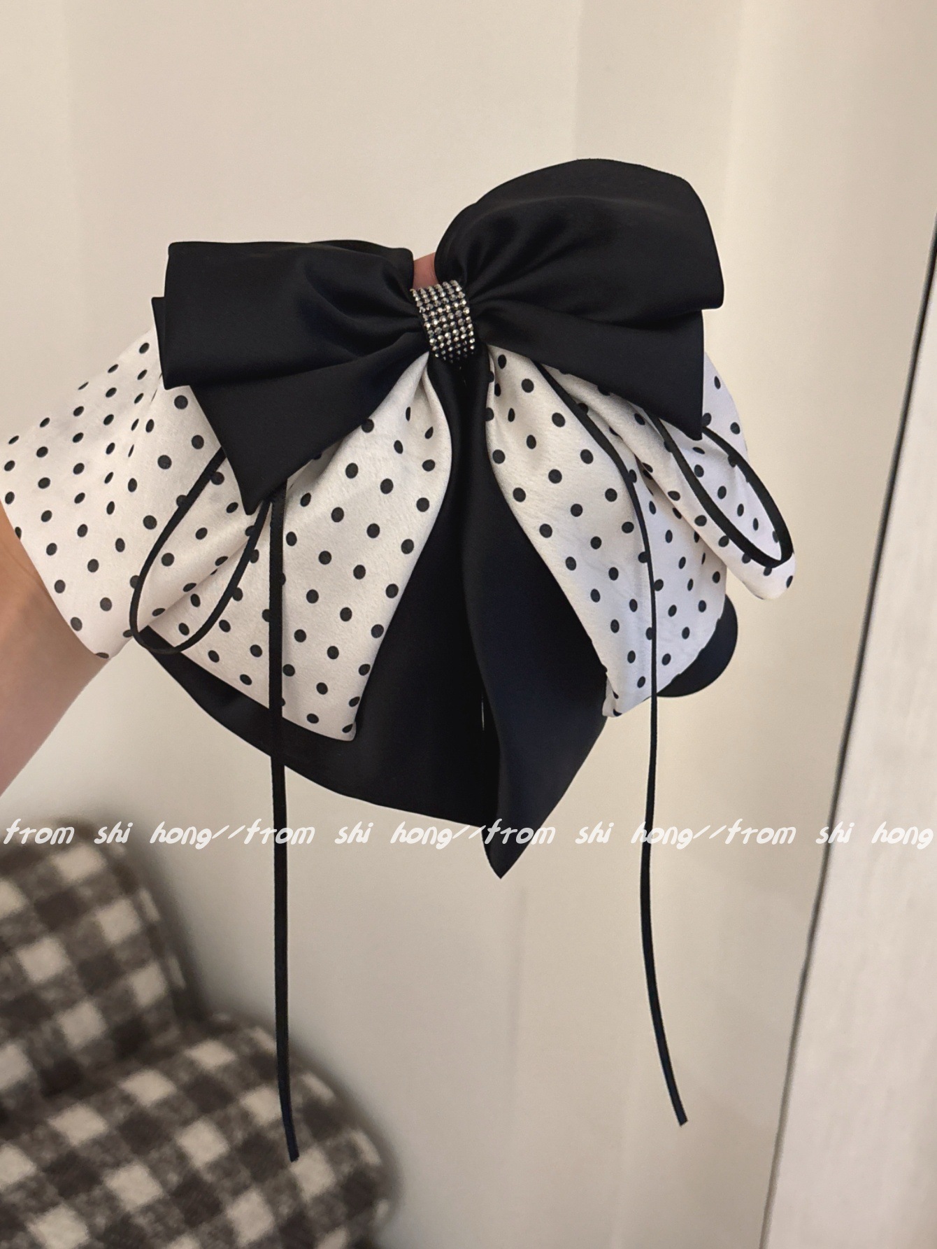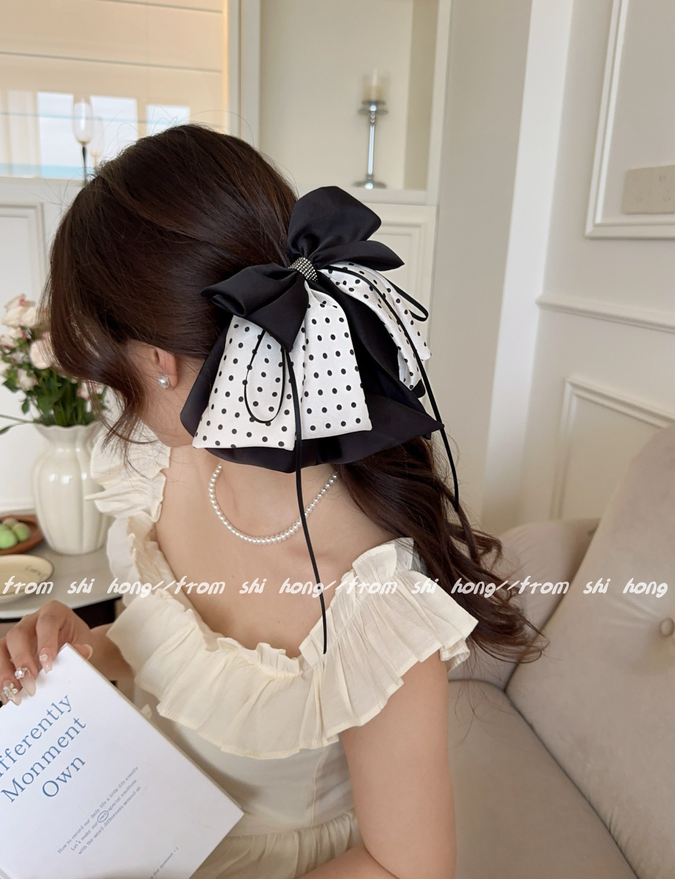 • 다이아몬드 포니테일 클립이 달린 흑백 폴카 도트 리본