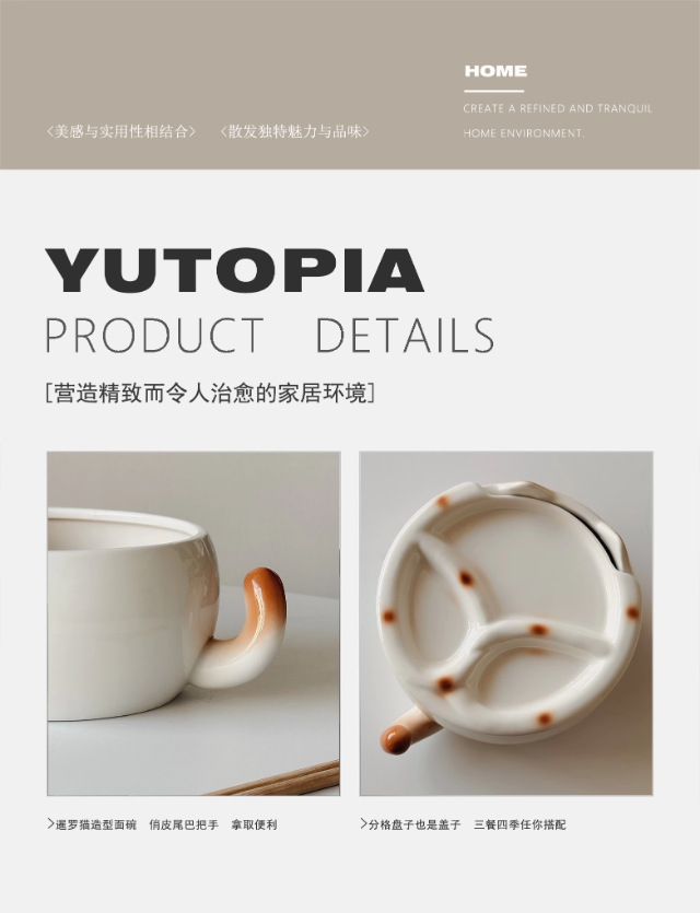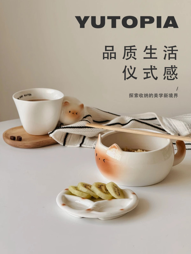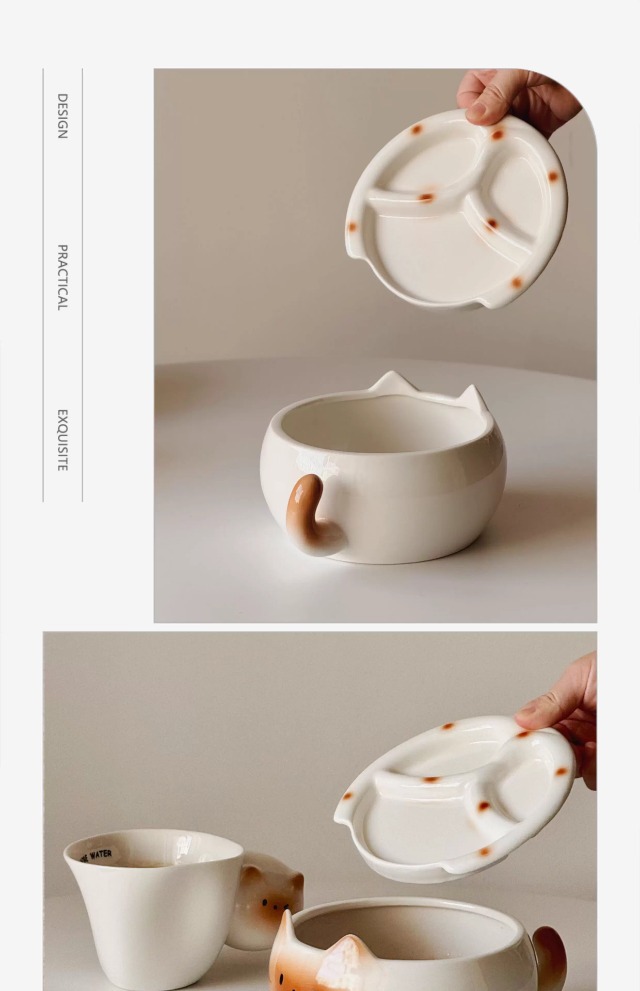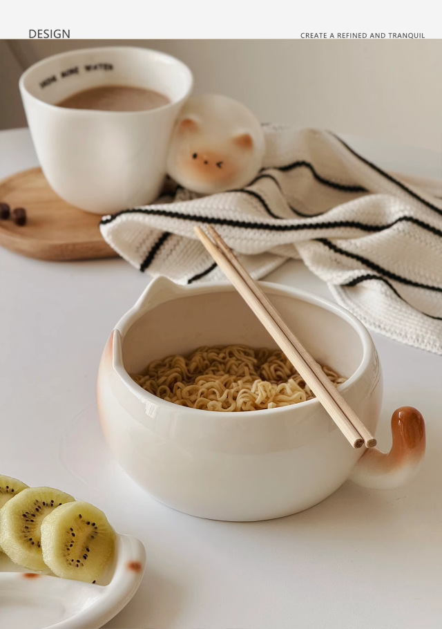 Yuxuan 귀여운 샴 고양이 인스턴트 국수 그릇 뚜껑이있는 샐러드 그릇 디핑 접시 홈 기숙사 세라믹 아침 식사 그릇 국수 그릇