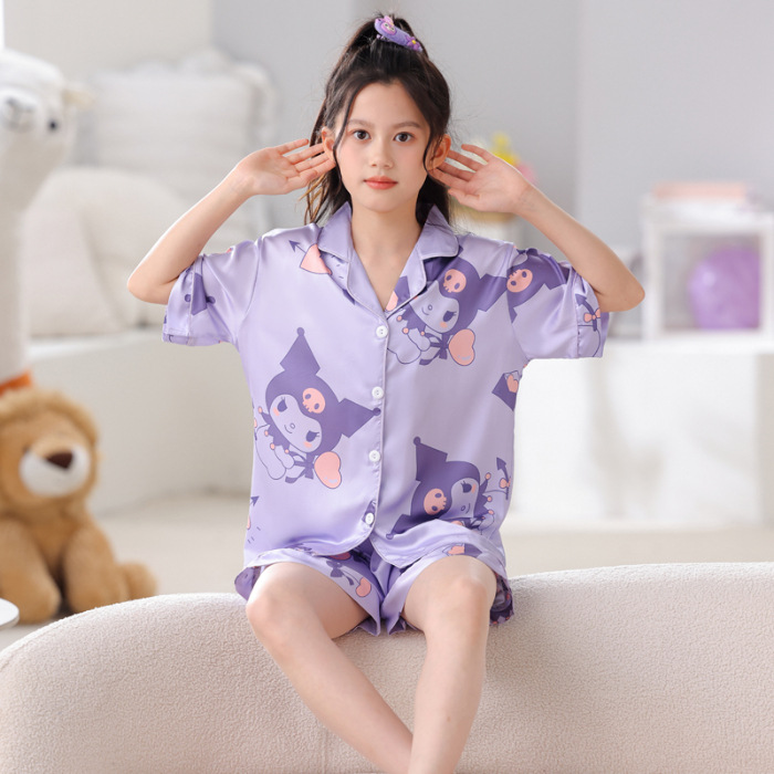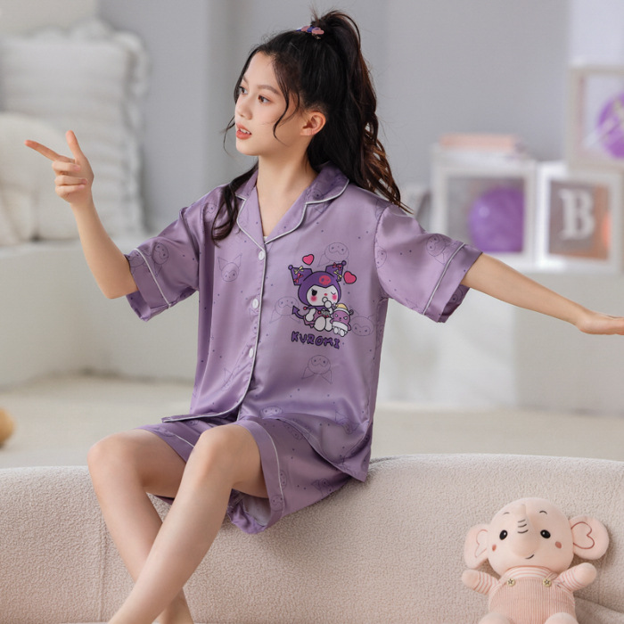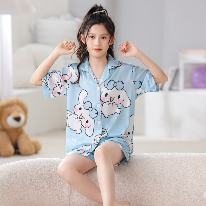 여자 잠옷 여름 얼음 실크 반팔 2025 새로운 여름 정장 어린이 어린 소녀 유행 큰 어린이 가정 의류